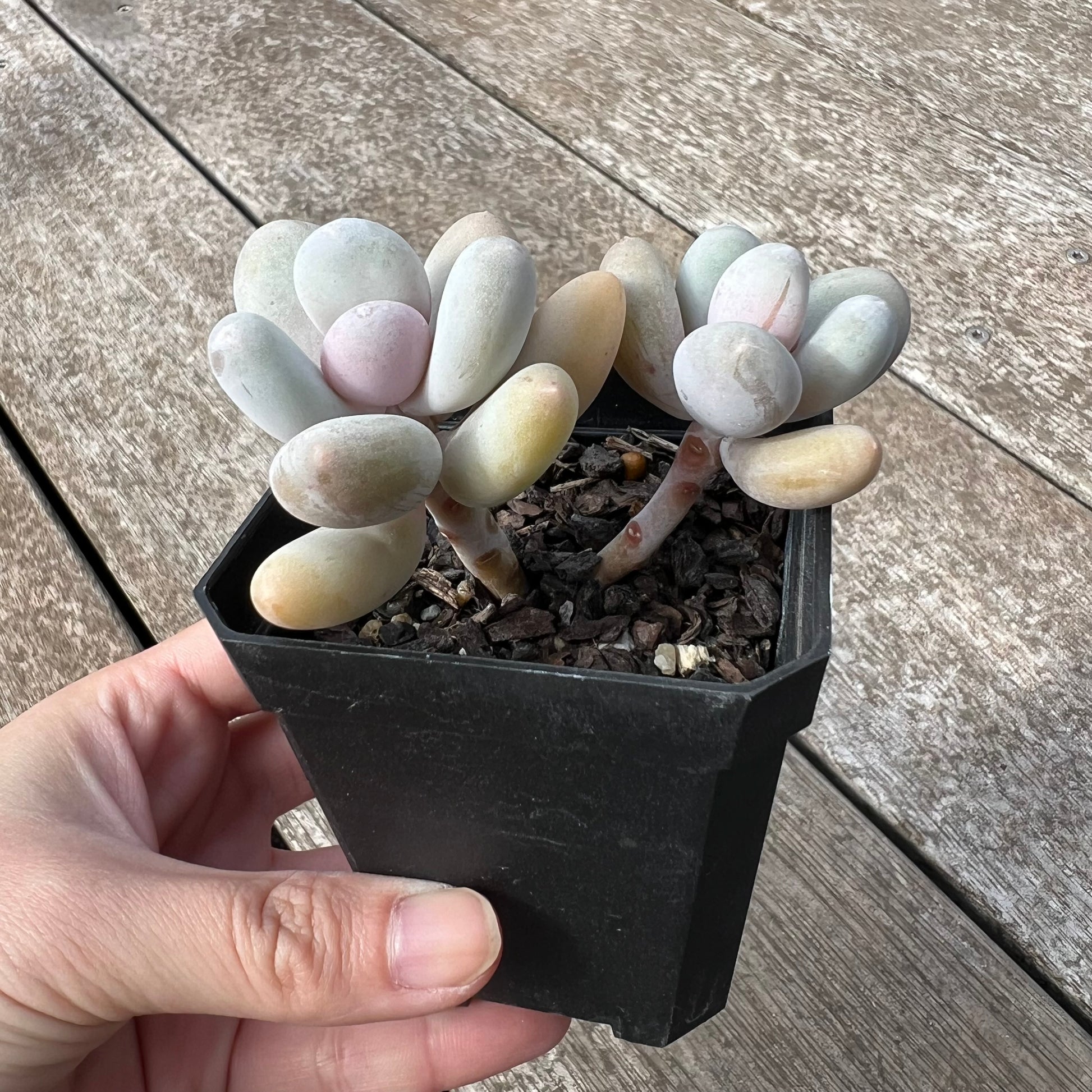 Pachyphytum orange Snowball is an extraordinary hybrid of Graptopetalum Amethystinum (lavender pebbles). Very popular just like their parents. Prefers full sun.