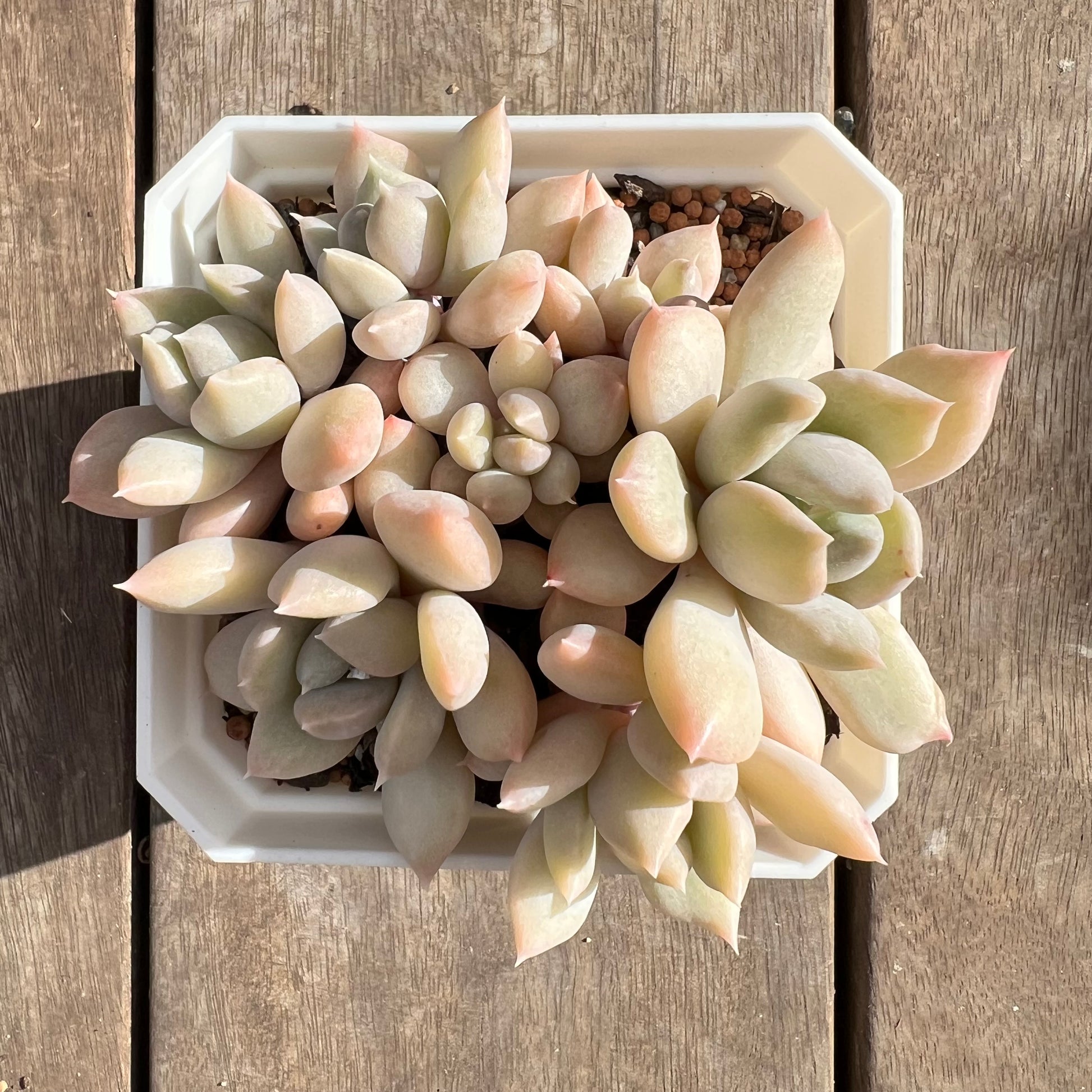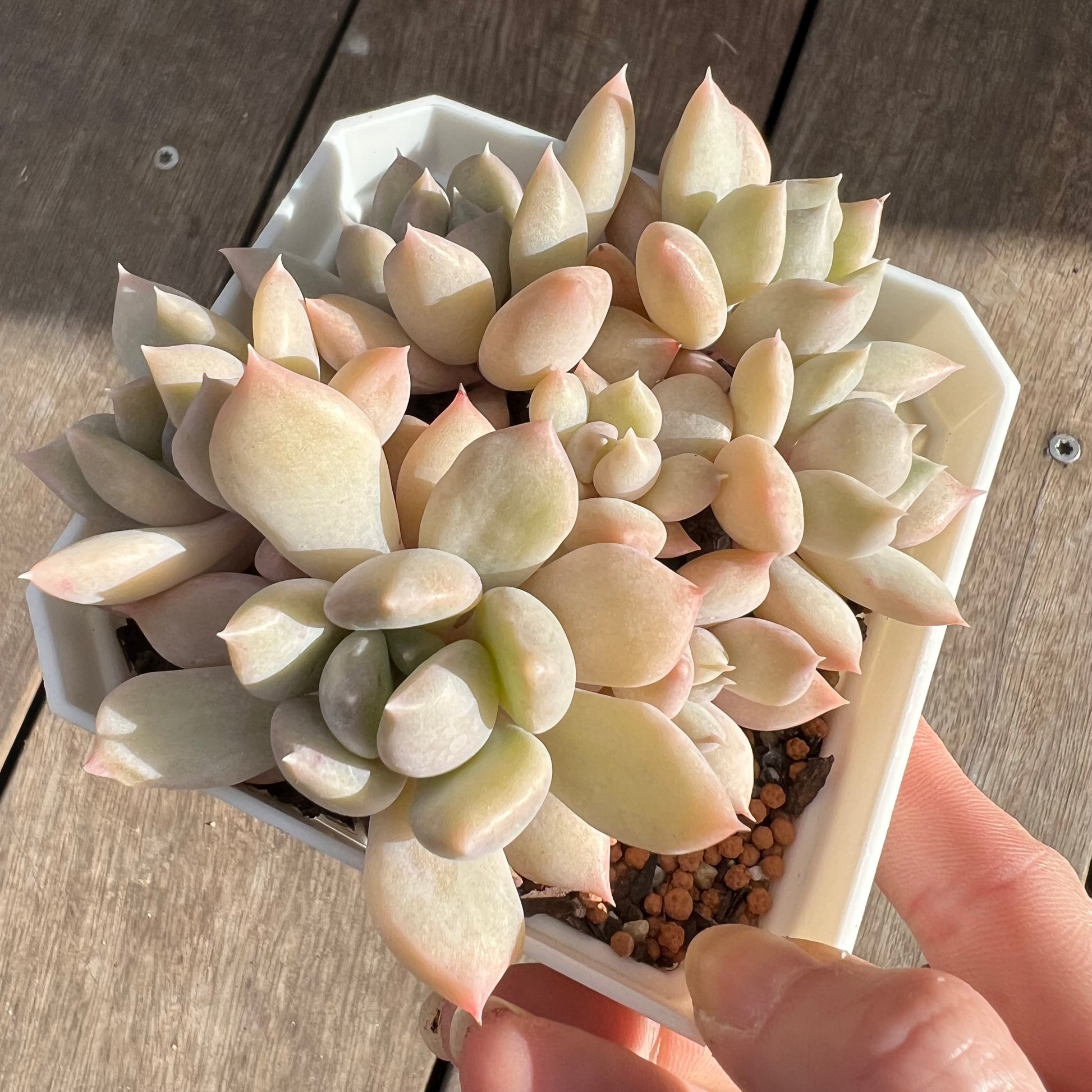 Echeveria machete is a slightly monstrosed variety. It has pale grey/white leaves. Some leaves are narrow and pointy and some are round. Some leaves have uneven edges or grooves and some appears to be normal. Prefers full sun.
