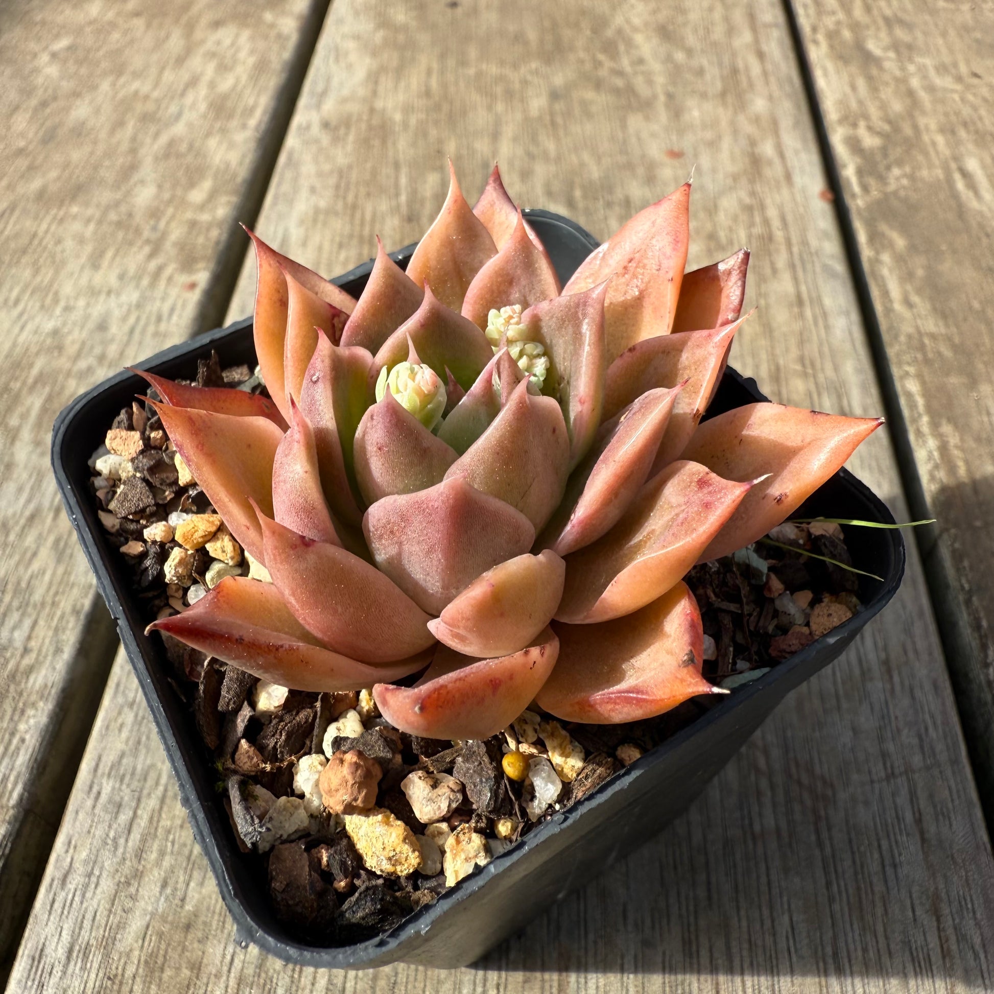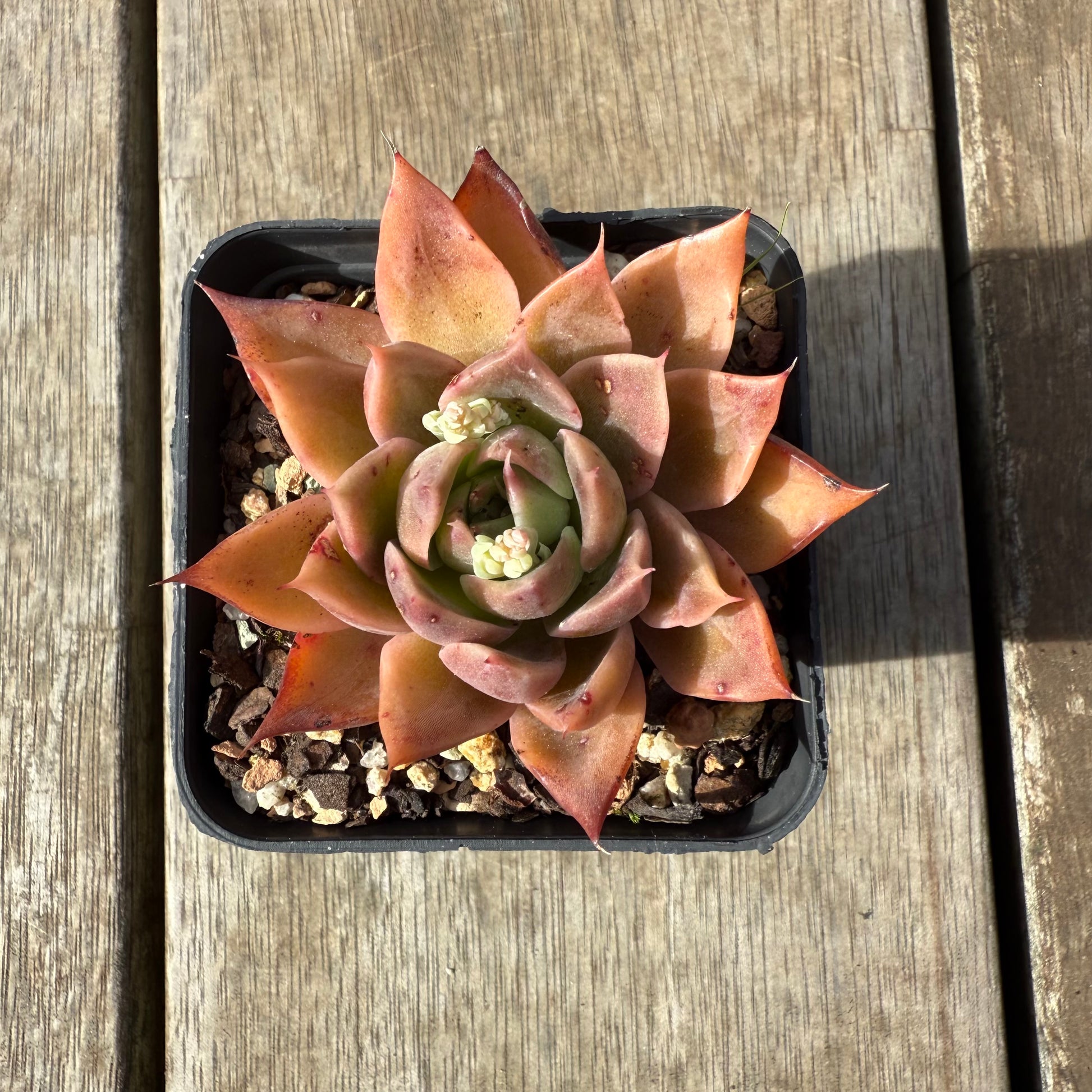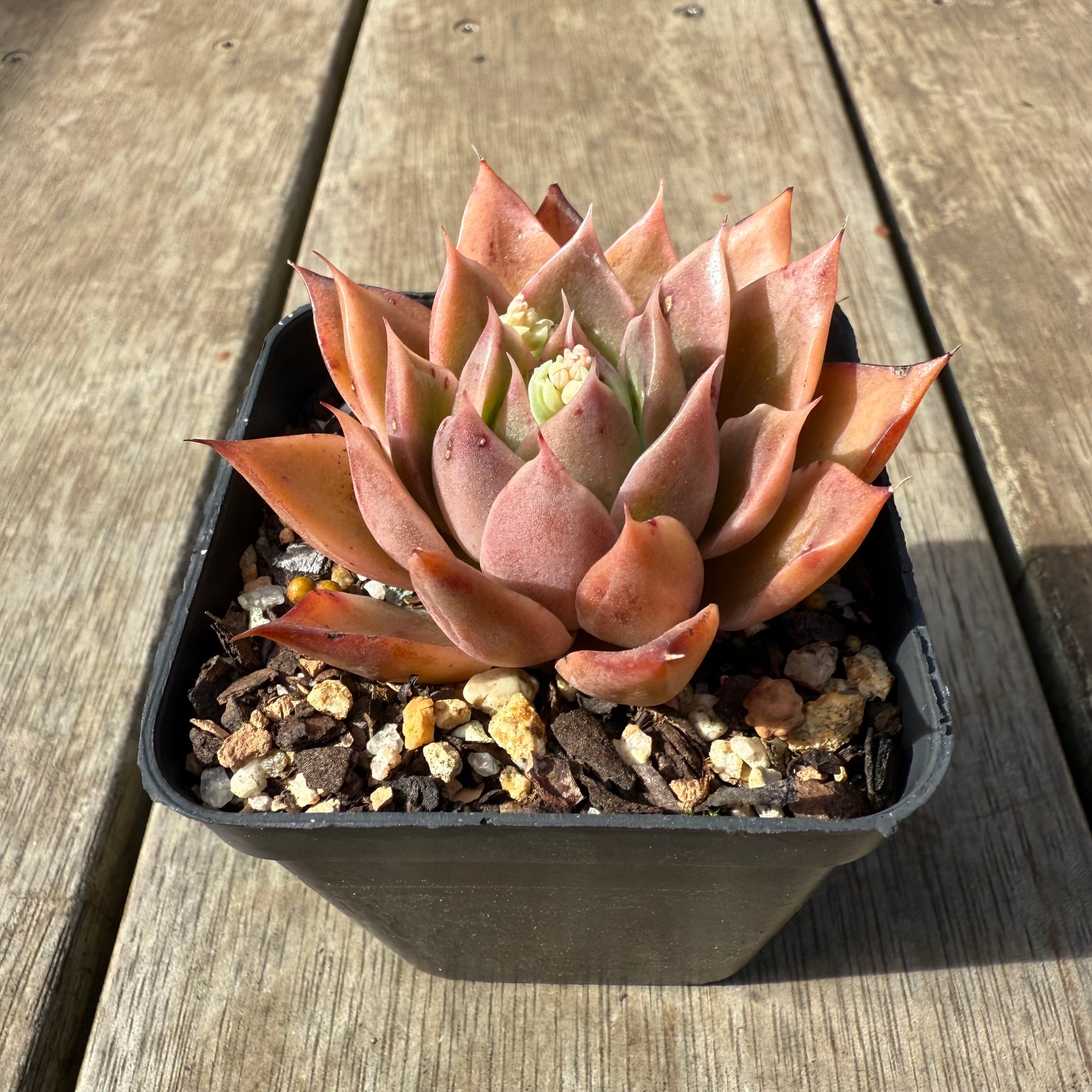 This is a new hybrid of Agavoides. It has waxy orange leaves, stress to orange/dark red. Prefers full/partial sun.