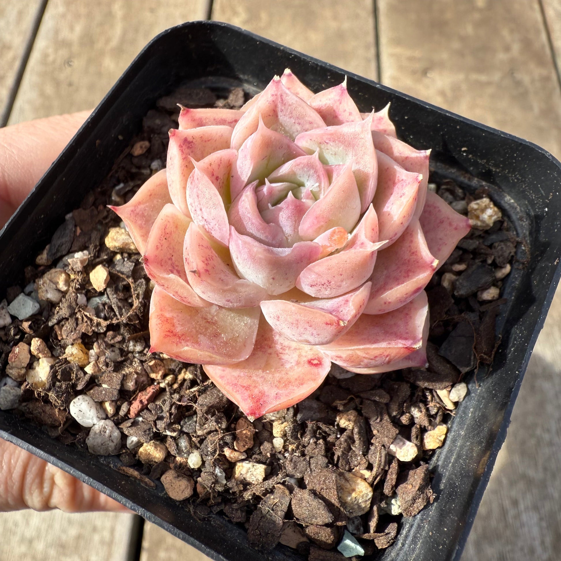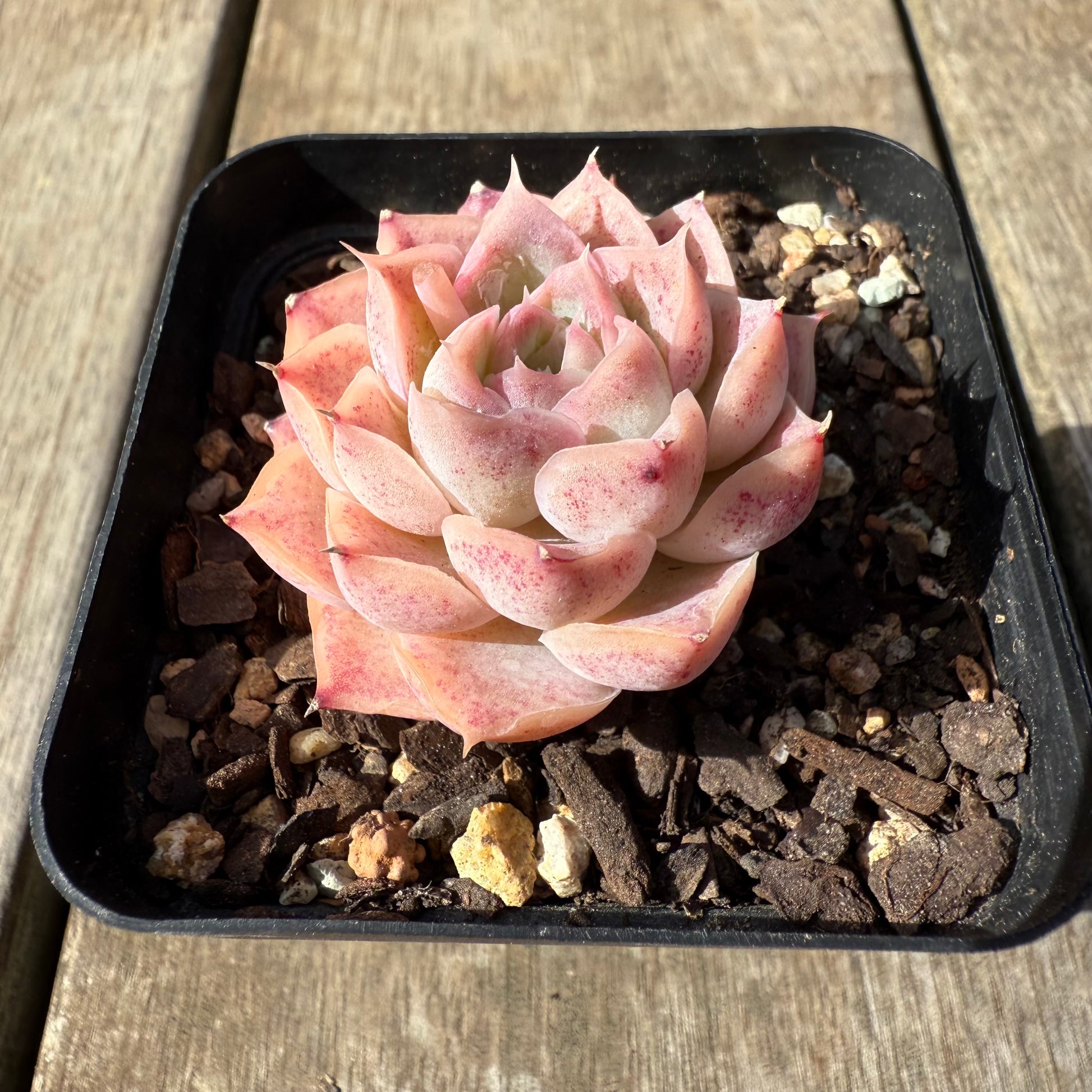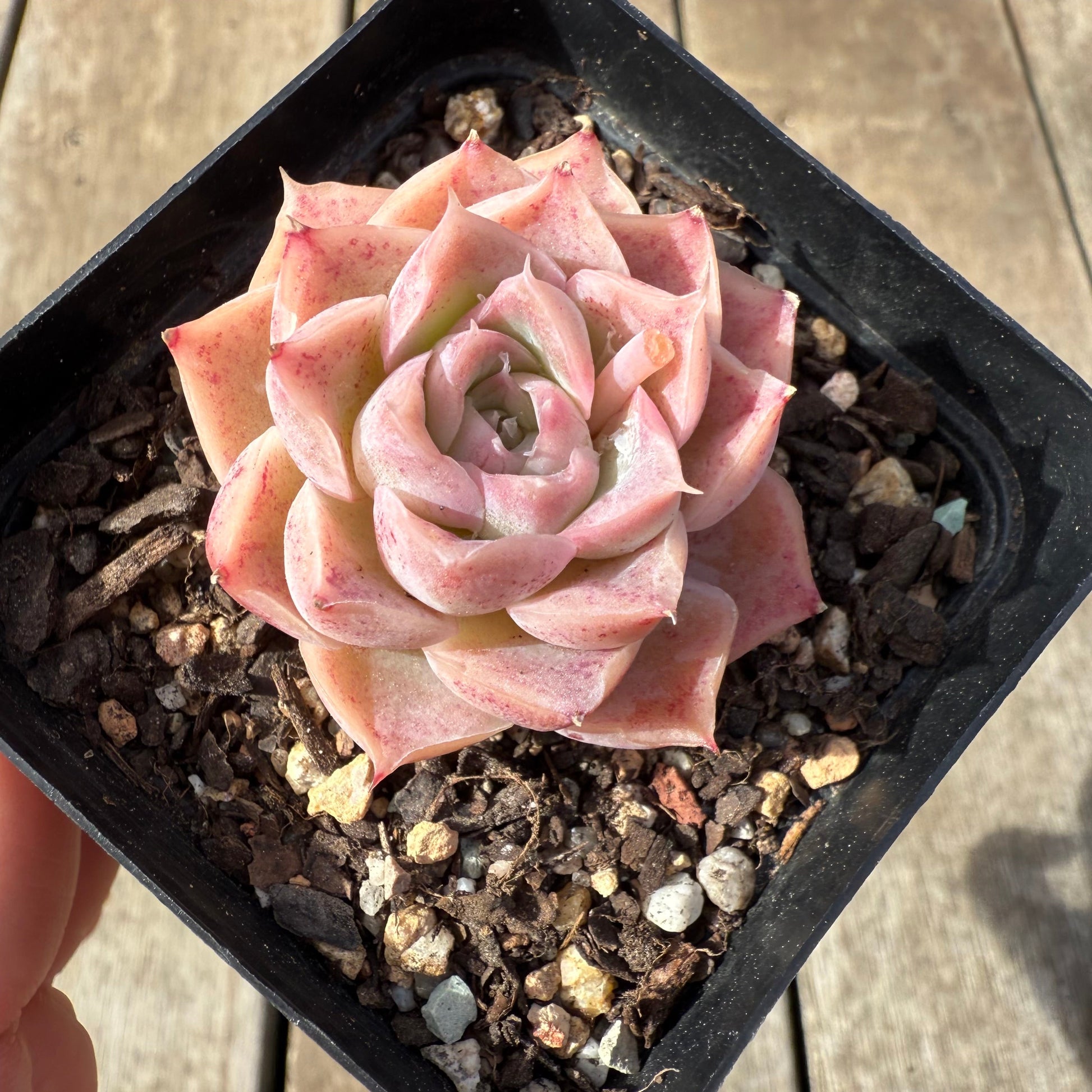 This is a hybrid of E.Hyalina created by us. It forms red speckles on its outer leaves and pink/purple centre. Prefers full sun.