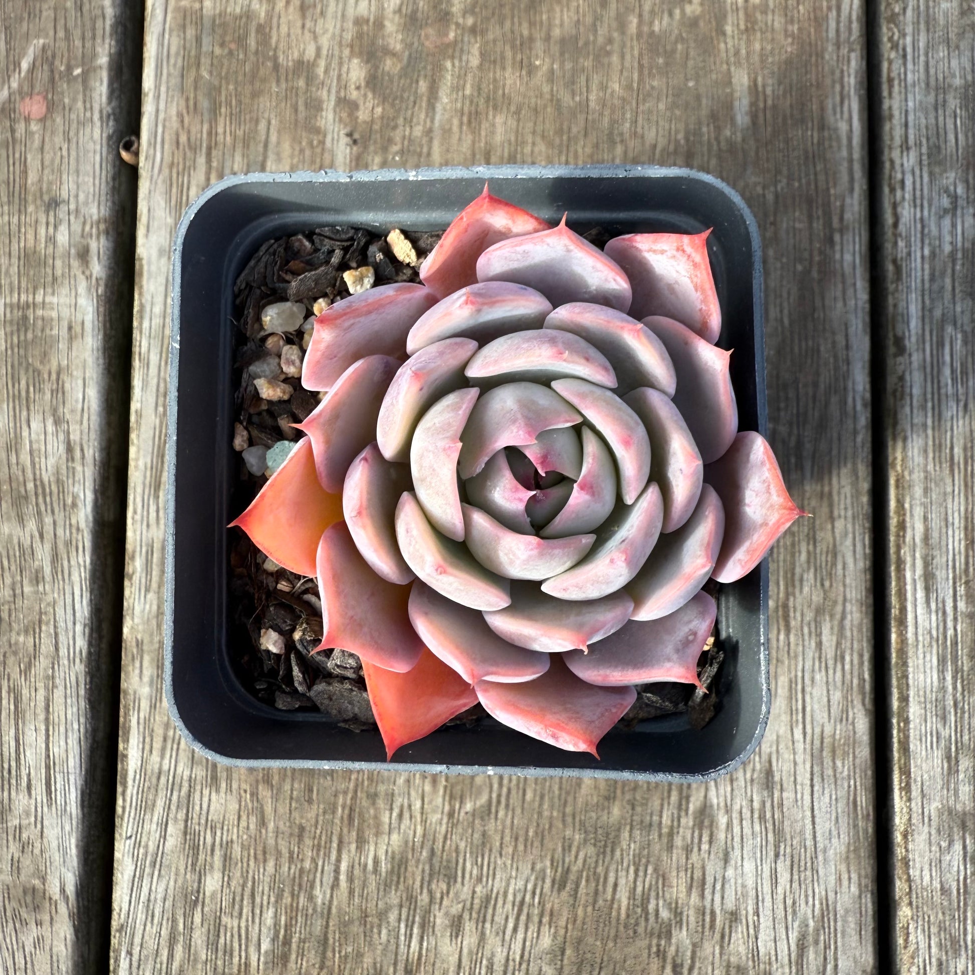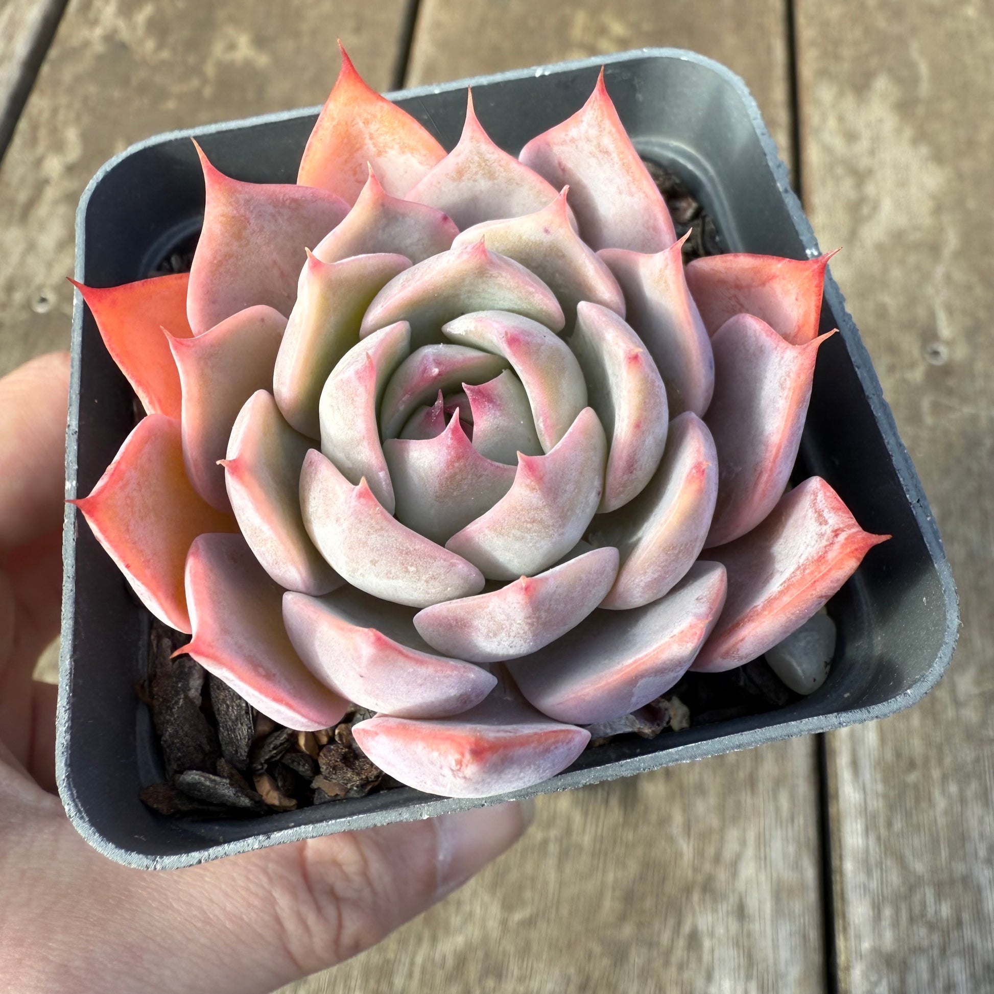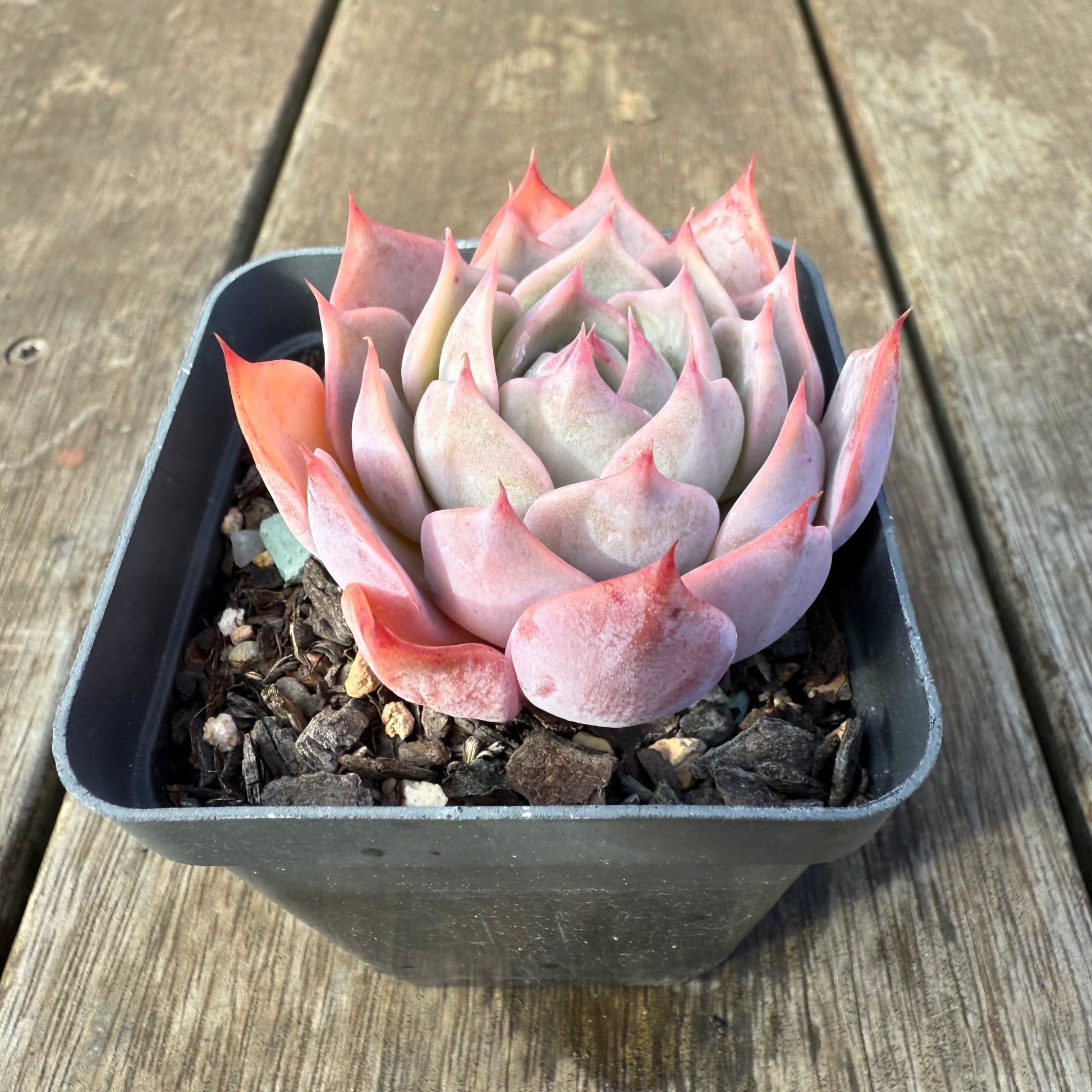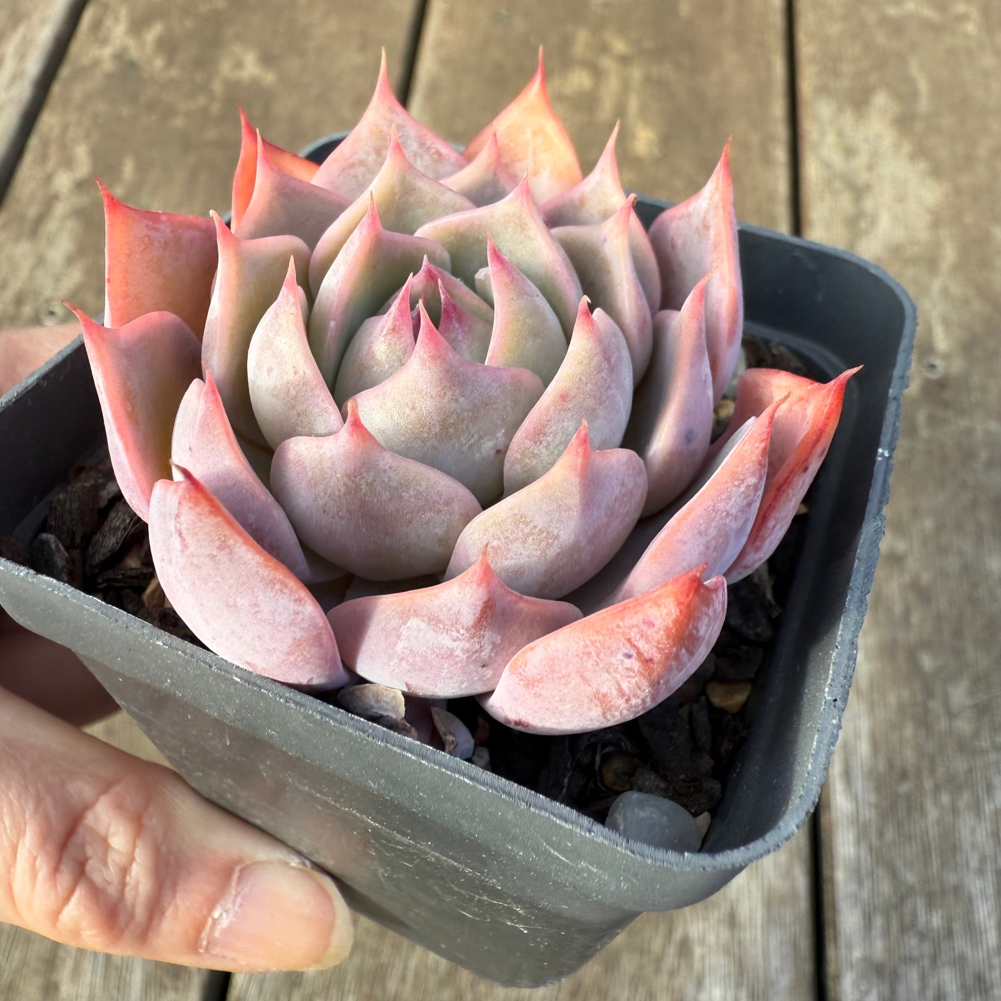 A beautiful hybrid of Echeveria Laulensis and E.Tuxpan. It has wide leaves and the tips are accentuated. Back of its leaves and its tips turn bright pink when stressed. Prefers full sun.