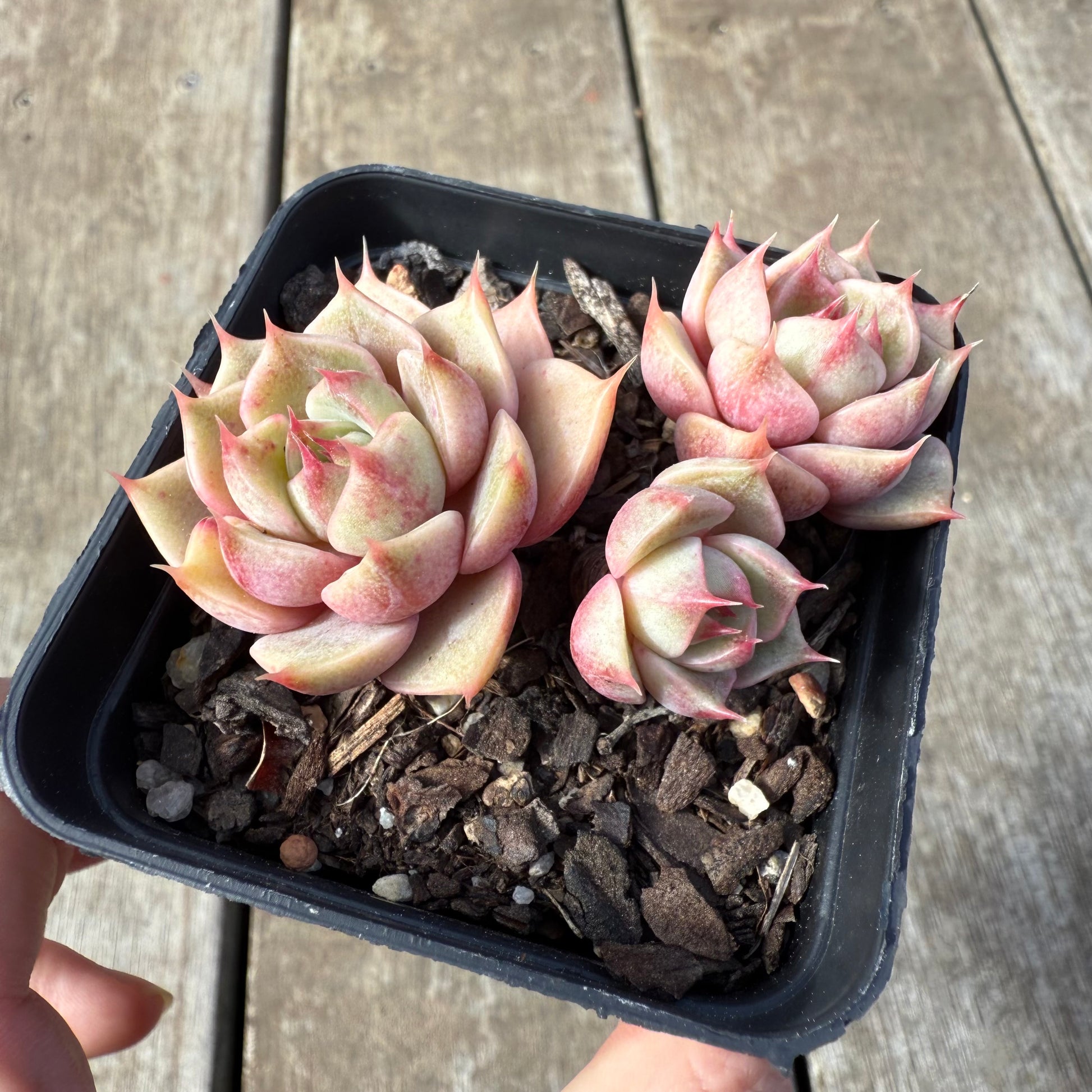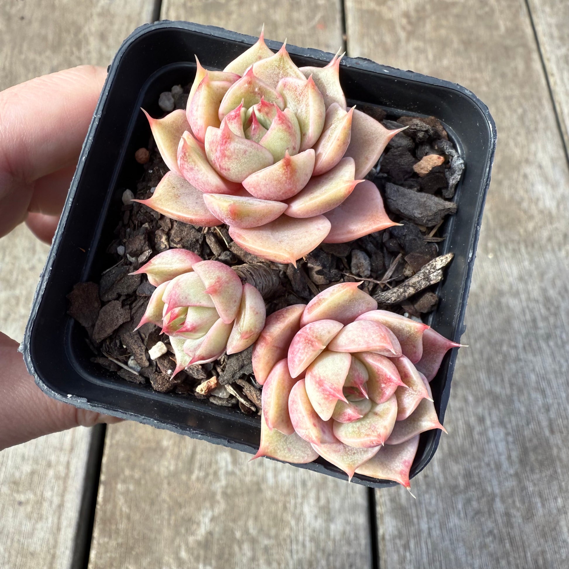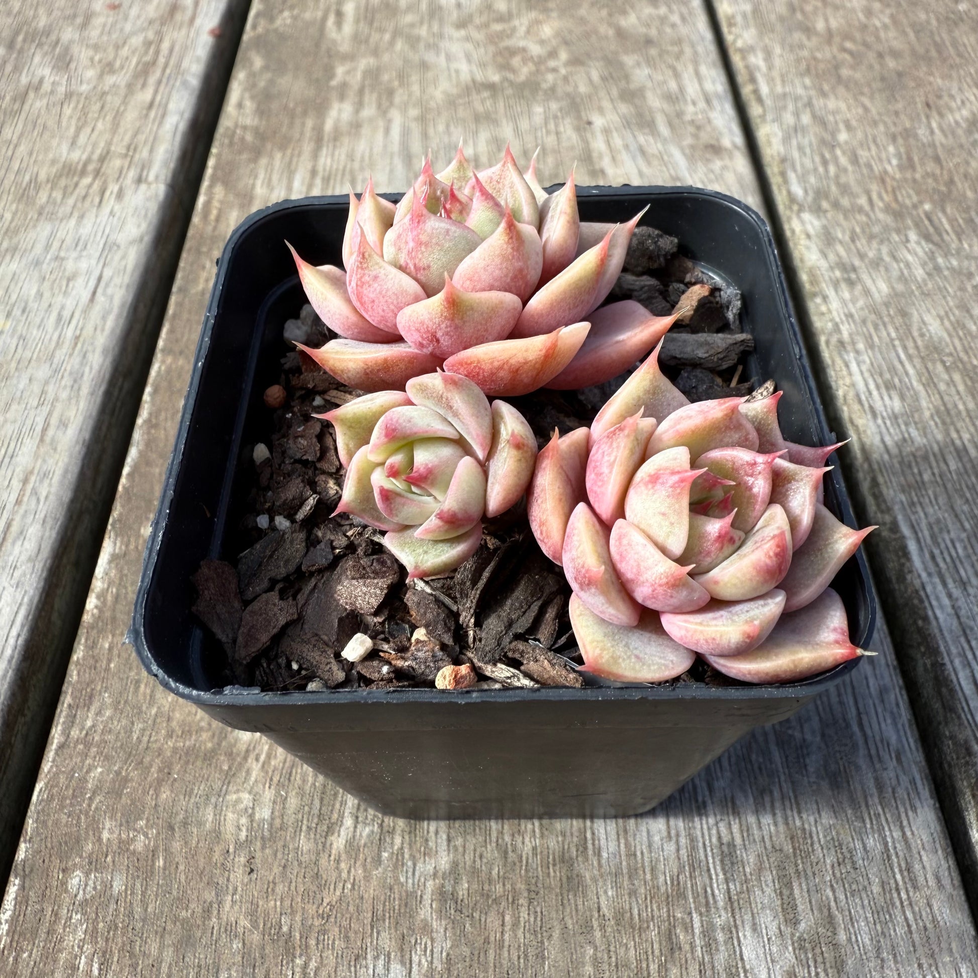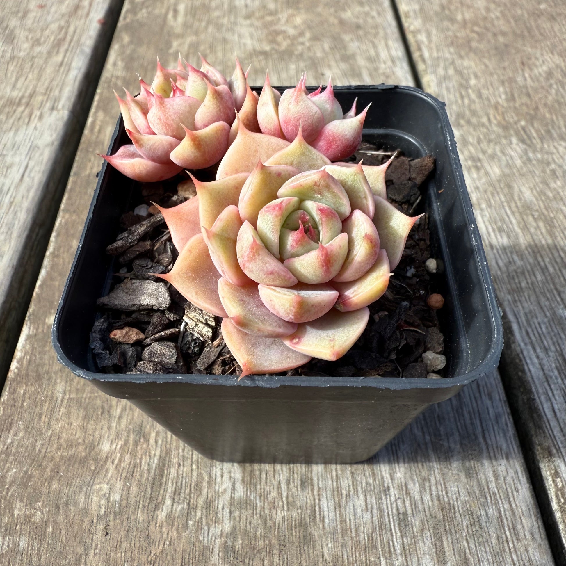 Echeveria 'Water Lily' is an attractive succulent with numerous light green to pale bluish-green leaves arranged in a dense rosette. The leaves are thick, elliptic, acuminate and with pointy tips flushed rich pink. Prefers full sun.