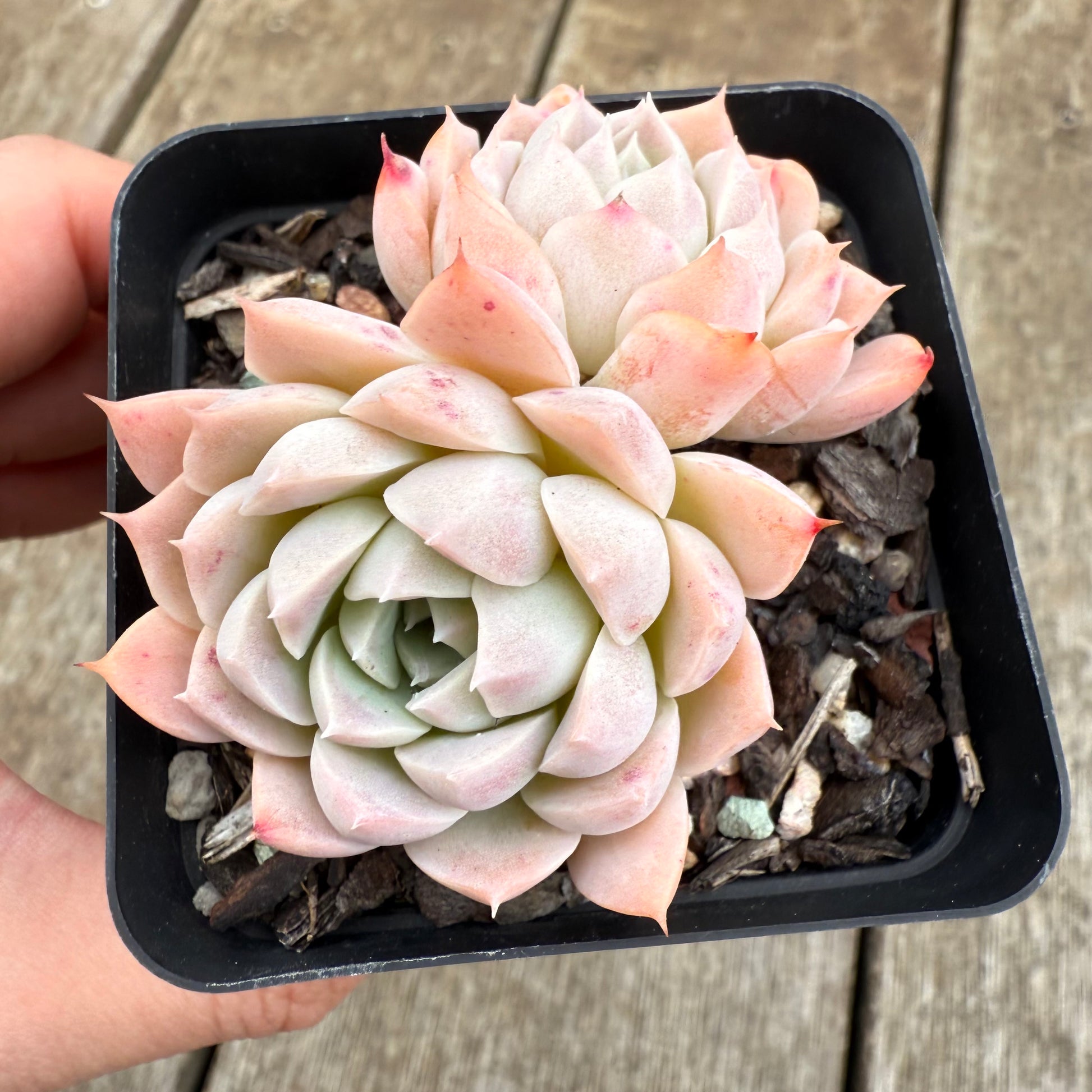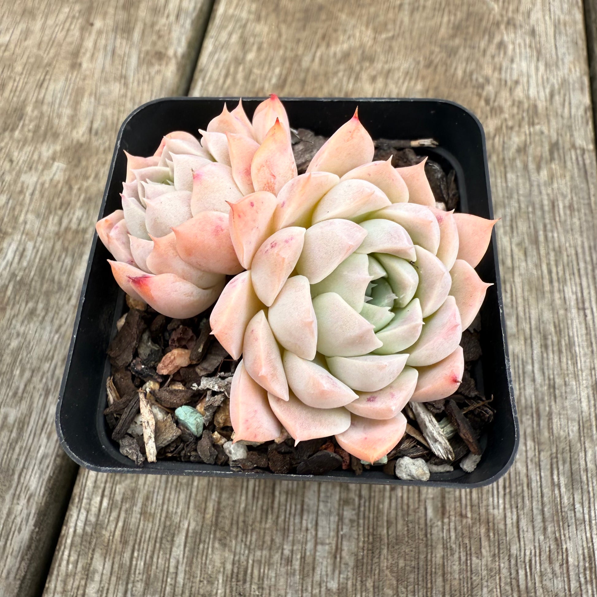 Echeveria Pink Rose has slightly powdered leaves that will stress to pink-orange. Prefers full sun.