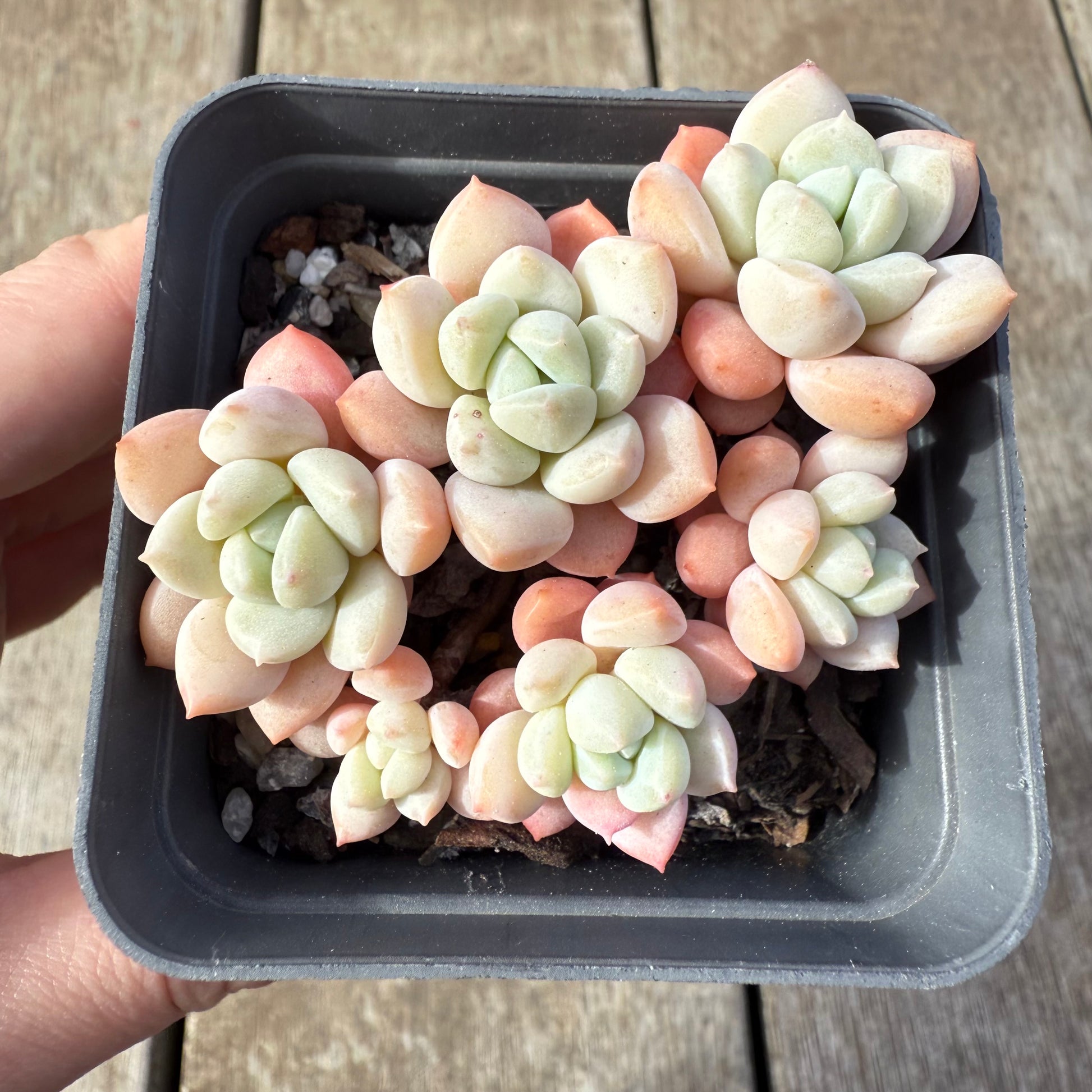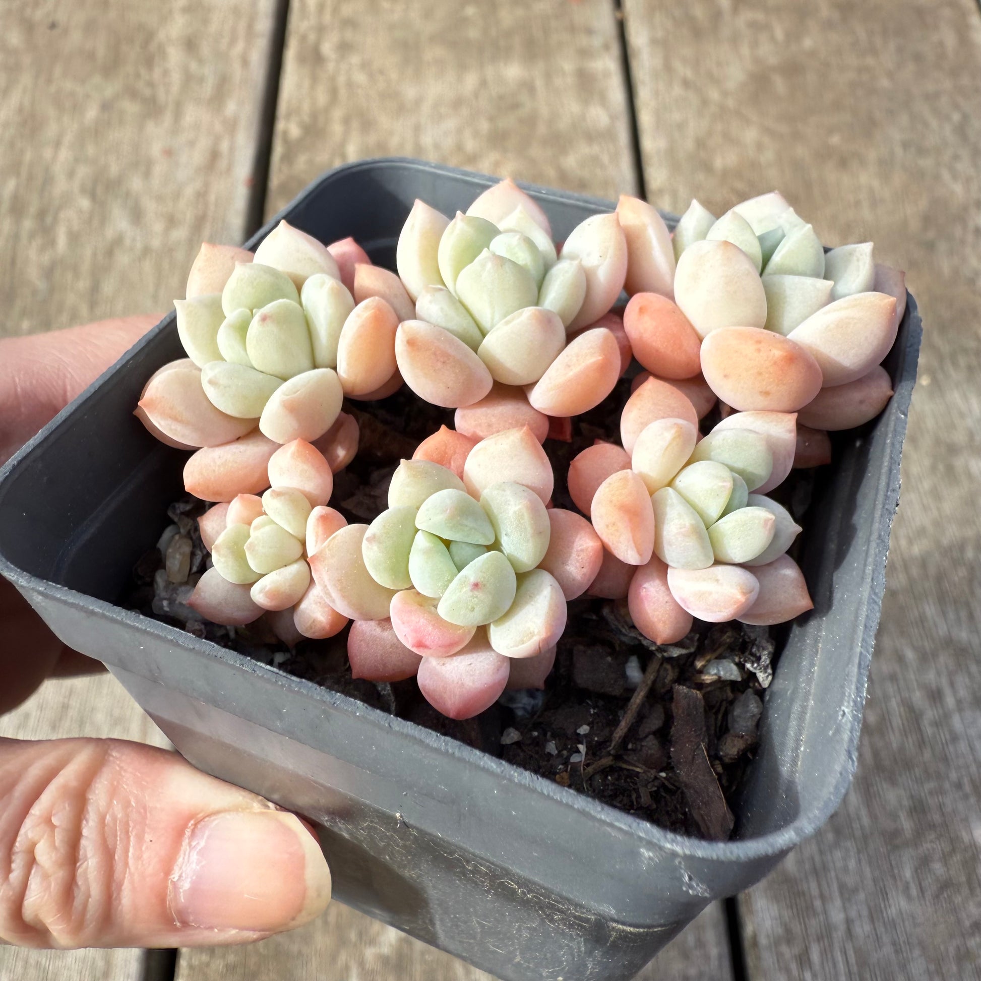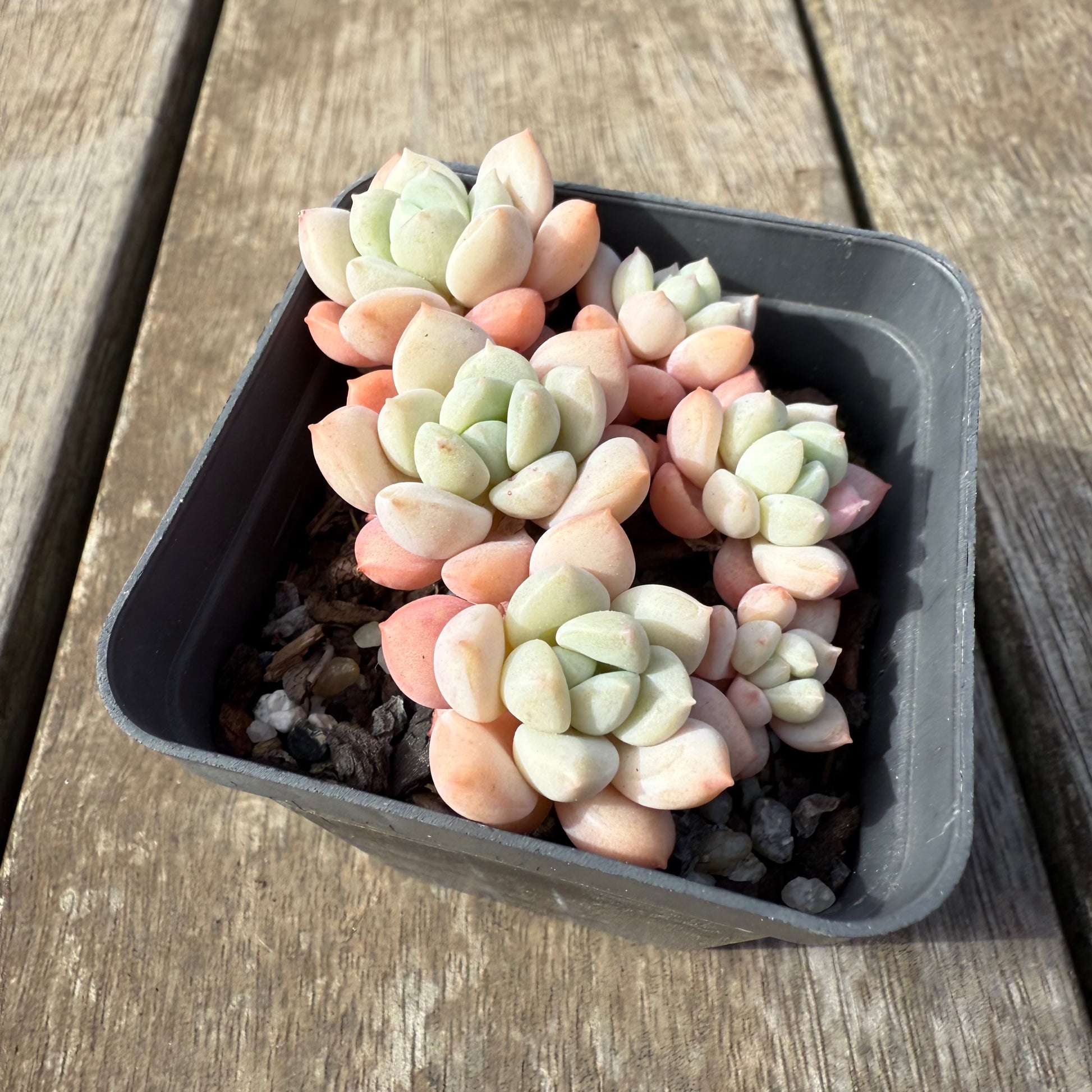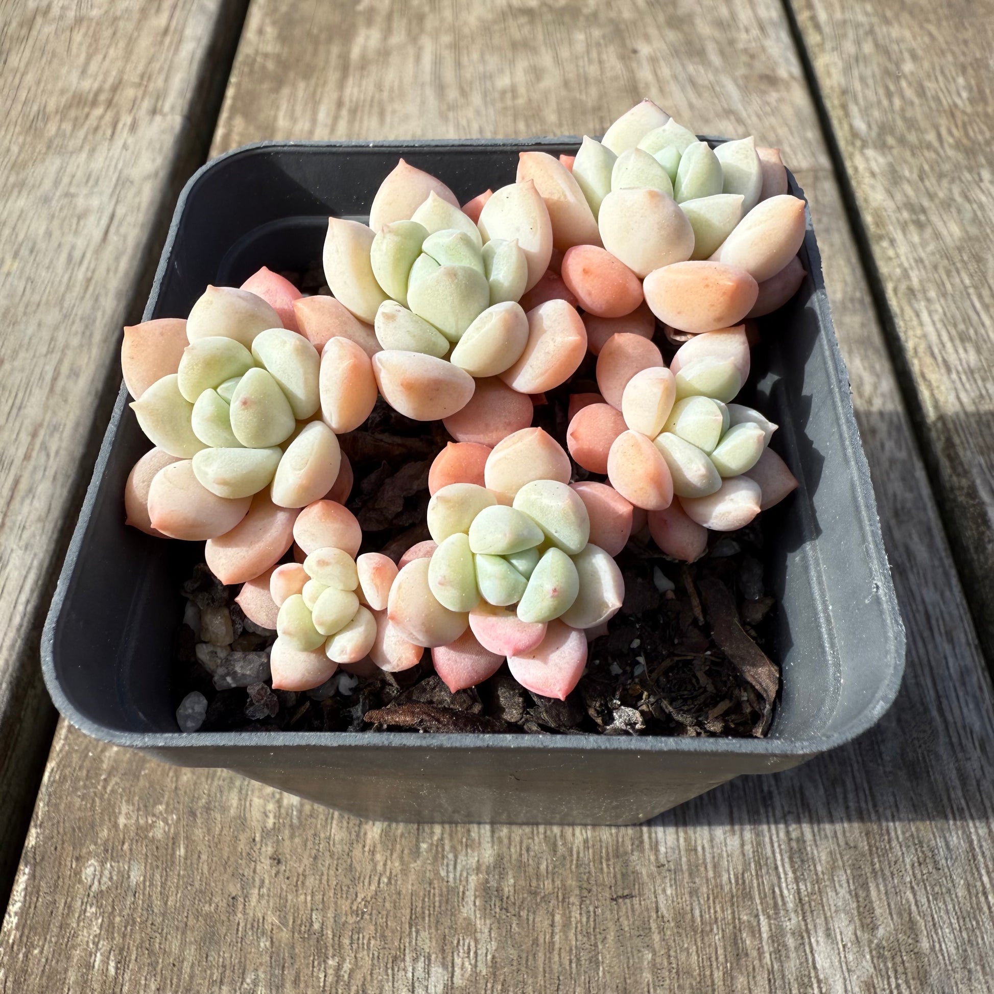Sedeveria Pudgy is a classic round and chubby hybrid between sedum and echeveria. It offsets easily. Prefers full/partial sun.