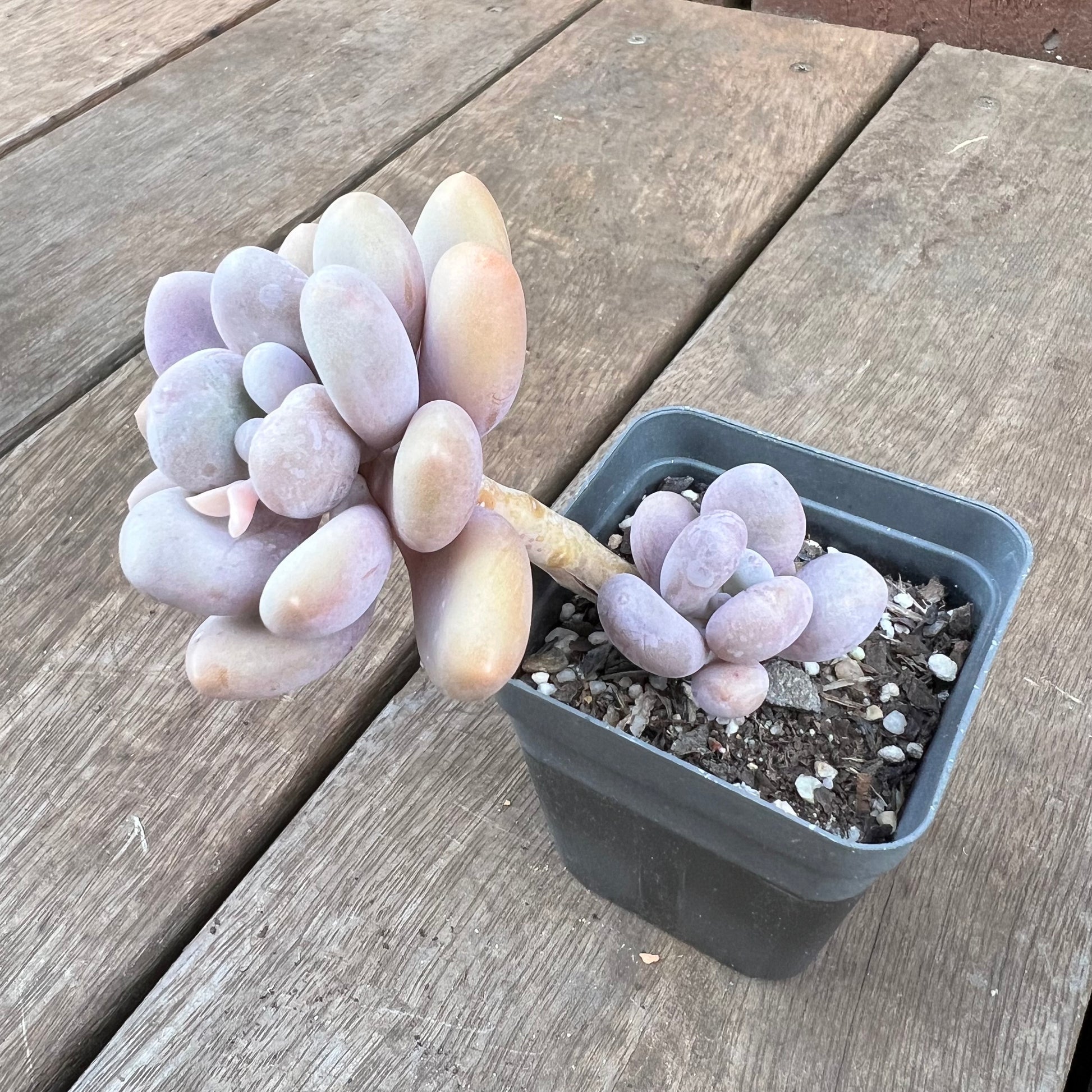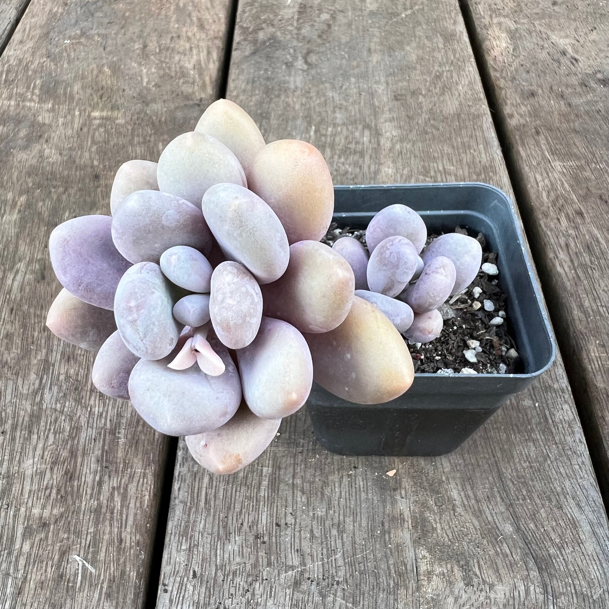 Pachyphytum Glutinicaule has powdery oval shaped leaves, with a pointy pink tip. Stressed to pink. Prefers full sun.