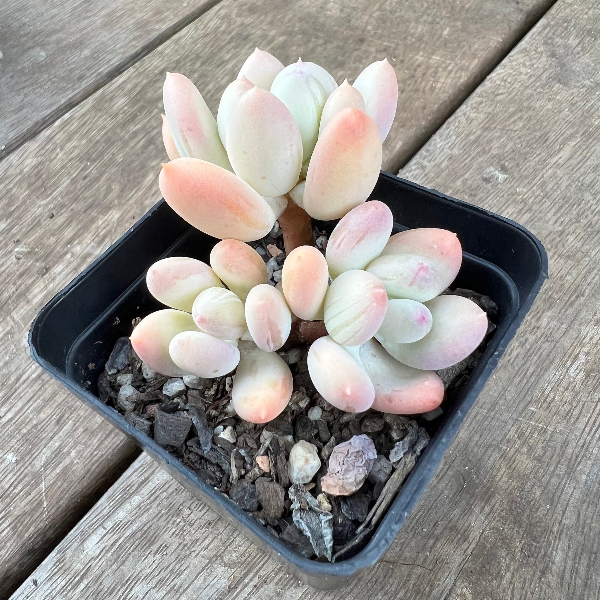 Pachyphytum Oviferum Mikadukibijin has powdery oval shaped leaves, with a pointy pink tip. Stressed to pale yellow/orange. Prefers full sun.