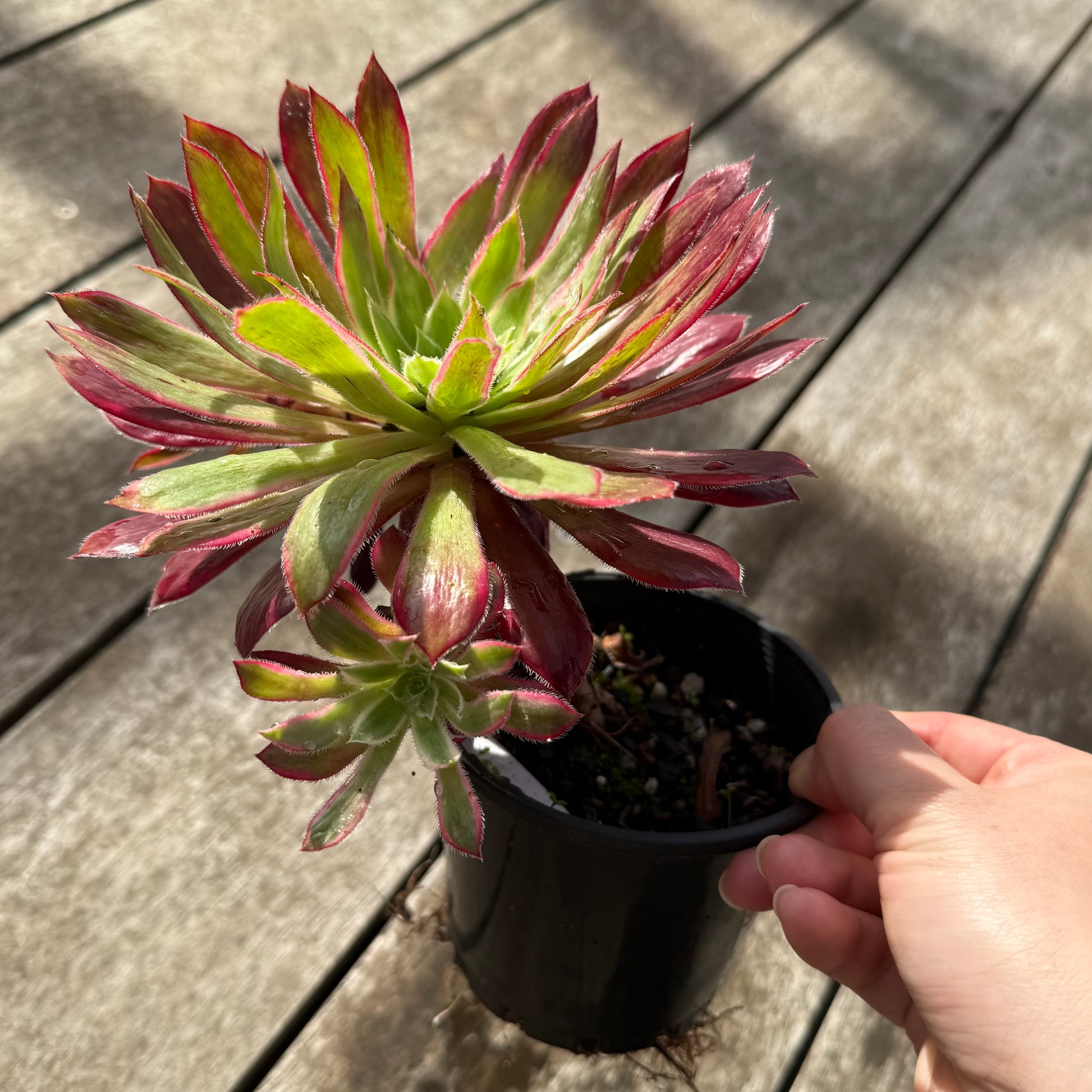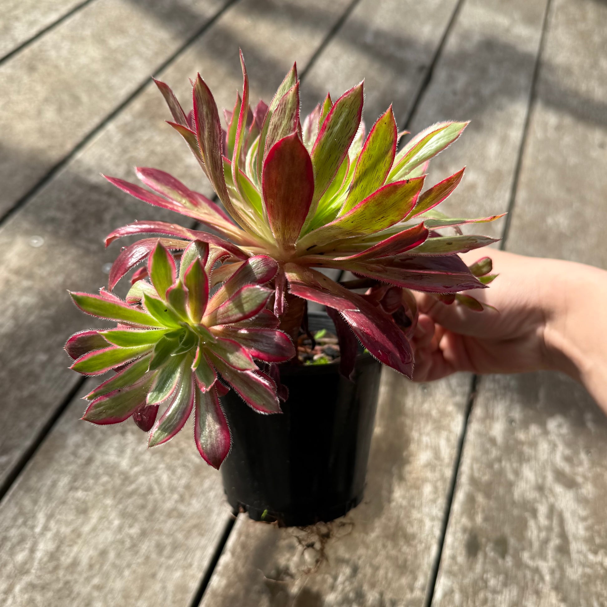 Aeonium Peacock Variegated changes colour throughout the year. Stress to red. Prefers full sun.
