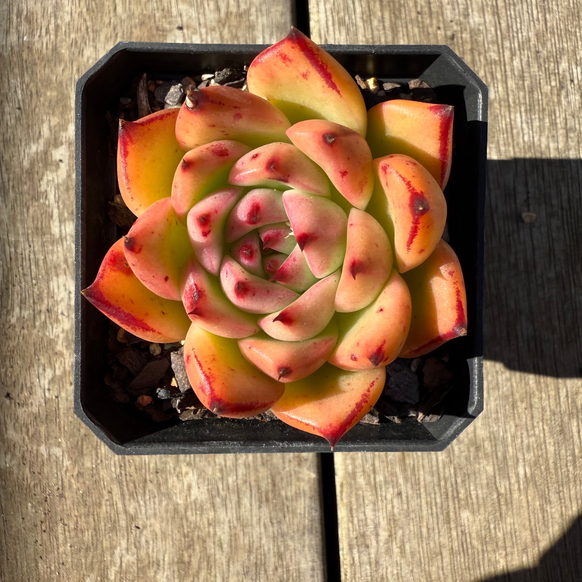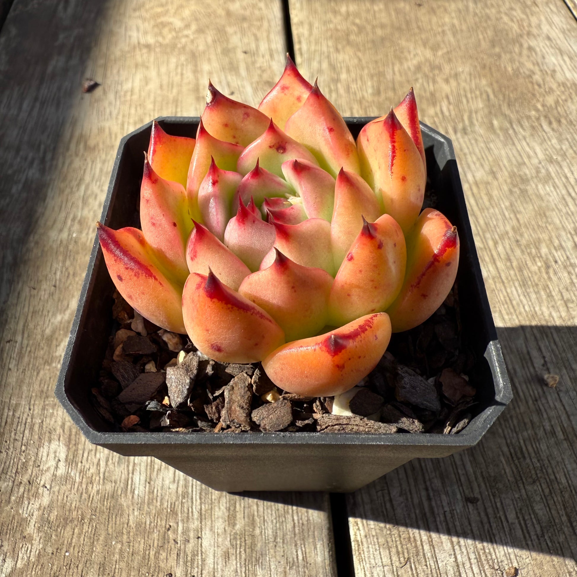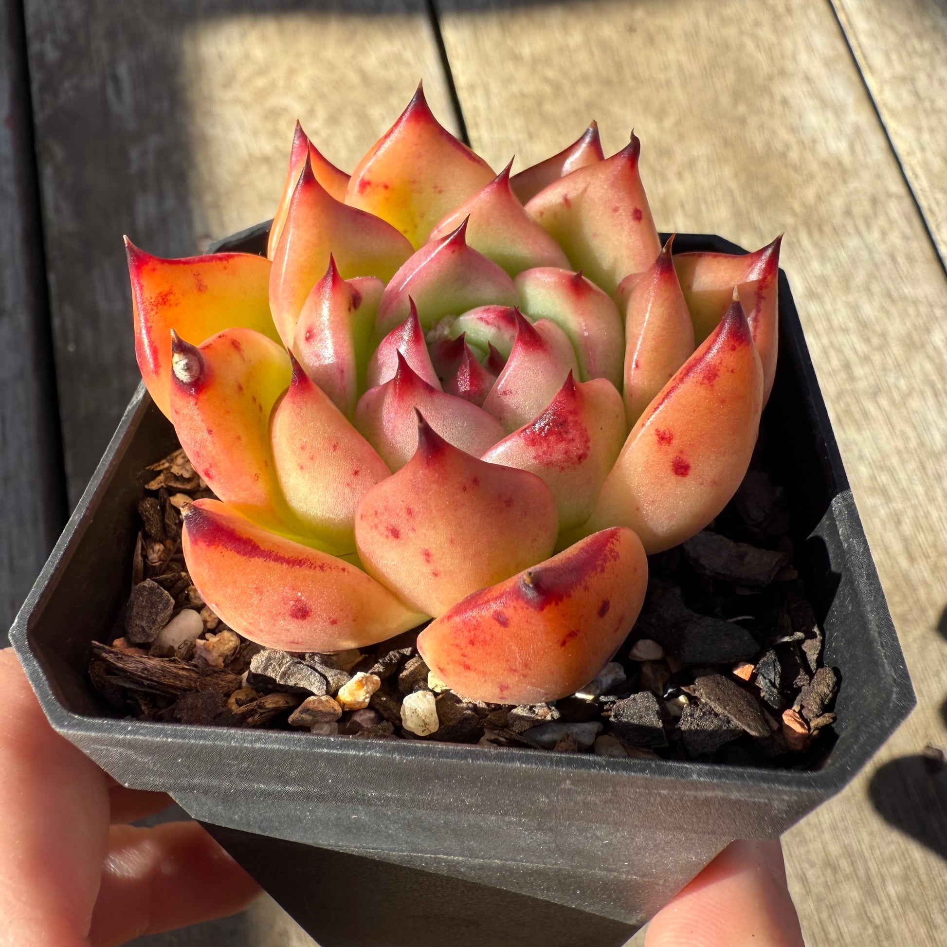 A beautiful hybrid of Agavoides that forms bright red speckles. Prefers full sun.