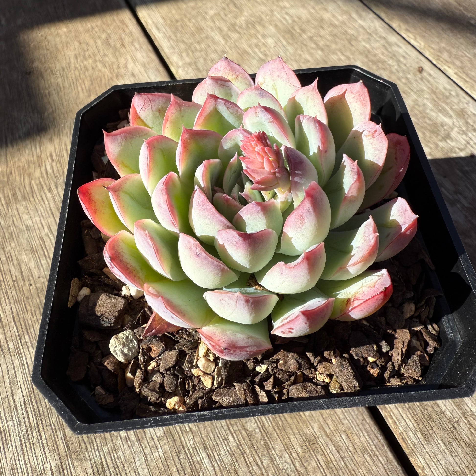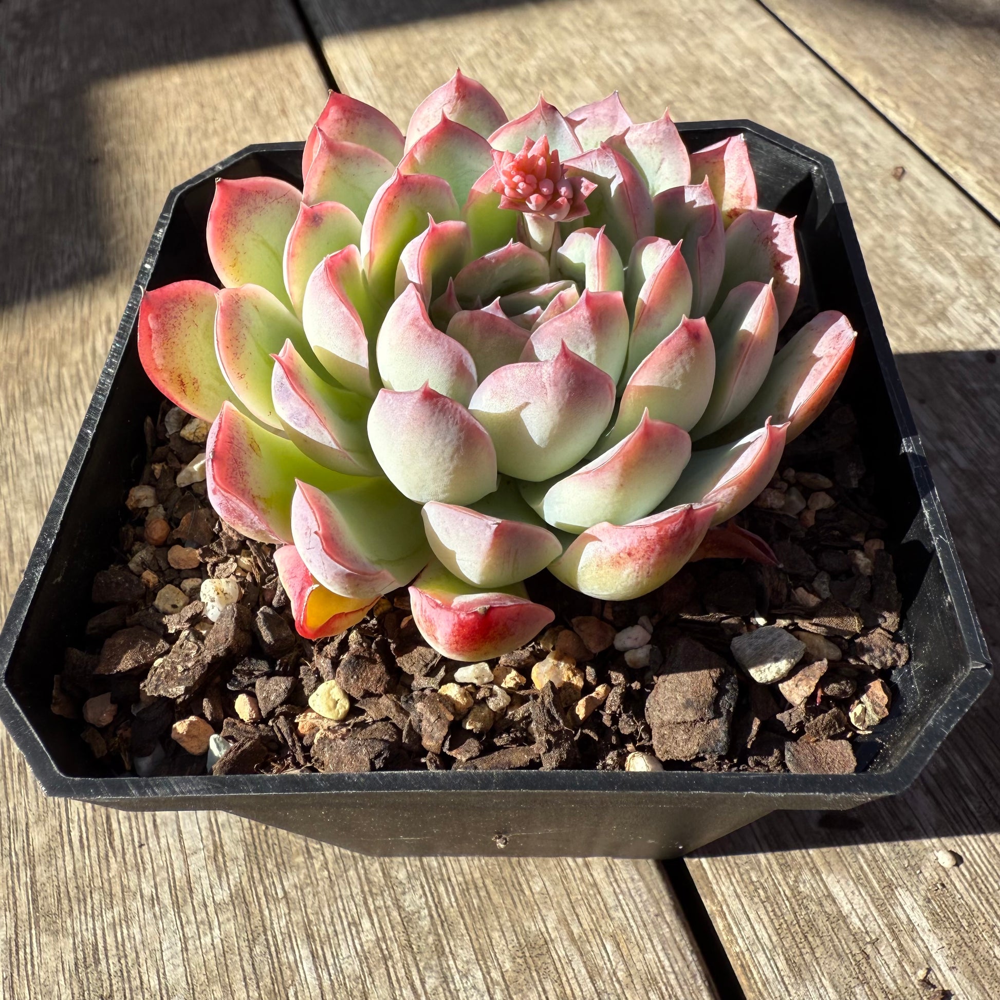 Echeveria Cherry has bright red margin and sharp tips. Prefers full sun.
