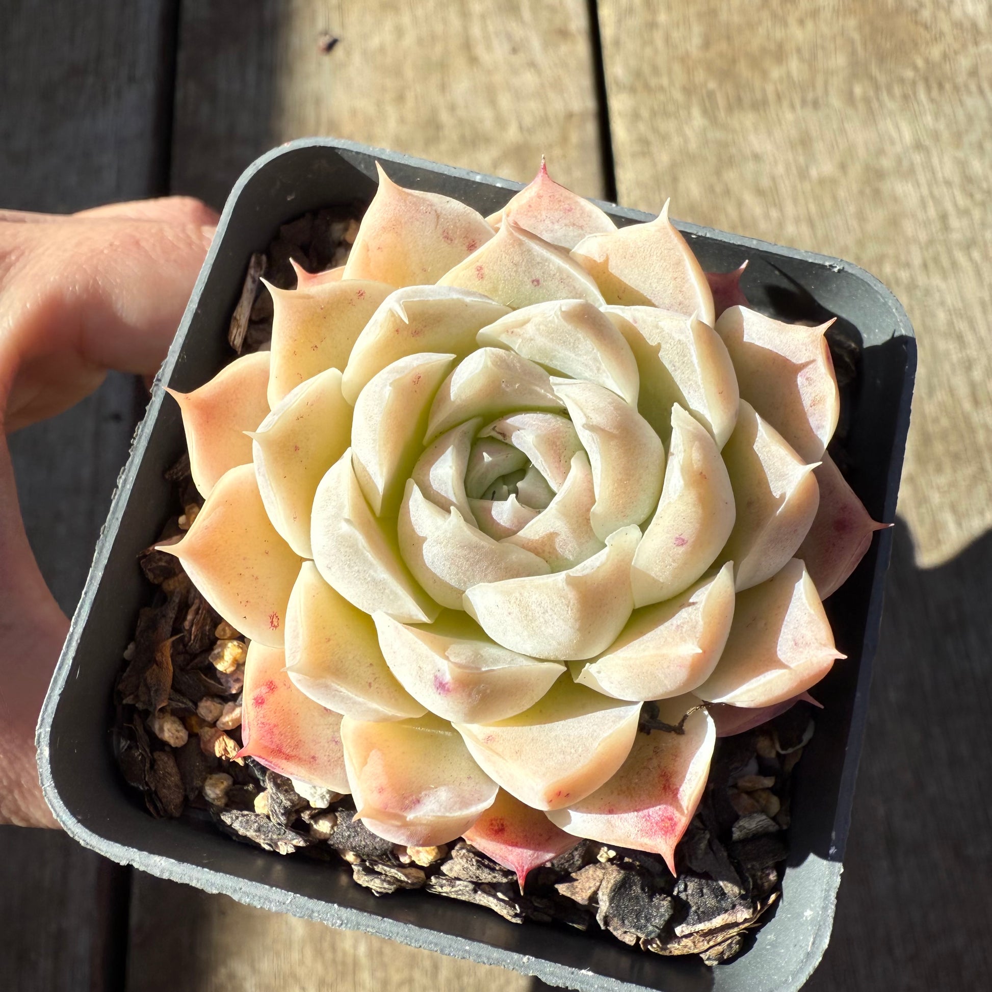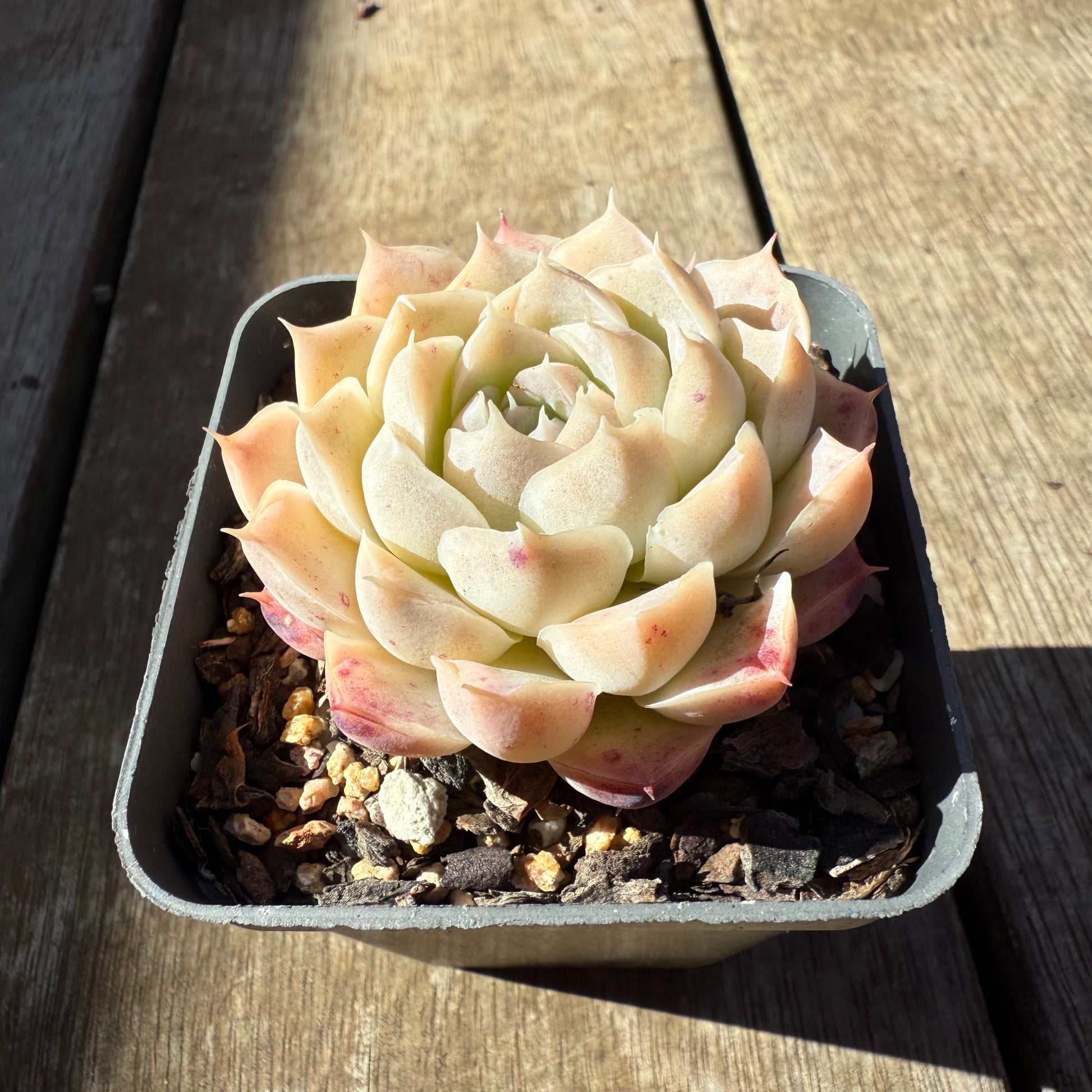 Echeveria 'Mooncake' has chubby cream white leaves. It forms pink speckles on the outer leaves when stressed. Prefers full sun.
