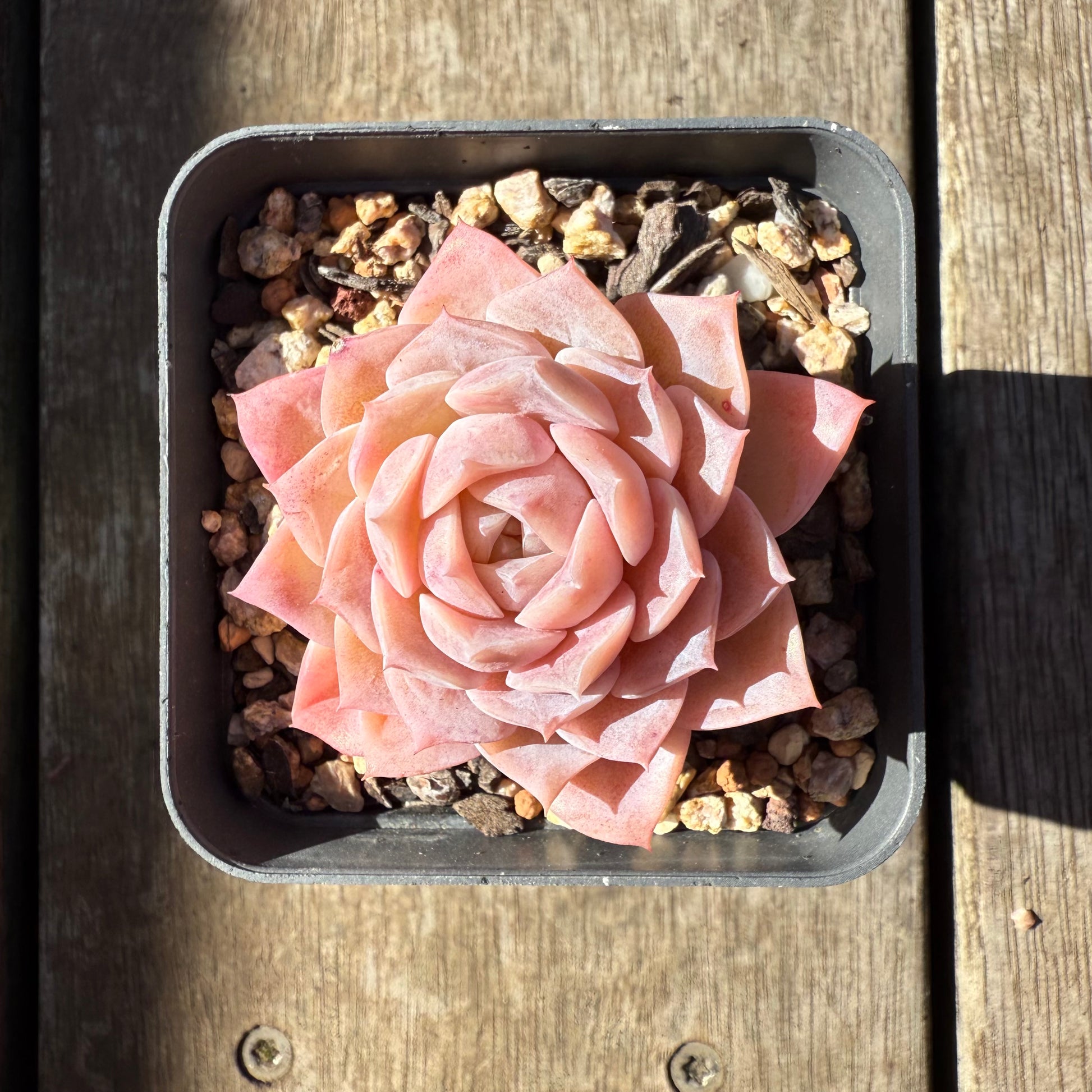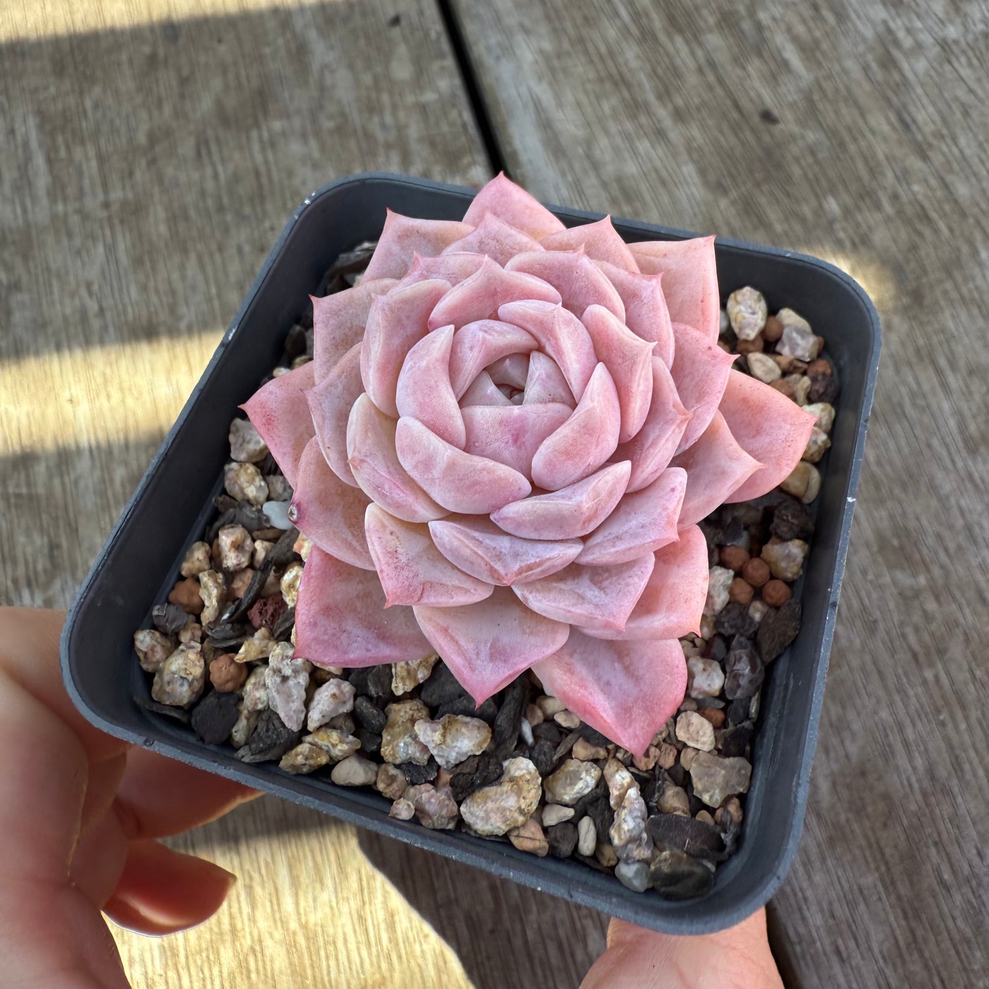 Echeveria 'Pure Love' is a captivating succulent that lives up to its name. It forms stunning rosettes of thick, fleshy leaves with a soft pastel coloration. The leaves range from pale pink to creamy white, creating a delicate and romantic appearance.