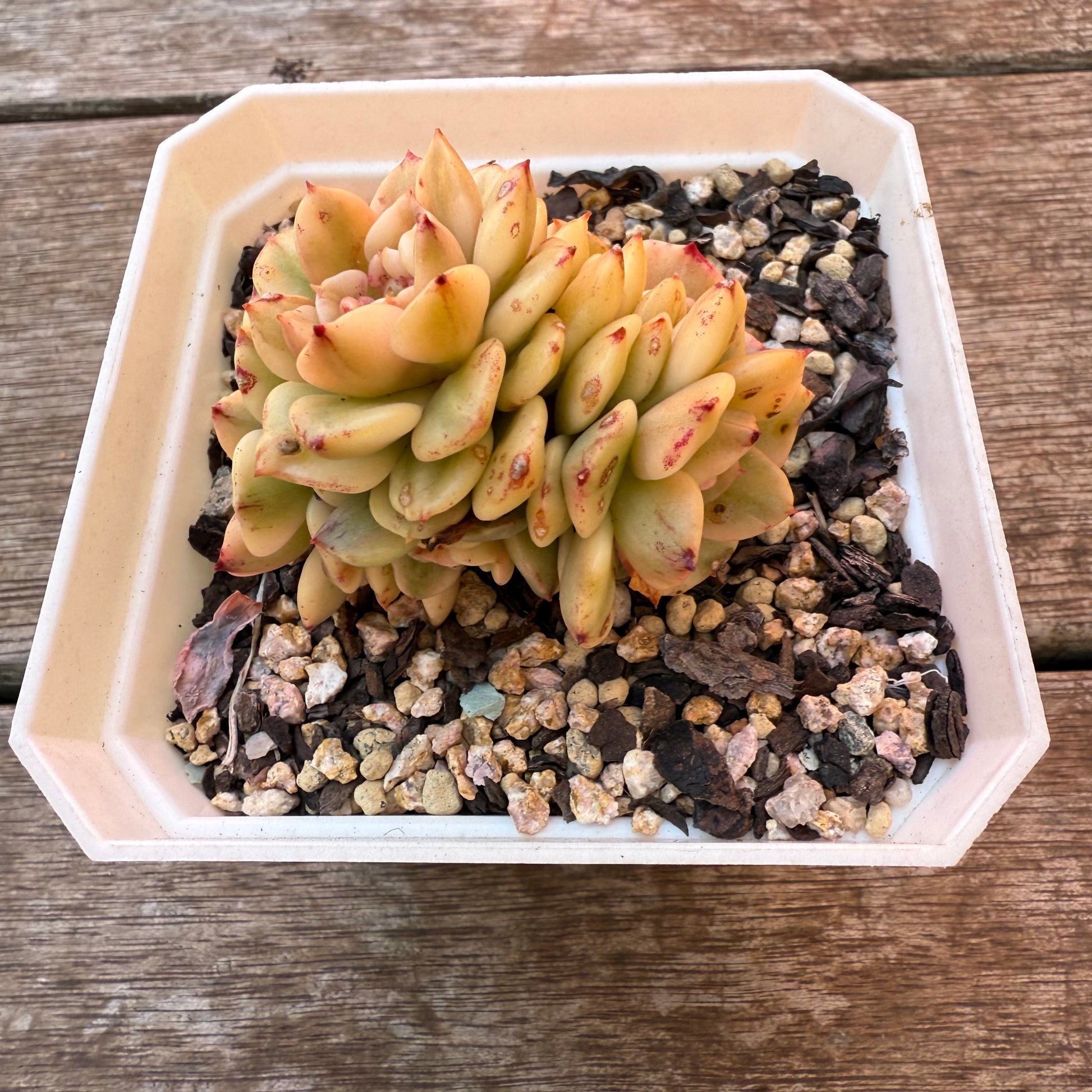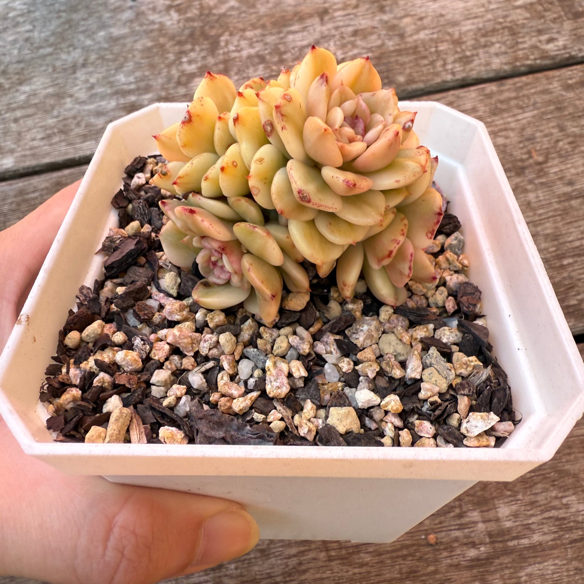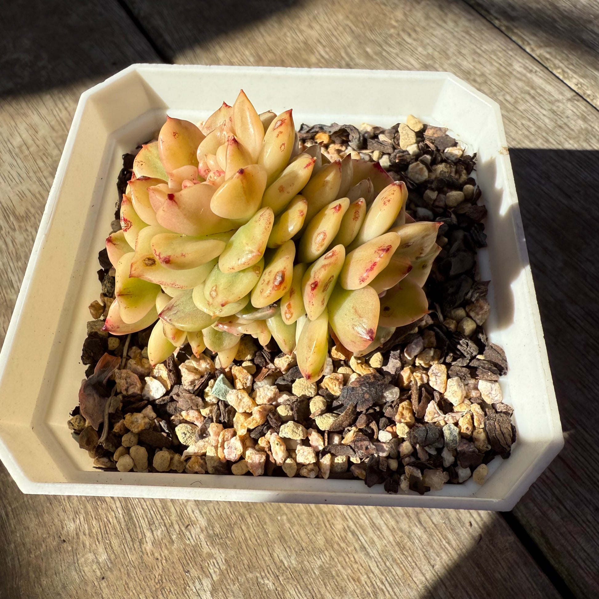 Sedeveria Rolly Variegated has unique waxy shiny leaves with beautiful white variegation strikes.