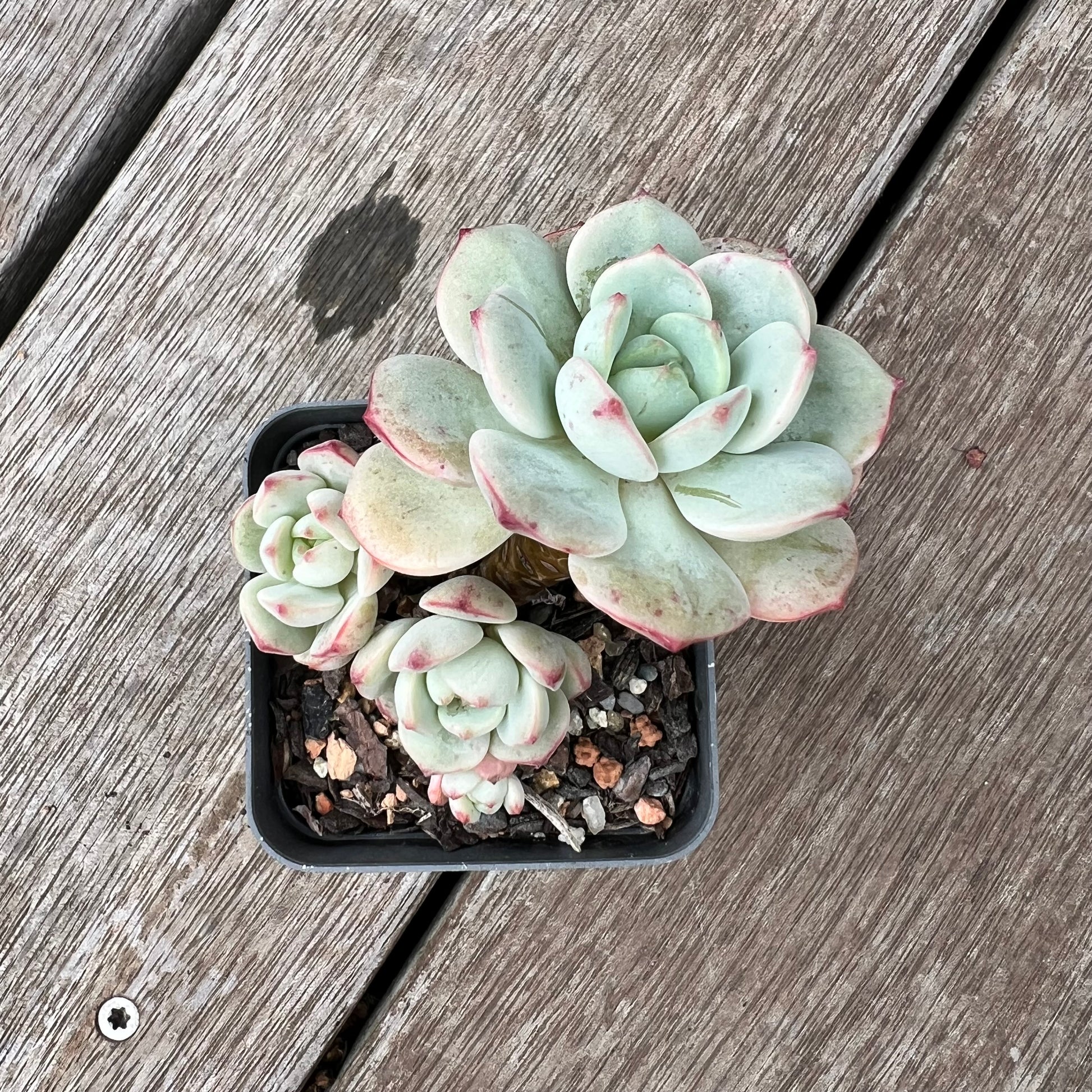 Hybrid of Echeveria derenbergi and Sedum clavatum. When grown well, it will form a compact rosette with red edge. Prefers full sun.