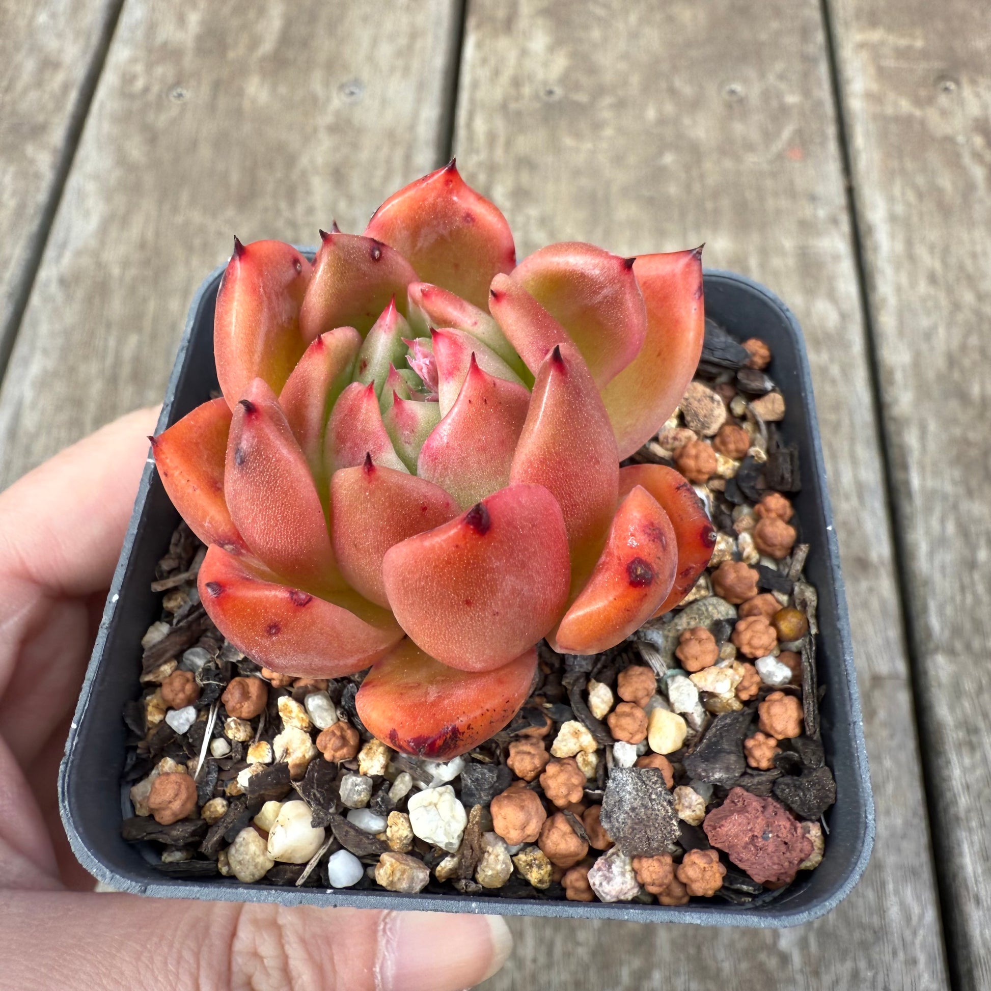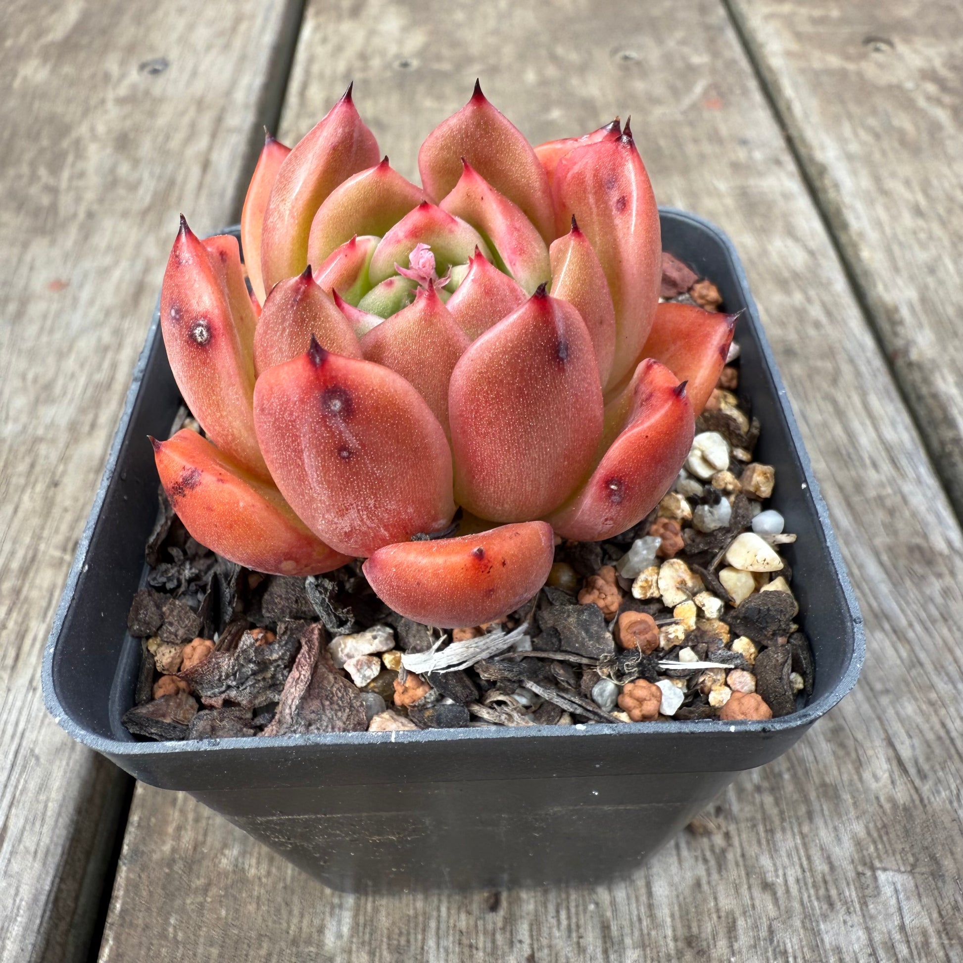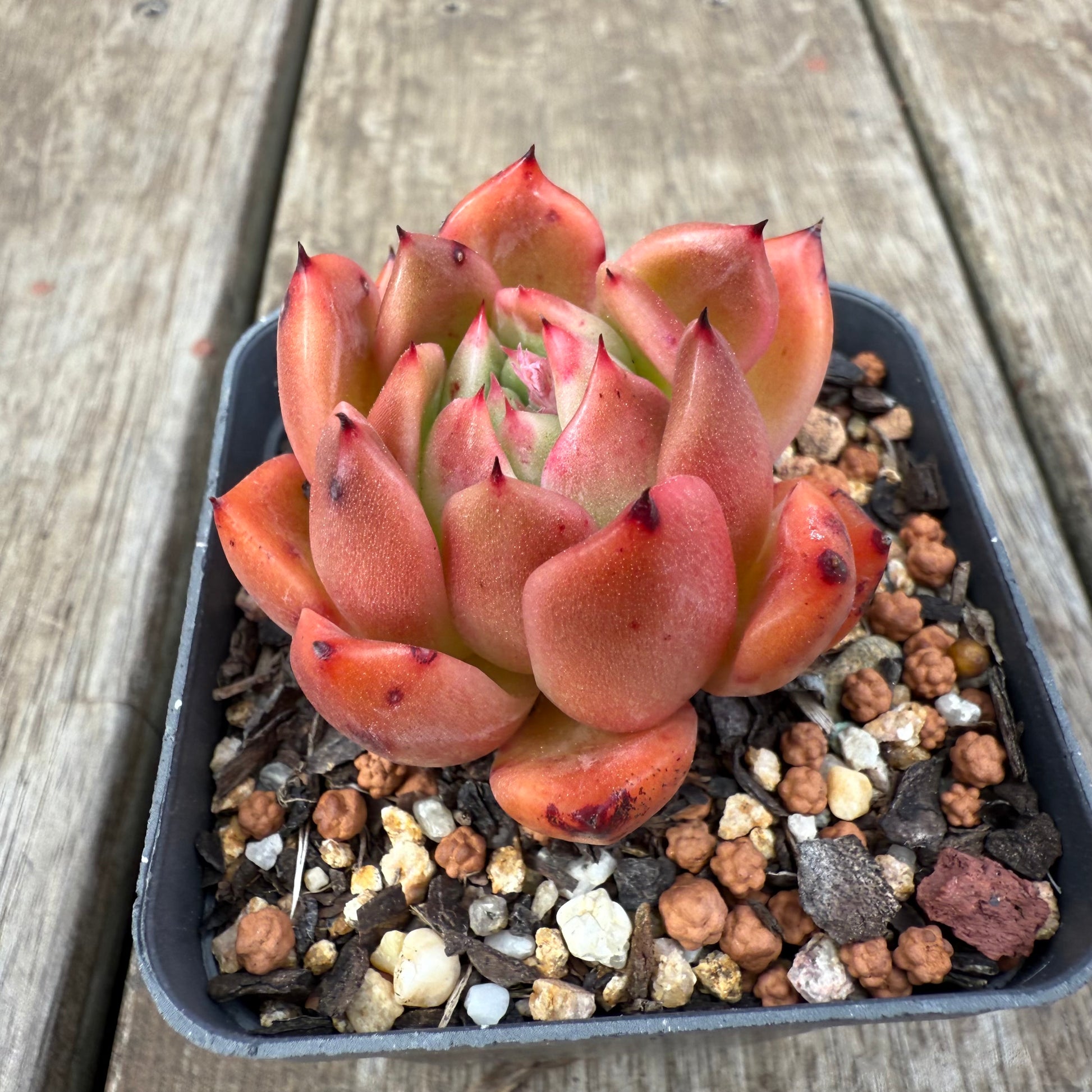 A korean hybrid Agavoides. It stresses to hot red. Prefers full sun.