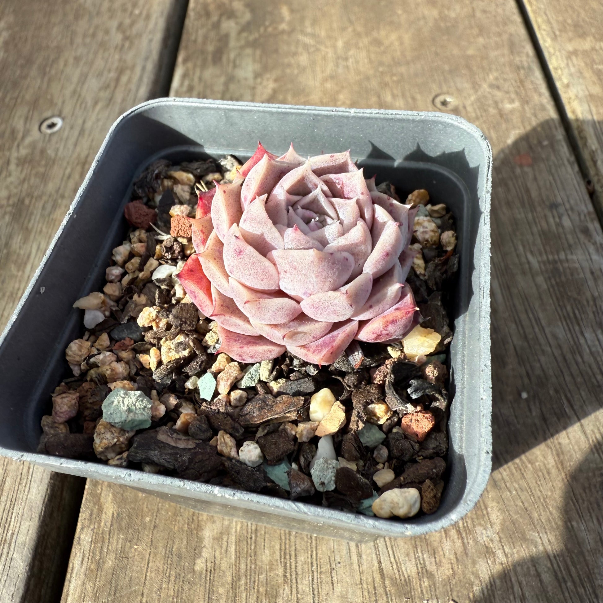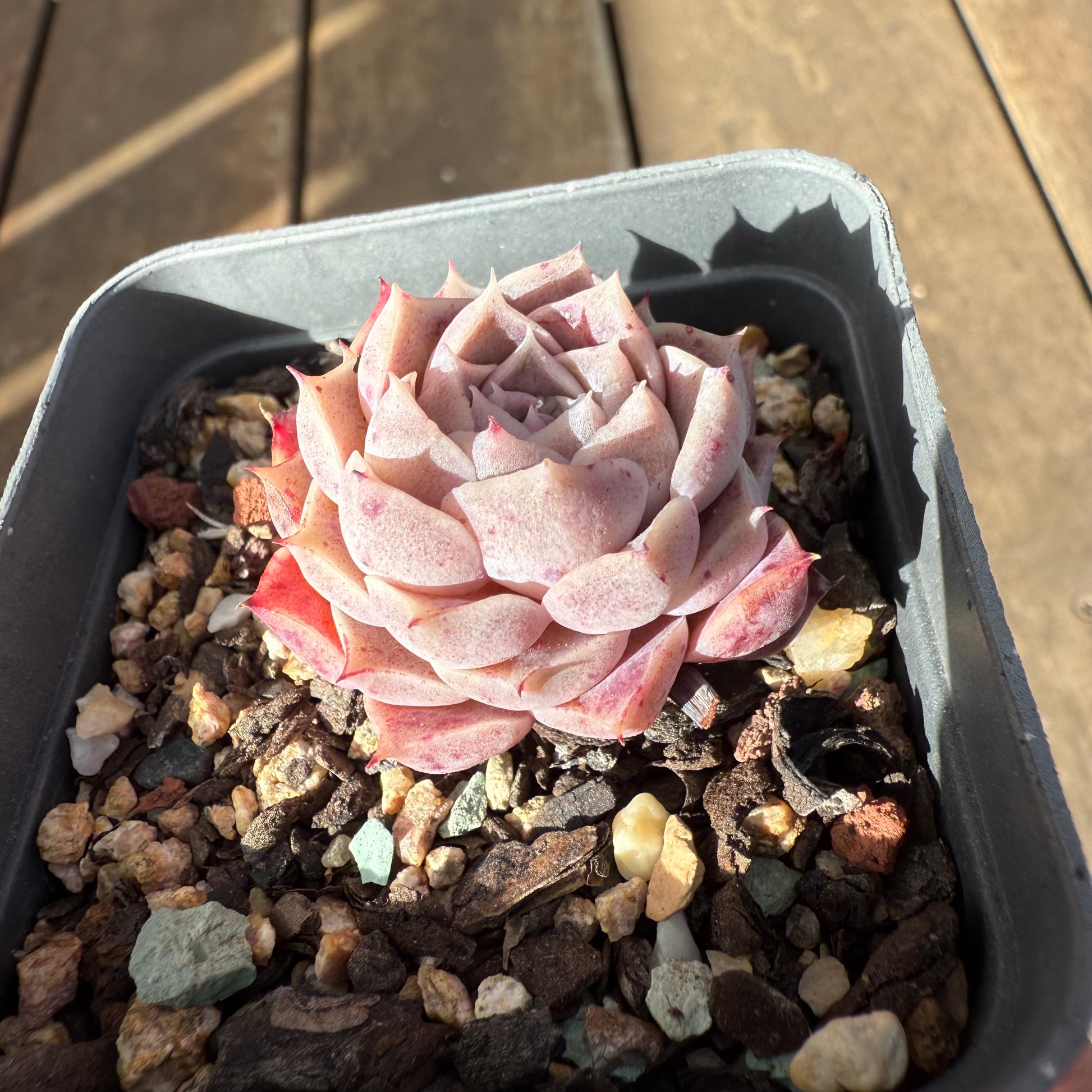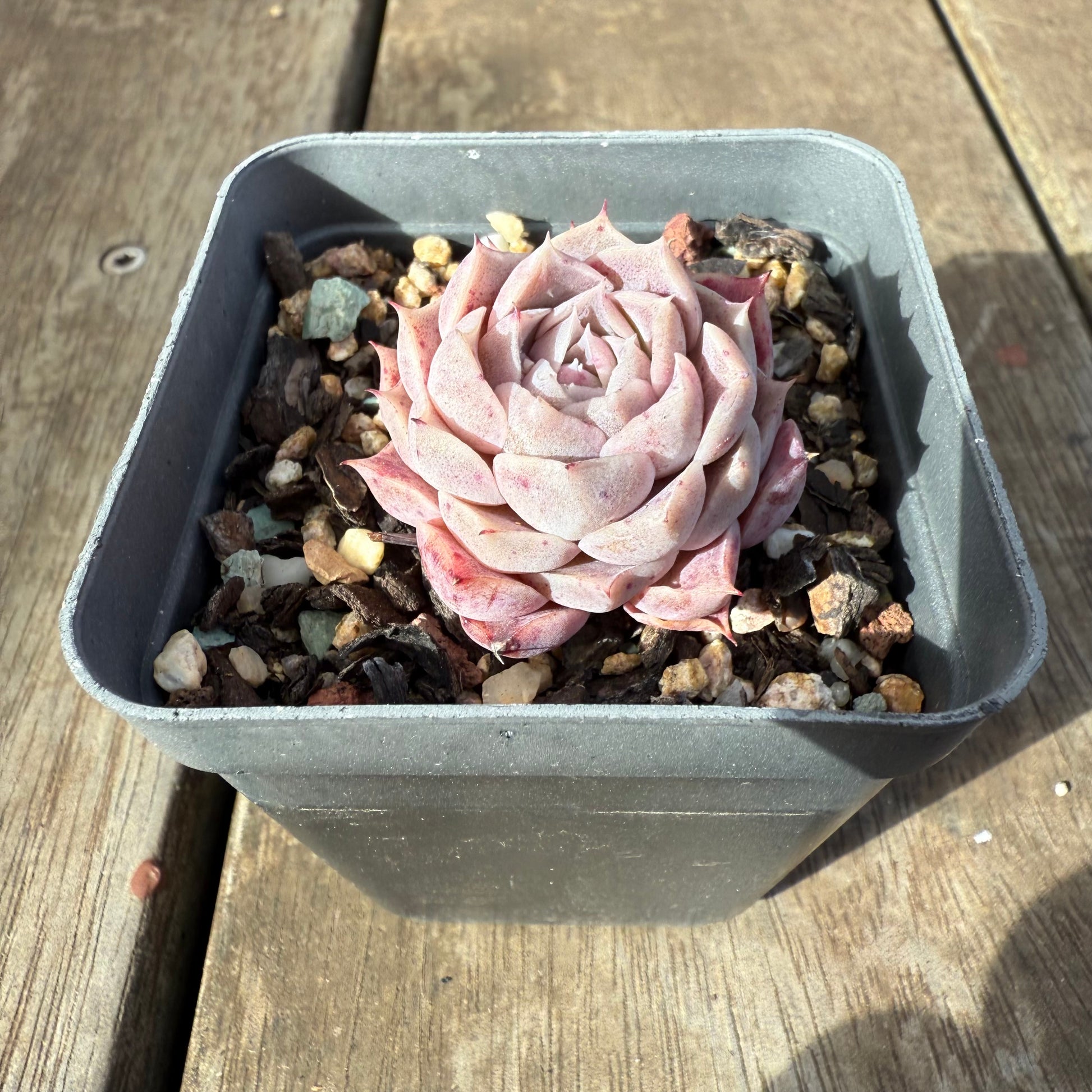 Echeveria Hyalina 'Lilac Goddess' has purple/pink speckles and forms a compact rosette. Prefers full/partial sun.