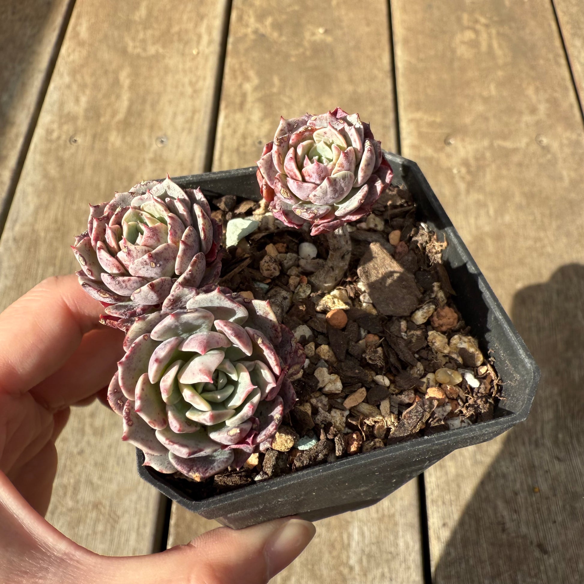 Echeveria Tuxpan has thin grey-green leaves and forms a compact rosette. Stress to purple/pink. Prefers full sun.