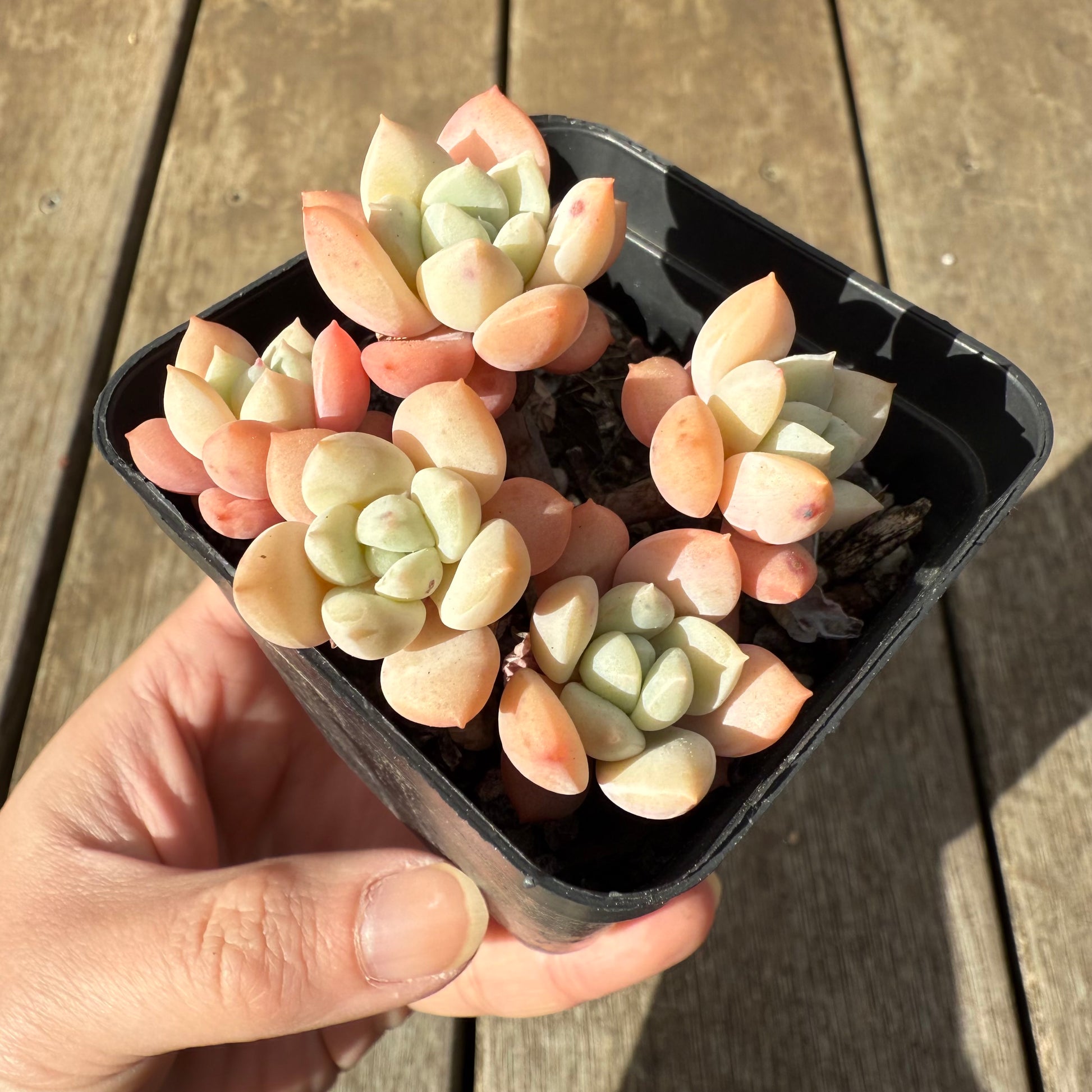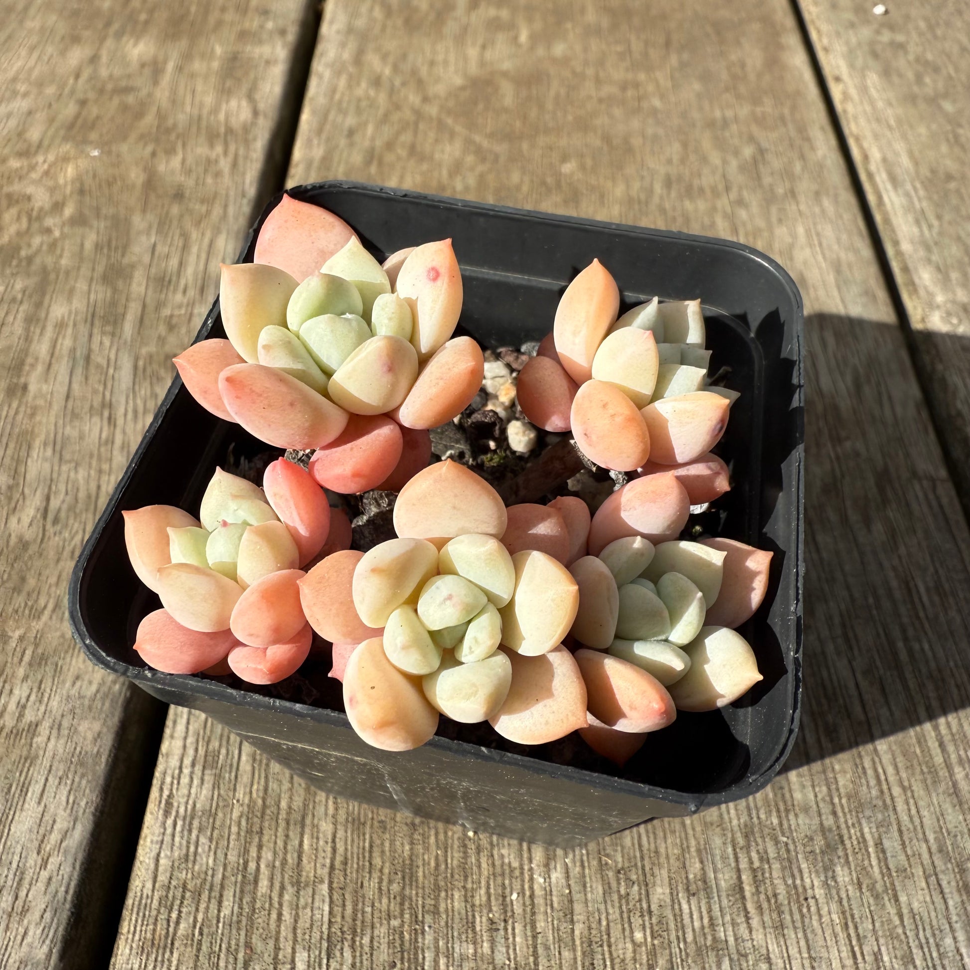 Sedeveria Pudgy is a classic round and chubby hybrid between sedum and echeveria. It offsets easily. Prefers full/partial sun.
