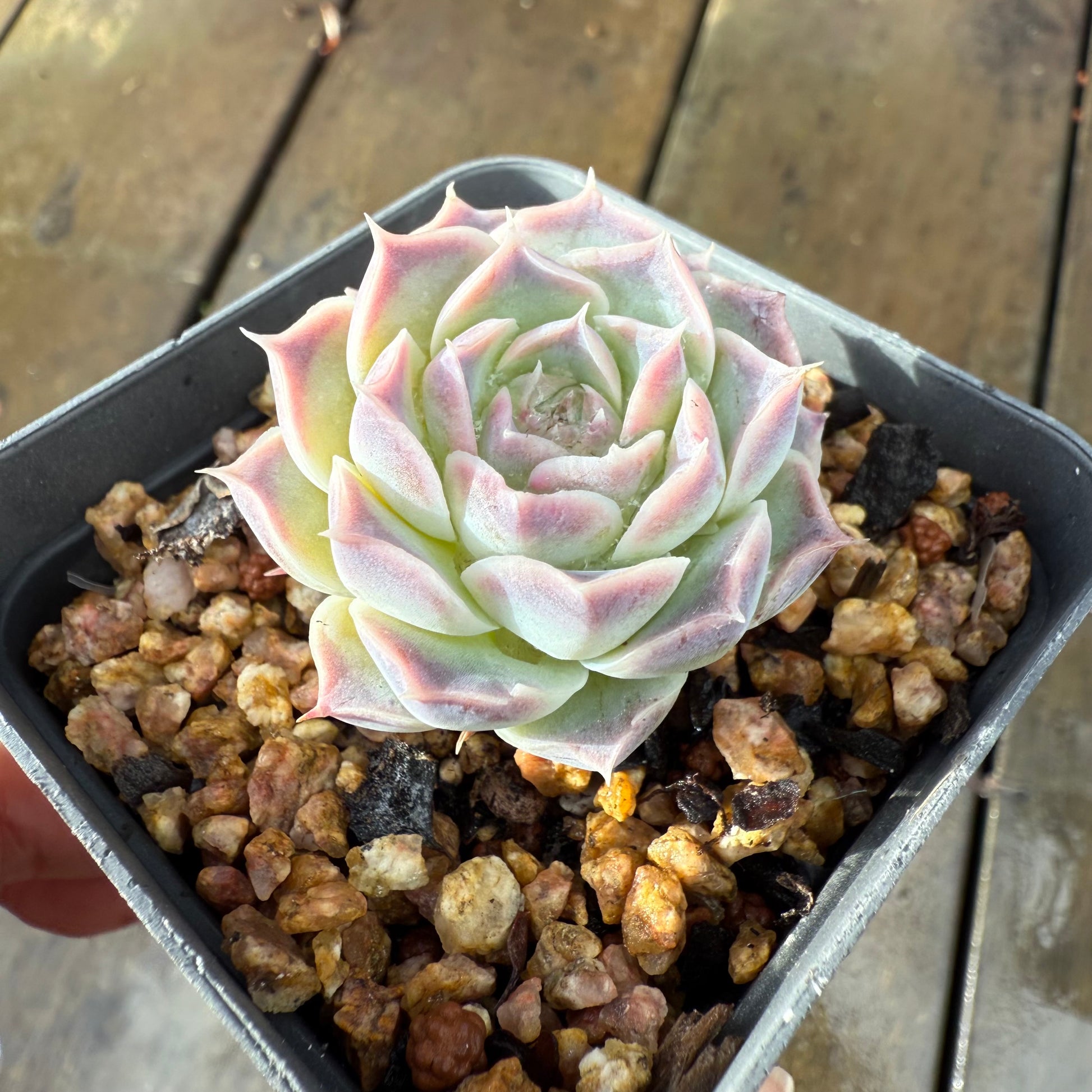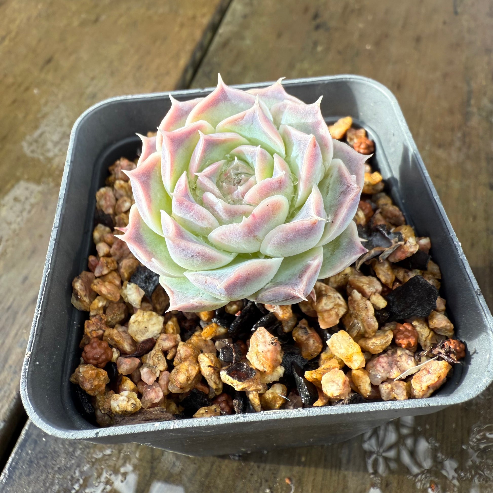 Echeveria Gilo has dark blueish leaves and dark purple edges. Prefers full sun.