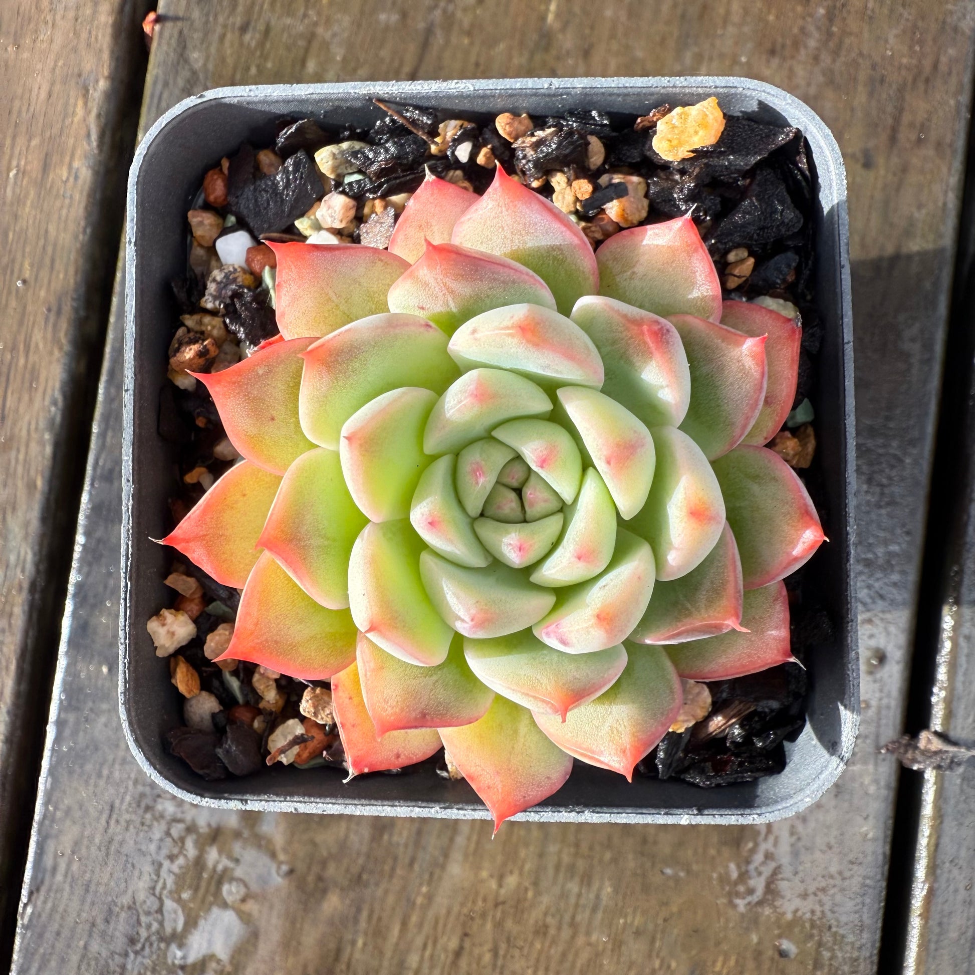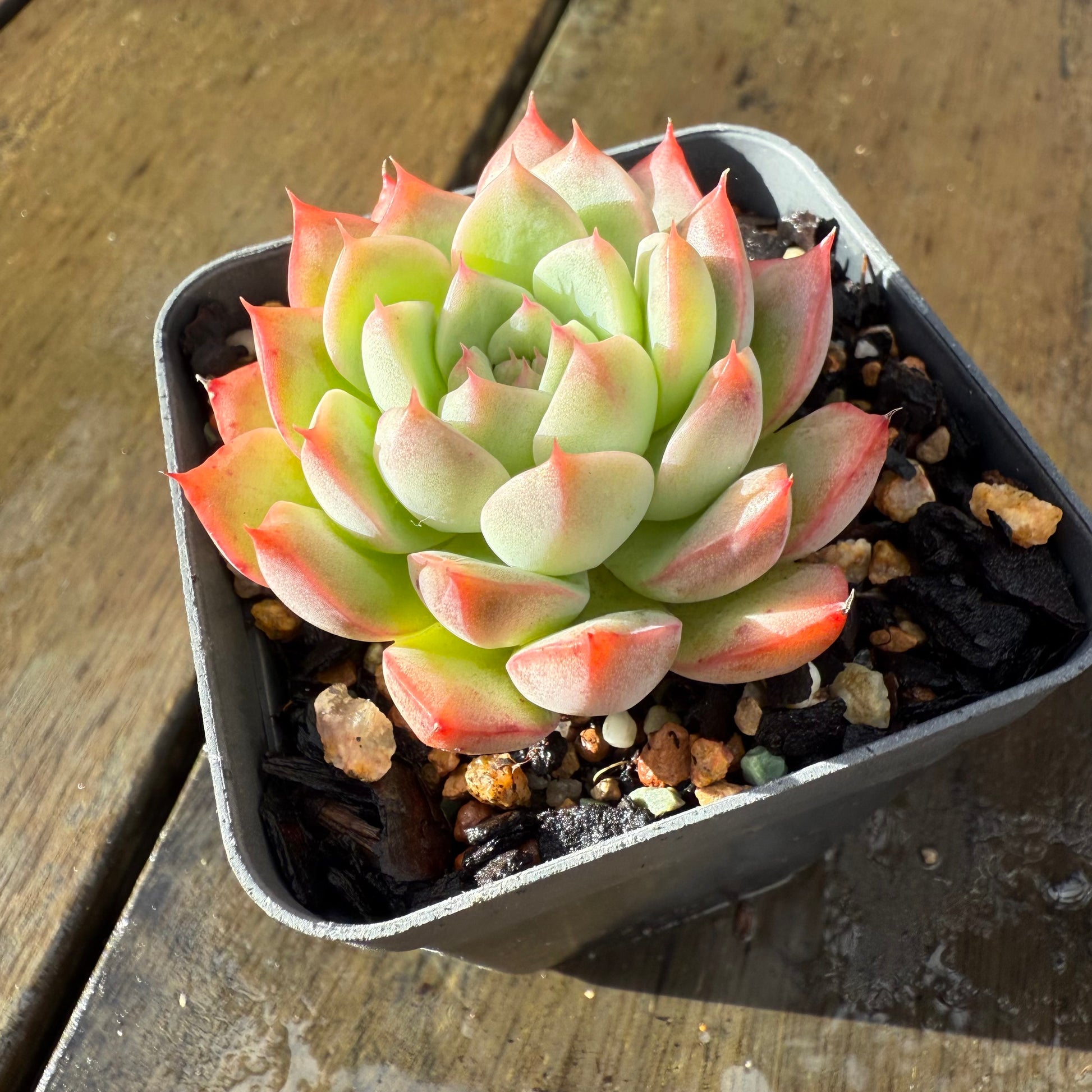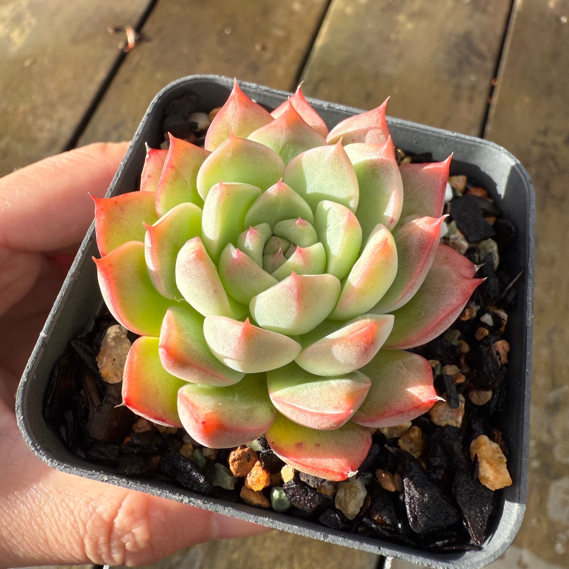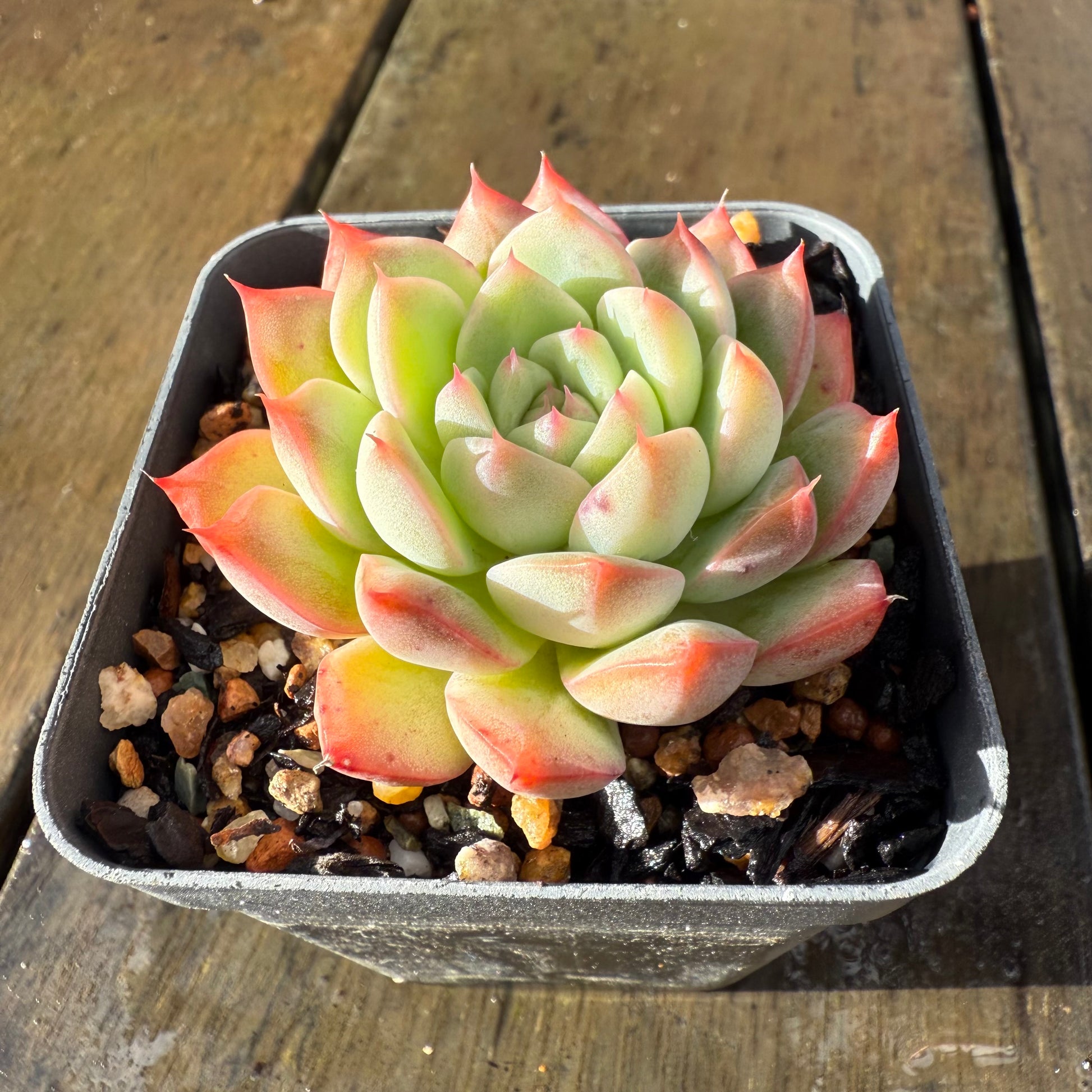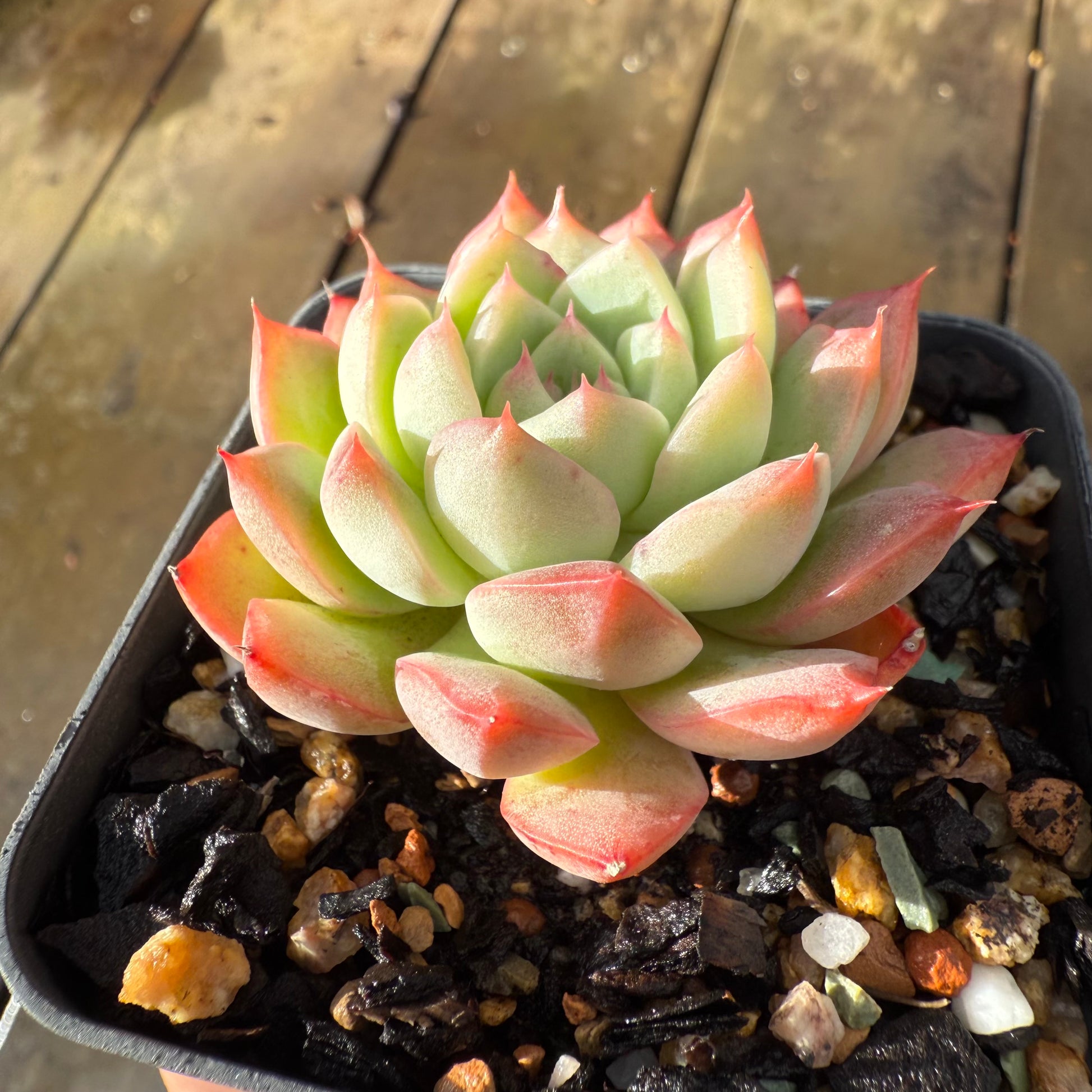 Echeveria 'White Peach' has chubby white leaves with soft pink edges. Stress to pink/orange. Prefers full sun.