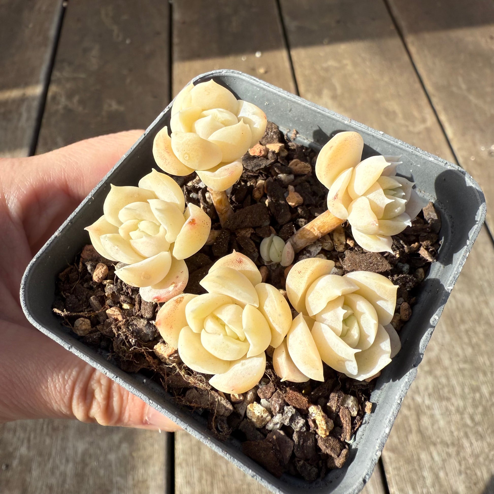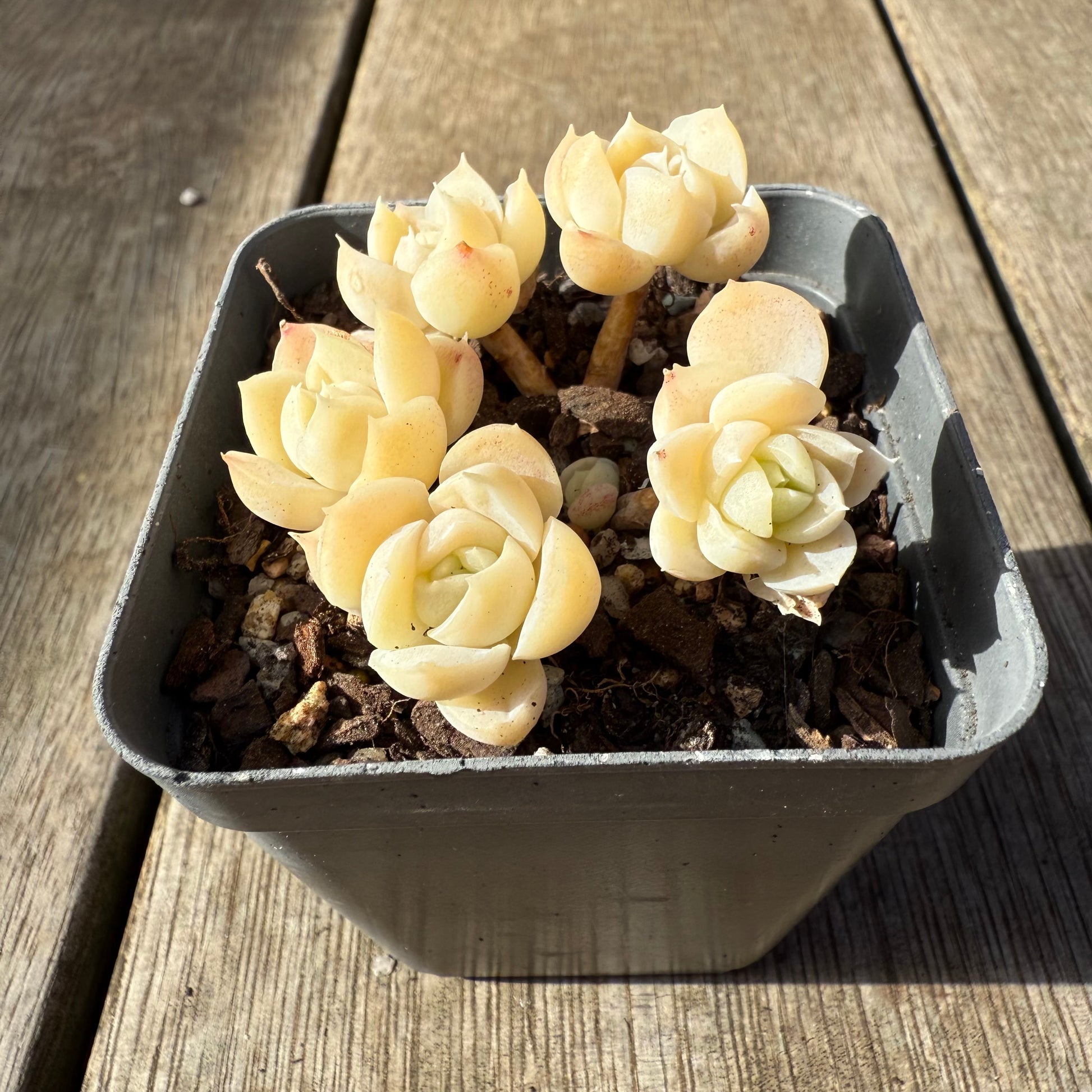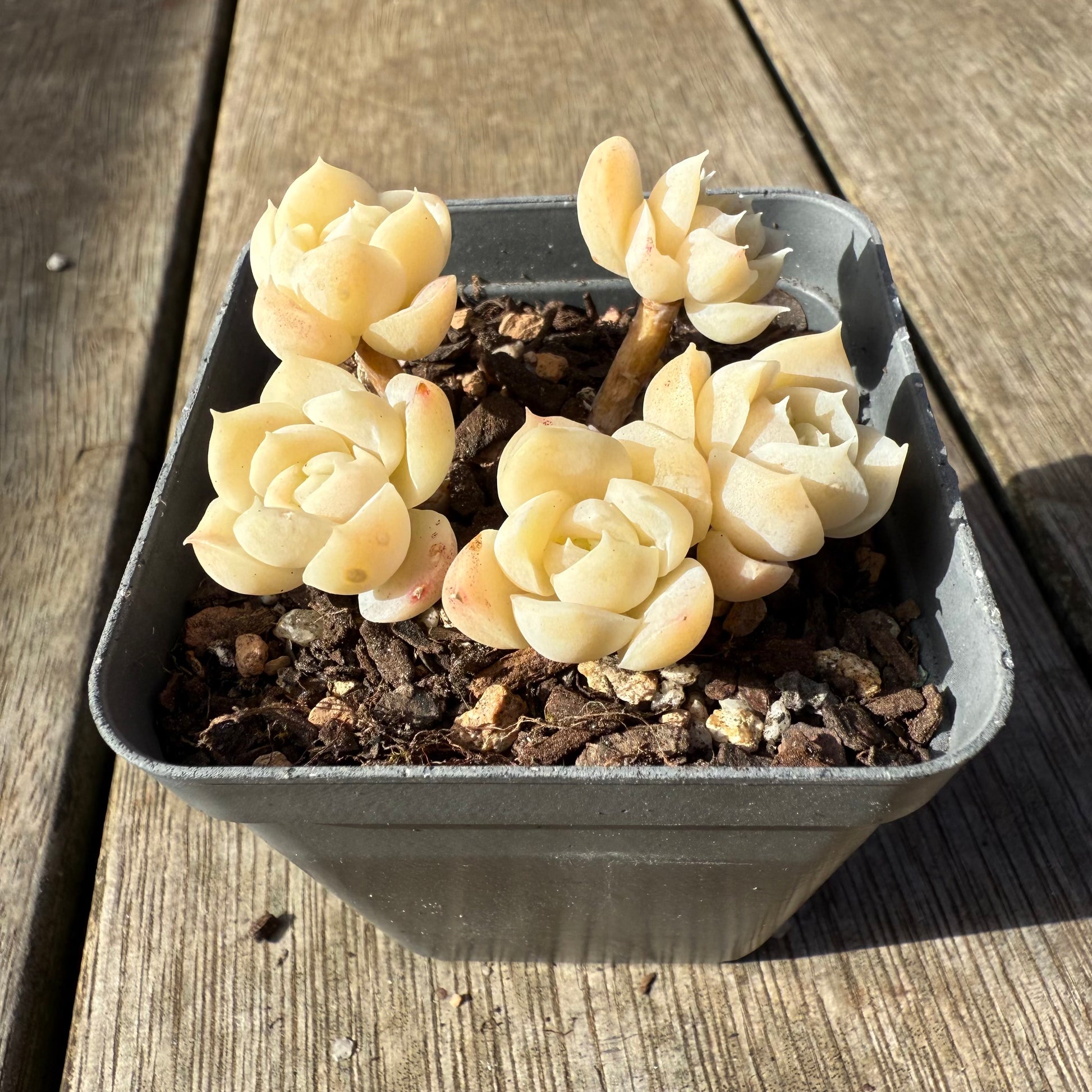 Echeveria 'Cream Berry' has soft yellow/white leaves that stress to soft pink. Prefers full sun.