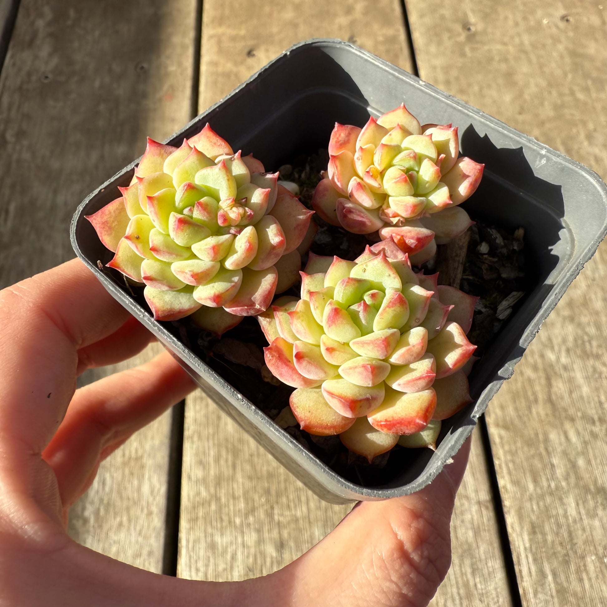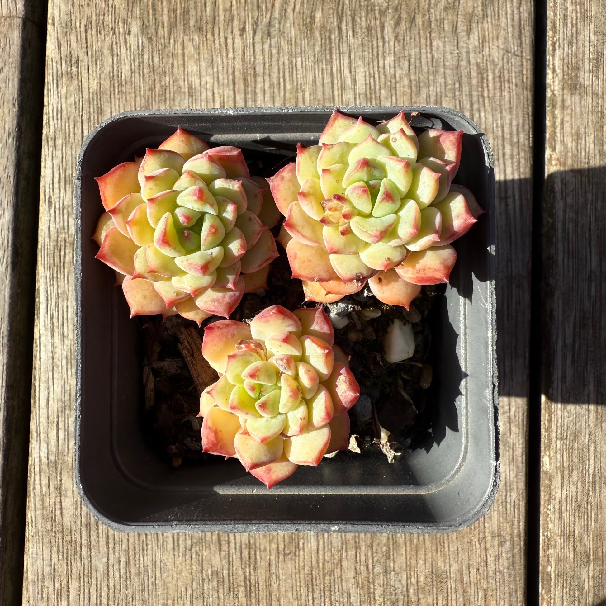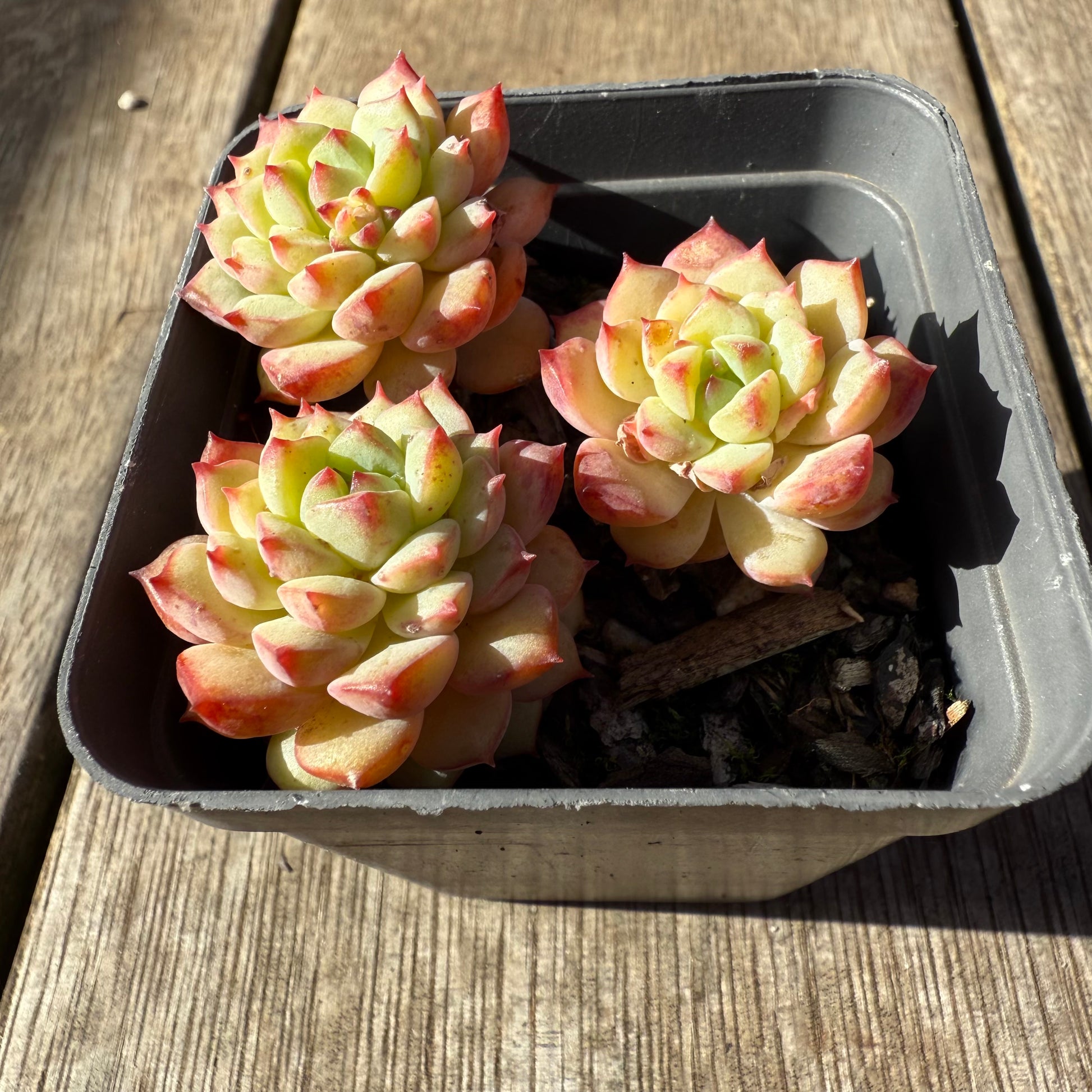 Echeveria Panda Face is a lovely miniature derenbergii hybrid with compact rosettes. Its tips become red when grown in full sun. When fully grown it only measures to 4-5 cm per head. Easy to offset. Prefers full/partial sun.