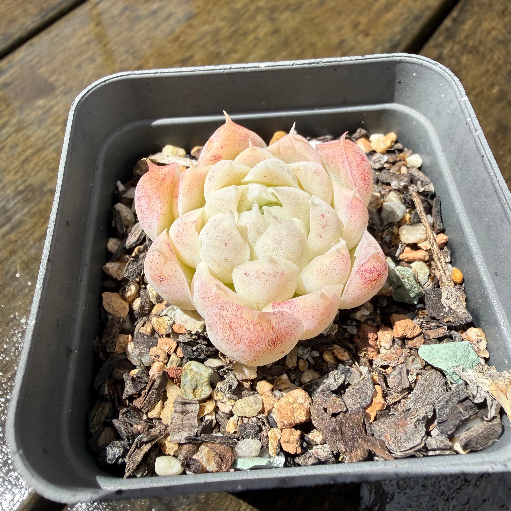 Echeveria Elegans 'Crystal' has angular thick fleshy leaves. It has an overall translucent white colour with outer leaves stress to form pink speckles. Prefers full sun.