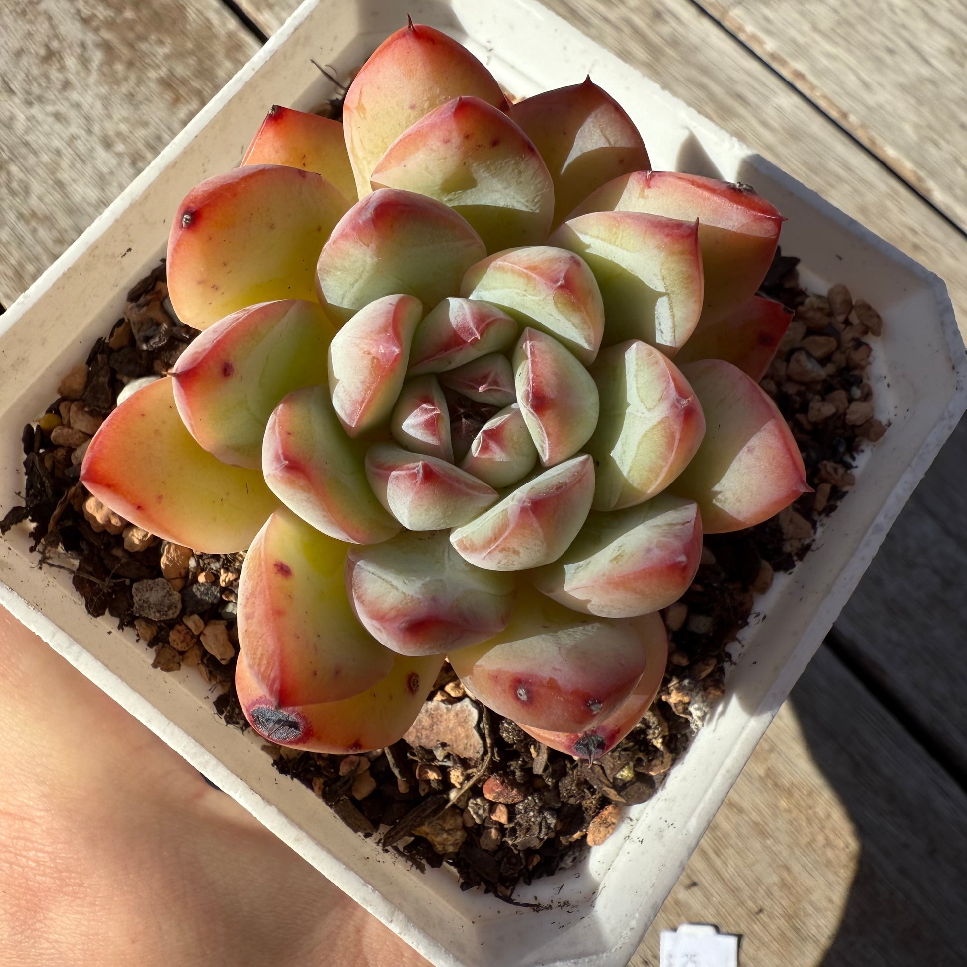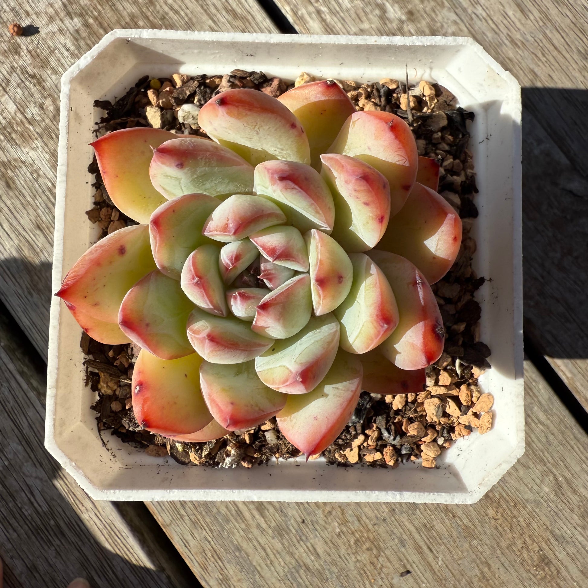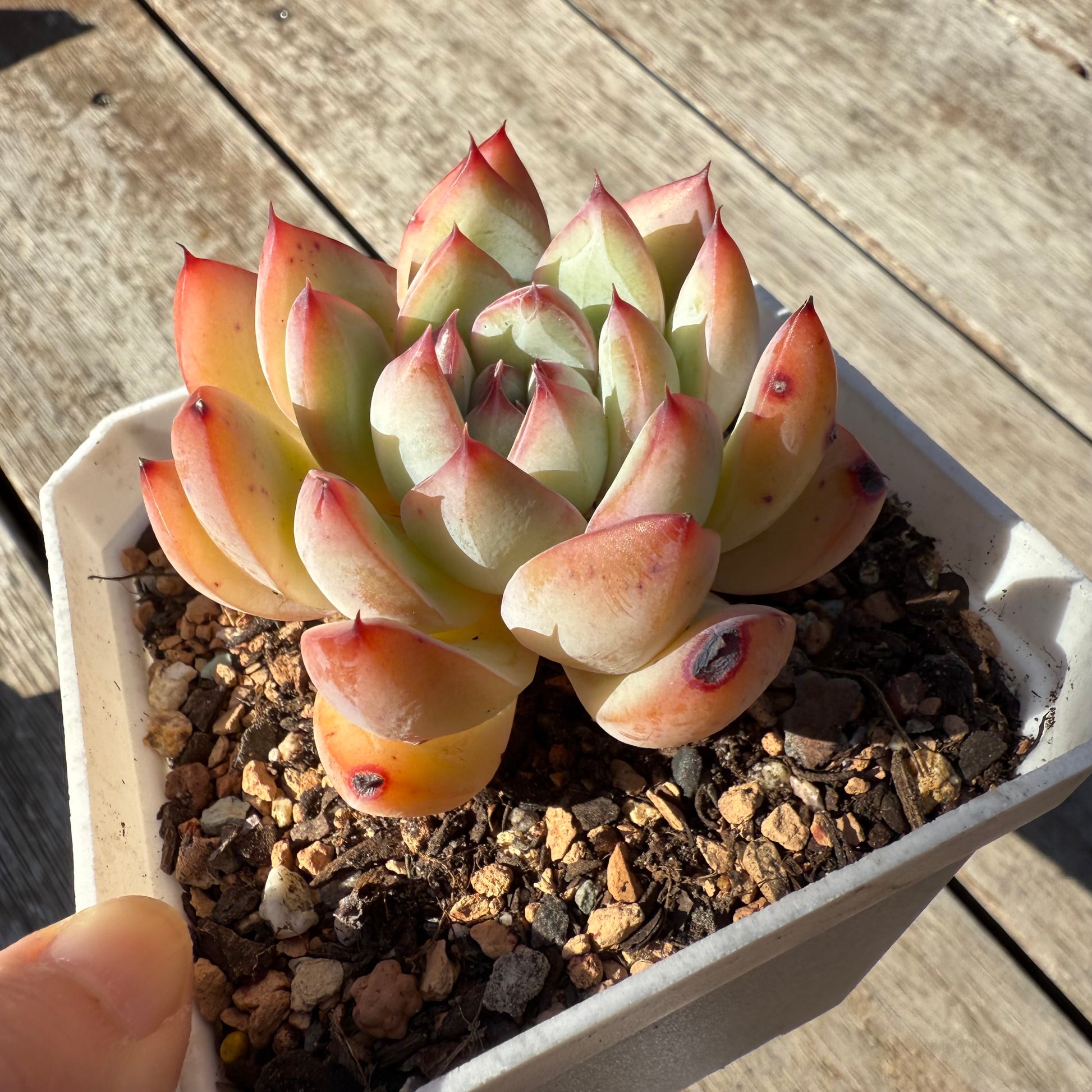 This is a hybrid variety of E.Colorata. It has chubby leaves that forms white markings and stress to pink. Easy to care. Prefers full sun.