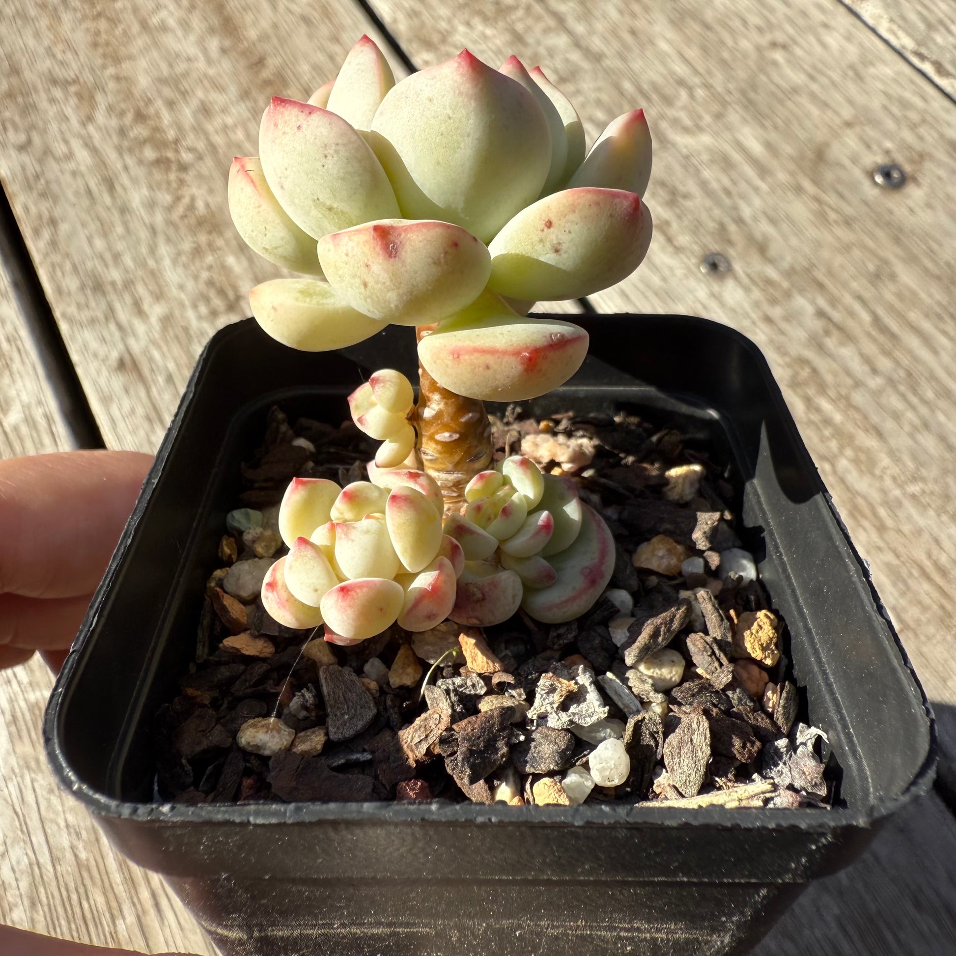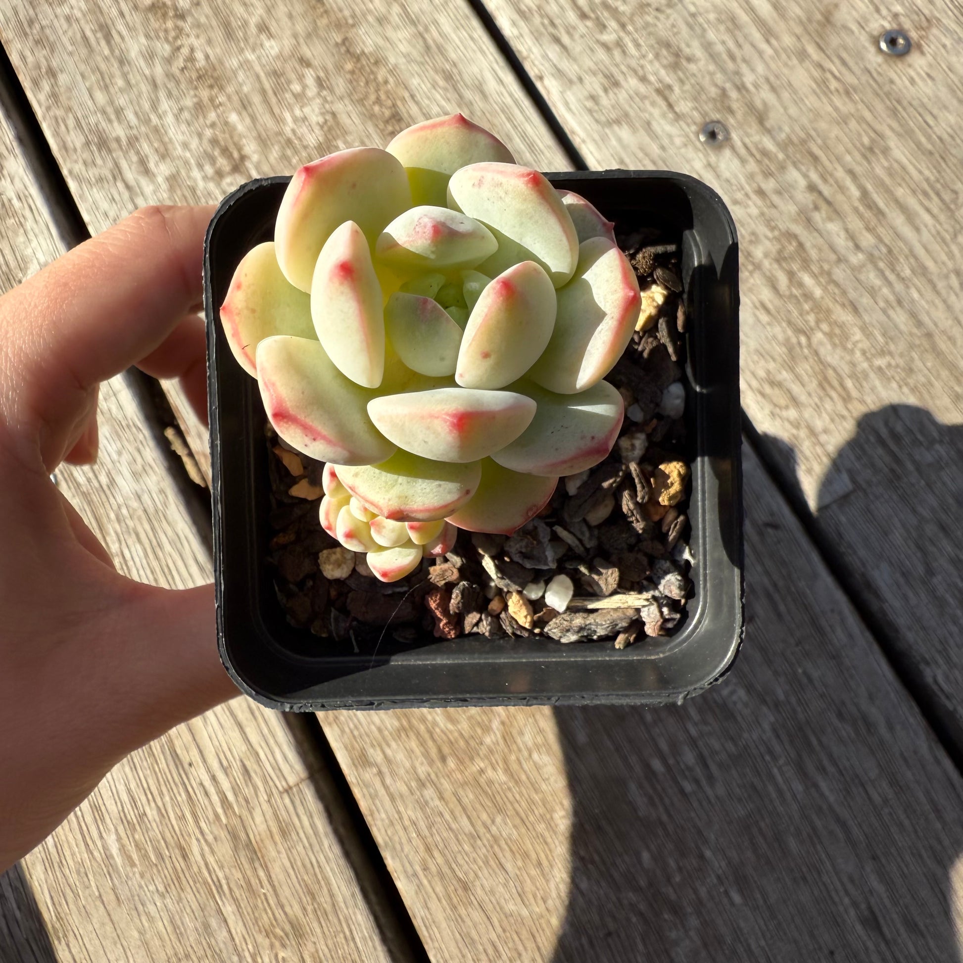 Hybrid of Echeveria derenbergi and Sedum clavatum. When grown well, it will form a compact rosette with red edge. Prefers full sun.