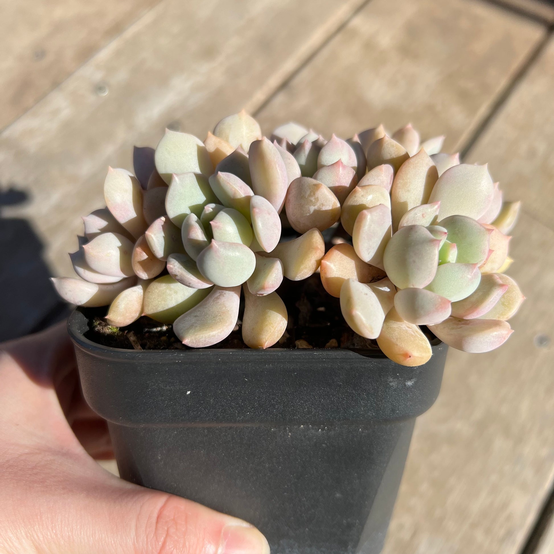 This varity has pale green leaves with dainty pink tips. Stresses to yellow/orange. Prefers full sun.