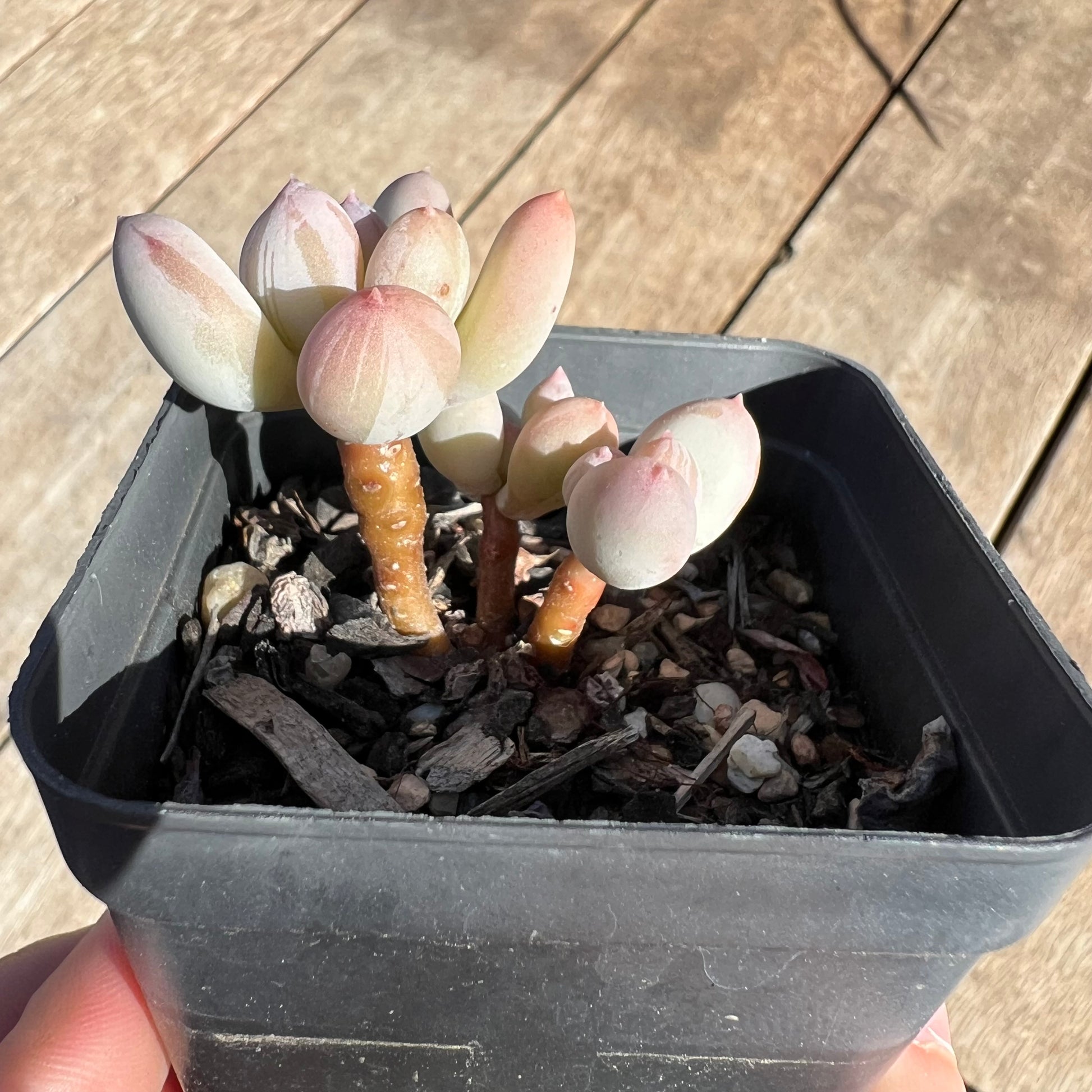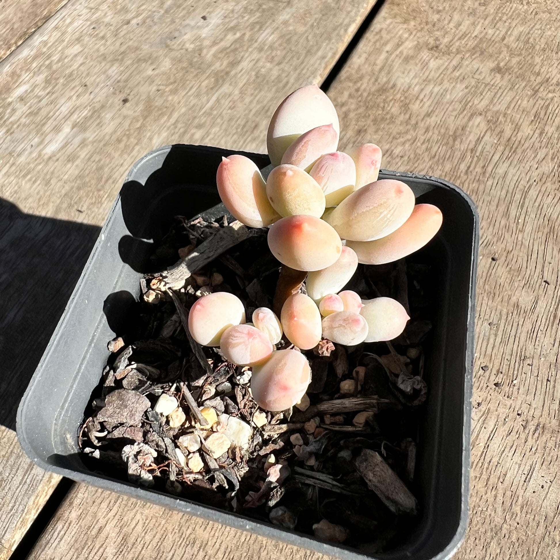 Pachyphytum Oviferum Mikadukibijin has powdery oval shaped leaves, with a pointy pink tip. Stressed to pale yellow/orange. Prefers full sun.