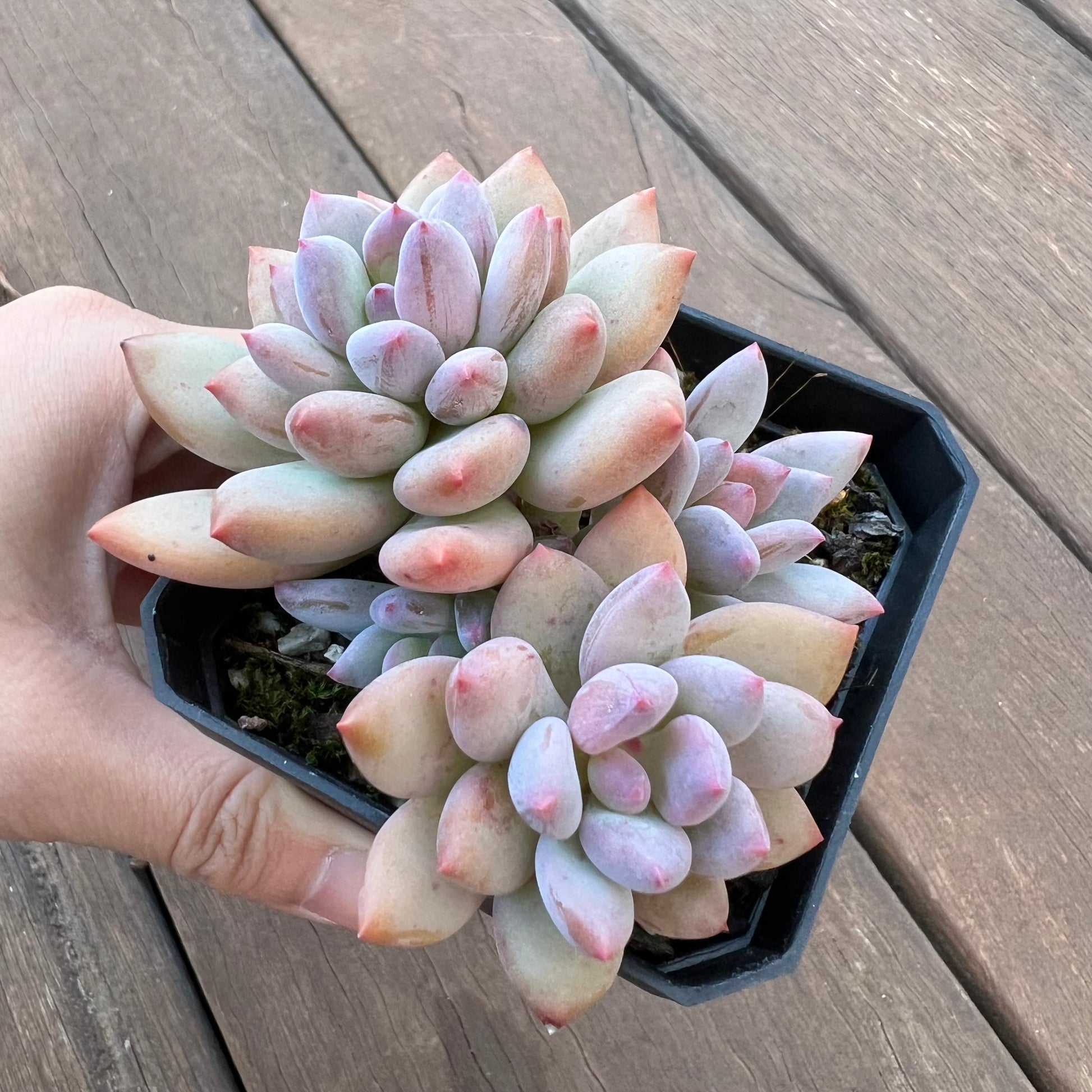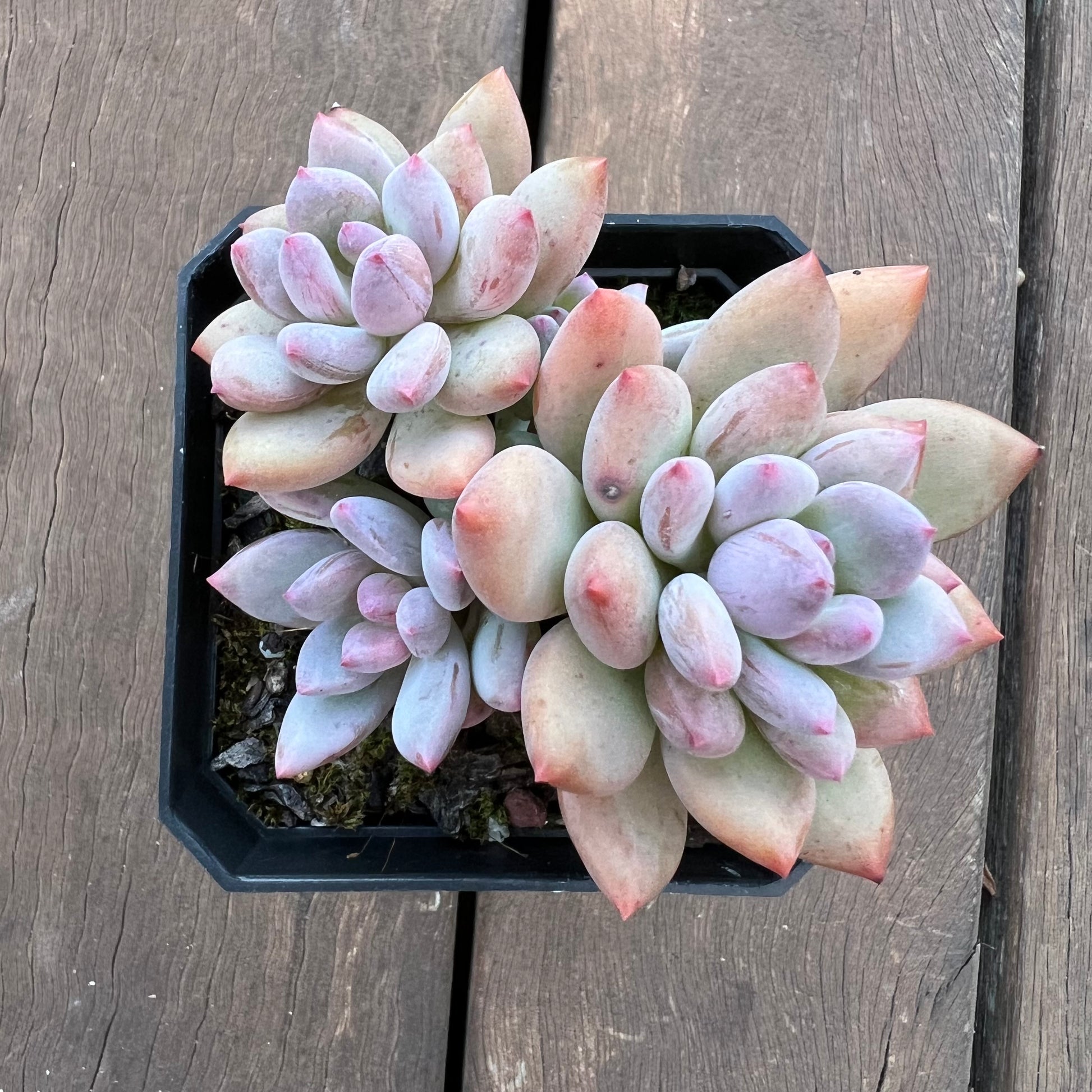 Pachyveria Virgo has pointed blue leaves with red tips when stressed. Prefers full sun.