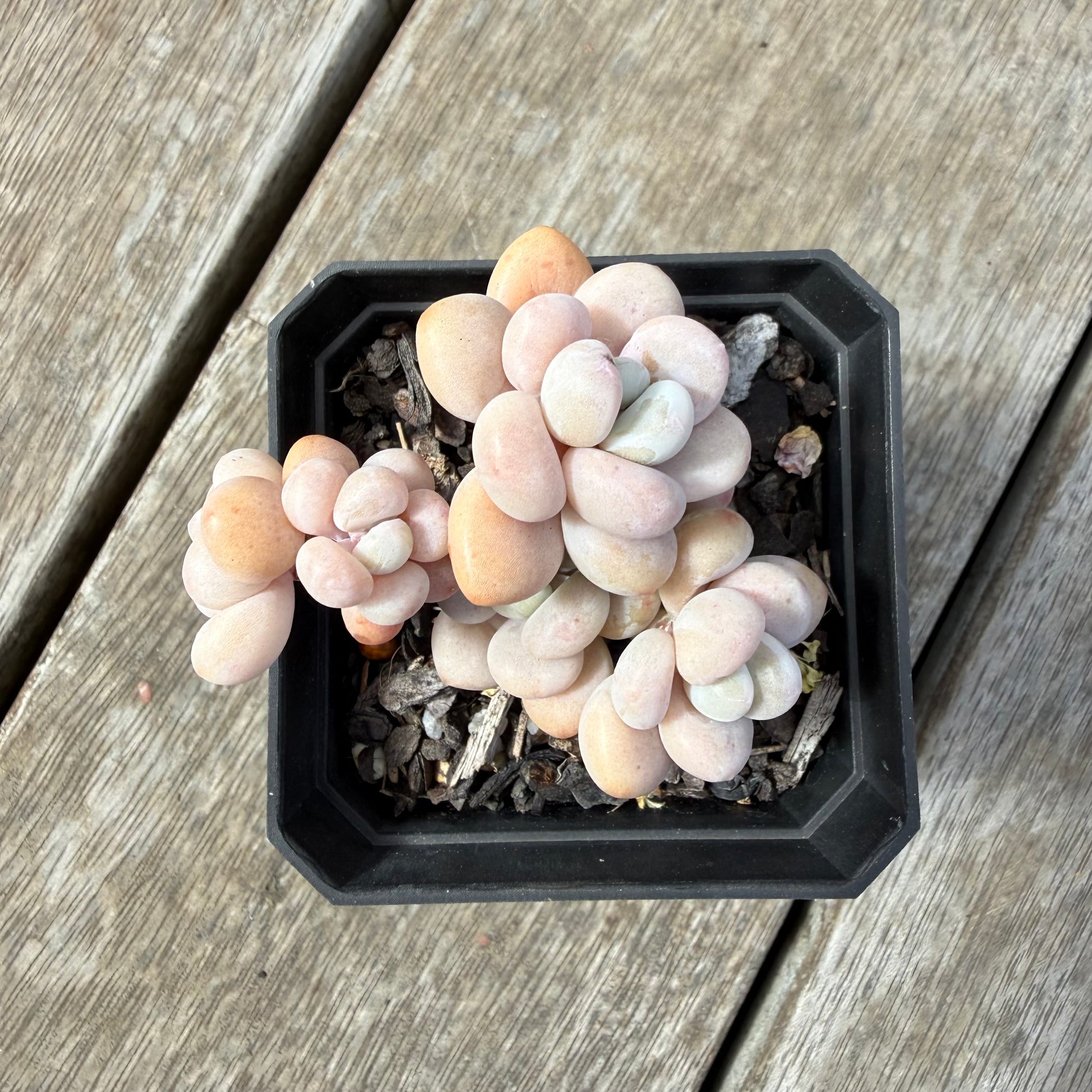 Graptoveria Miul has chubby leaves. Easily stressed to peach/orange/pink. Prefers full sun.
