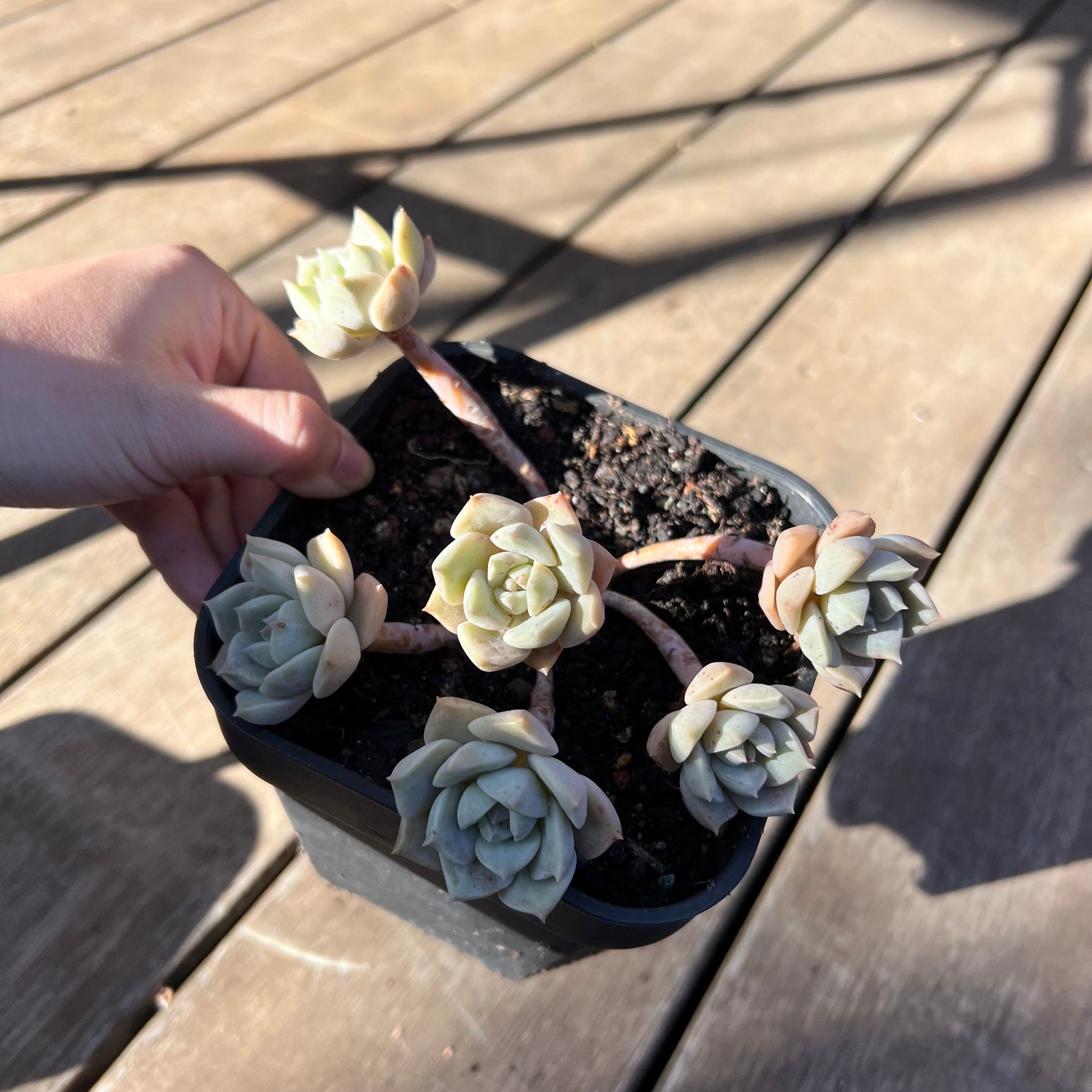 Hybrid of Graptopetalum paraguayense and Echeveria derenbergii. It tends to grow stem and forms a cluster easily, stress to pink. Prefers full/partial sun.