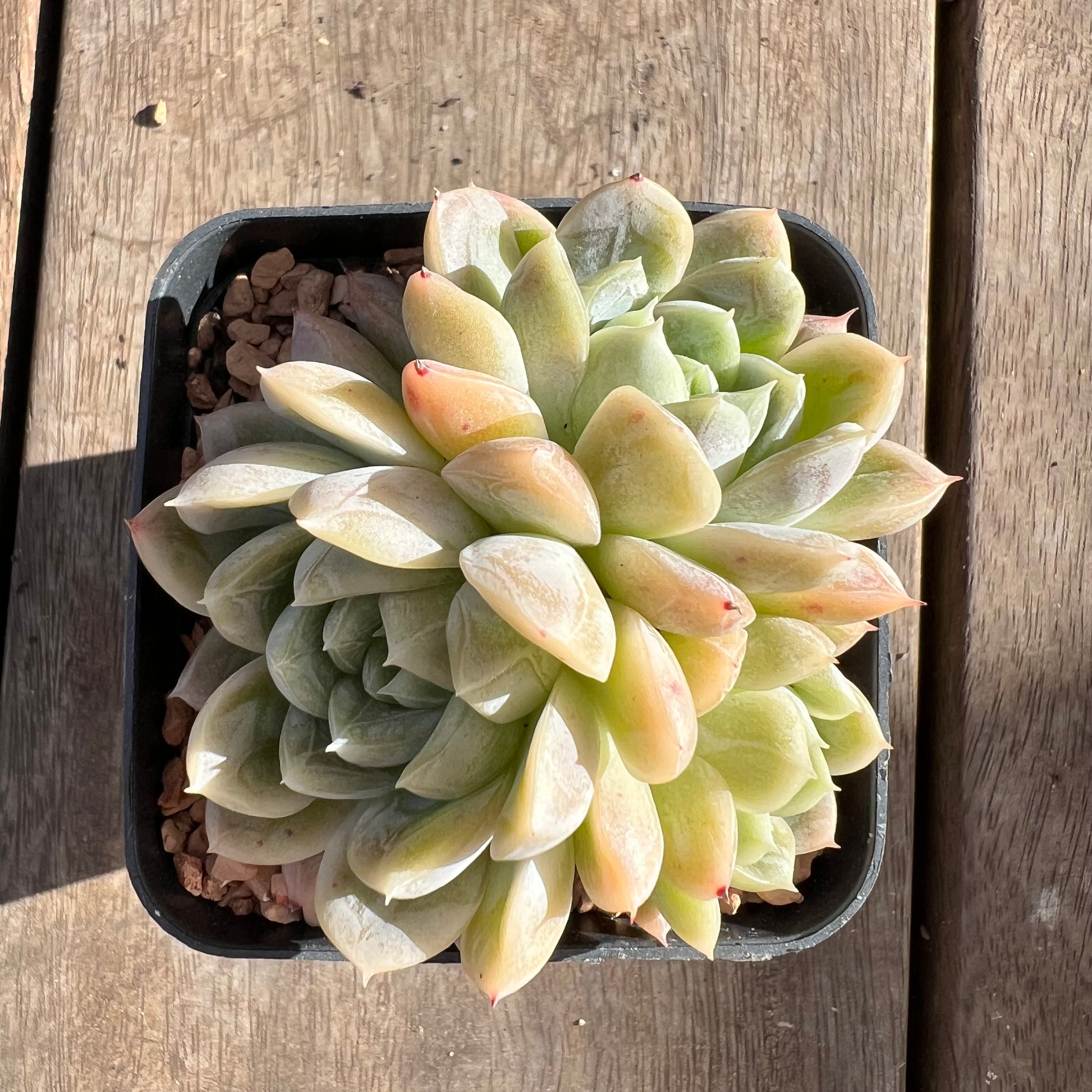 Echeveria Elsa has powdery leaves and forms white markings. Prefer full/part sun.