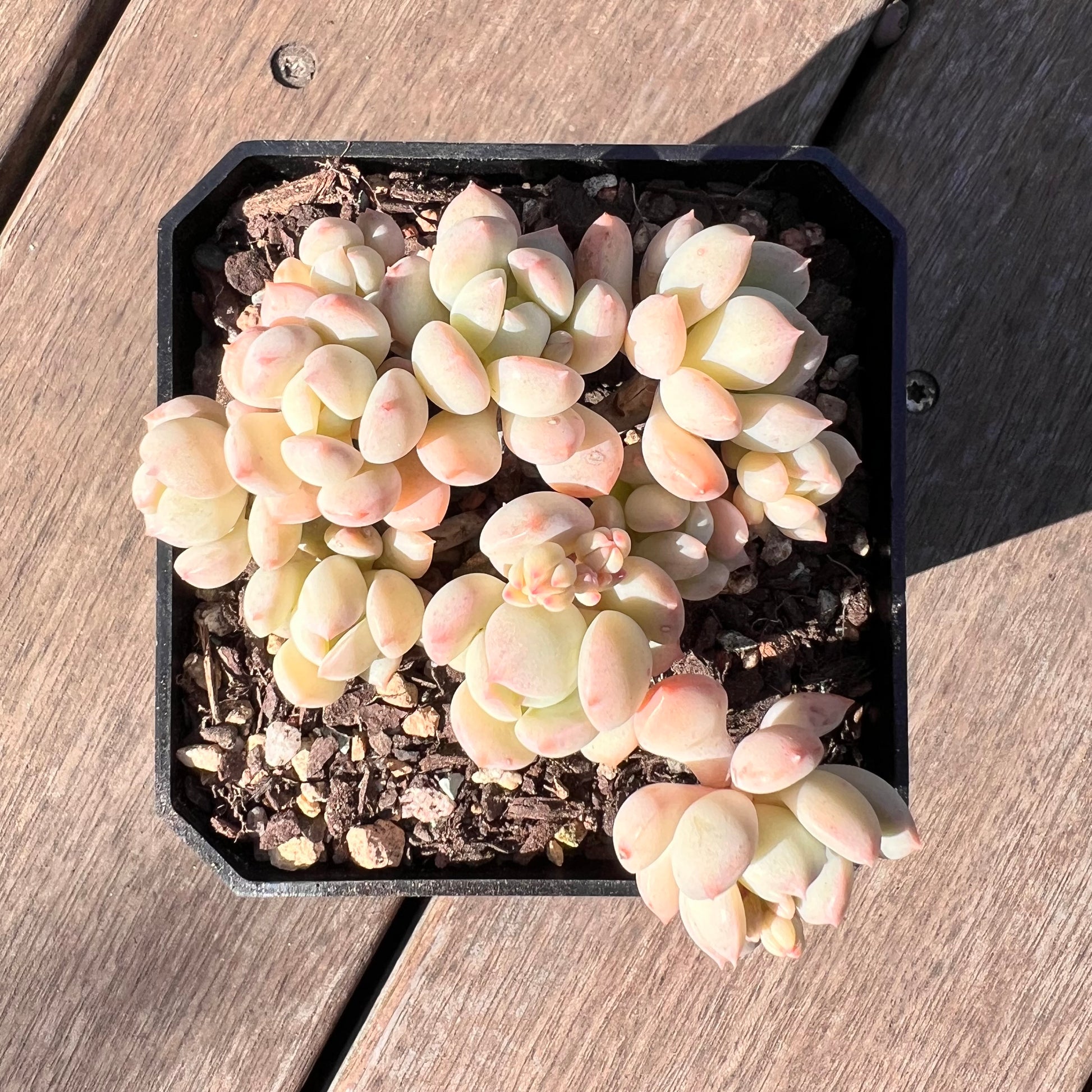 This varity has pale green leaves with dainty pink tips. Stresses to yellow/orange. Prefers full sun.