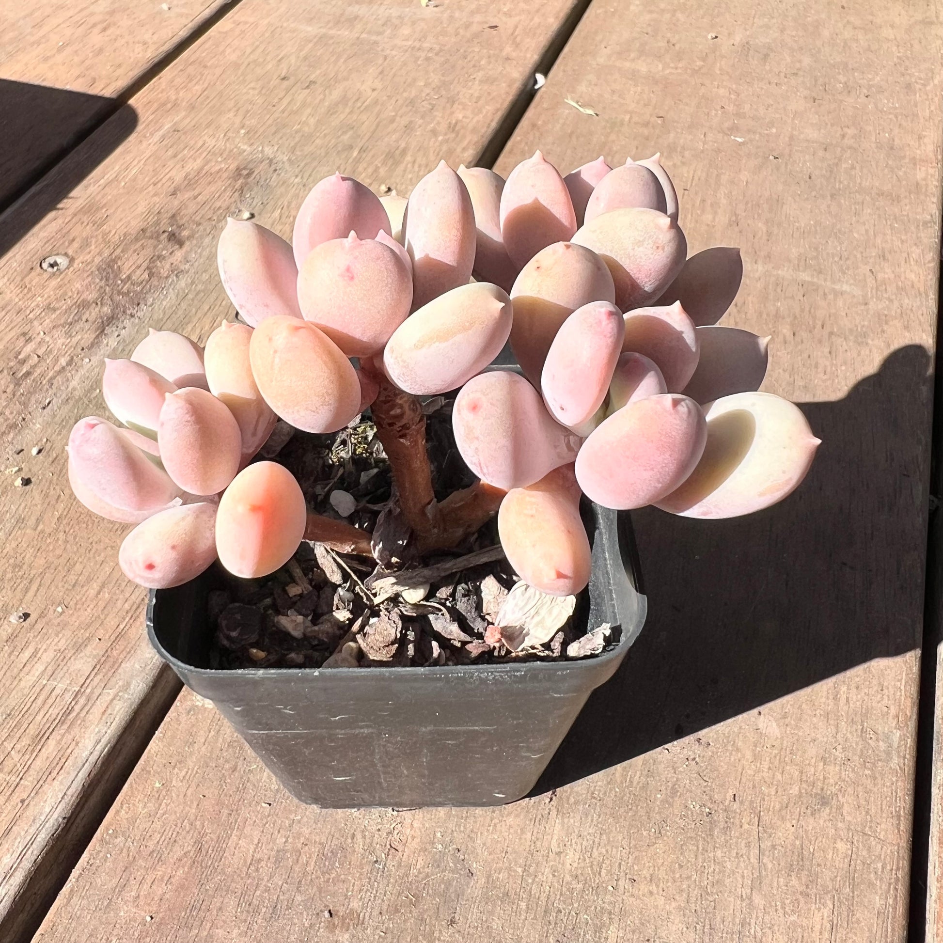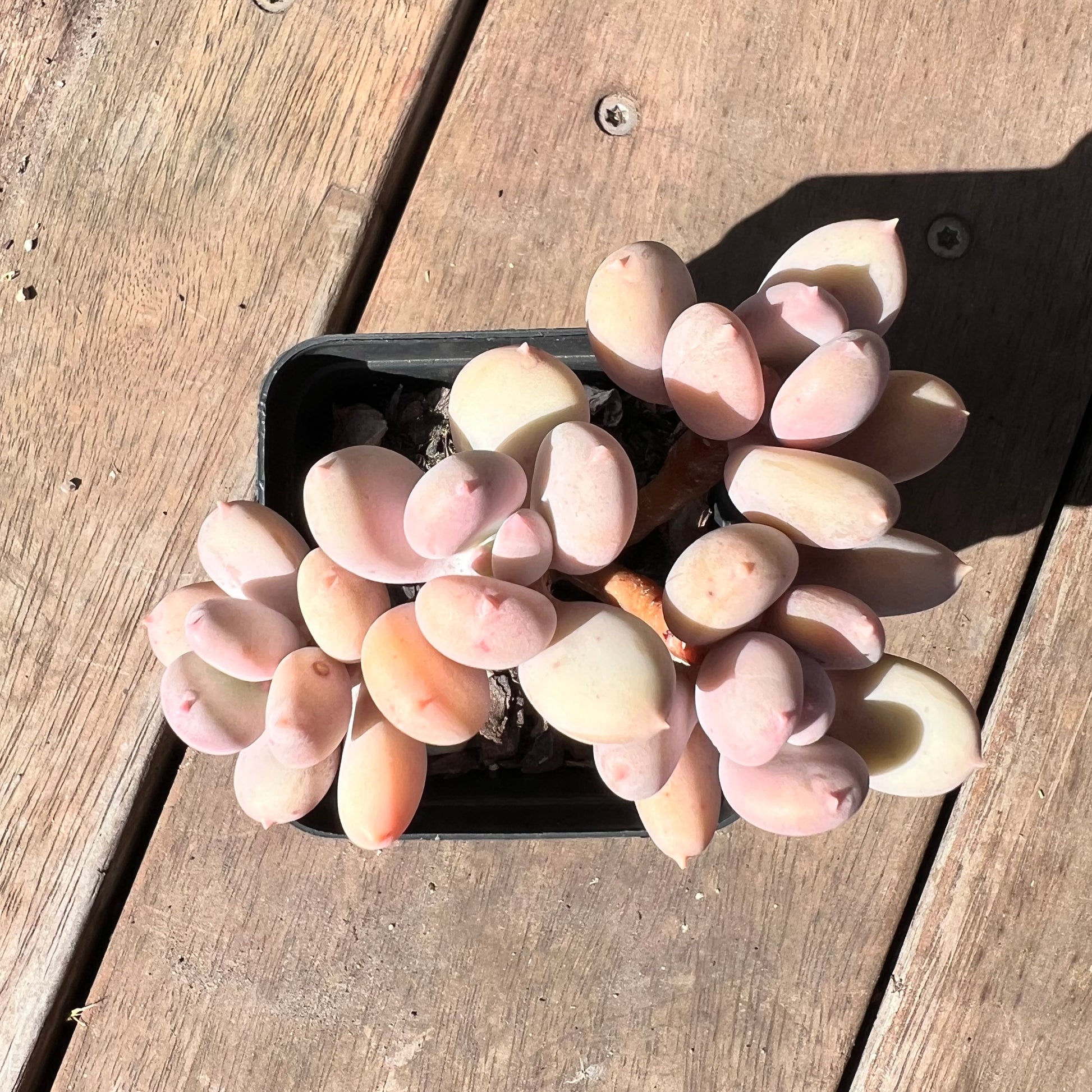 This is also called Pachyphytum Nipple, as it has a pink tip. Prefers full sun.