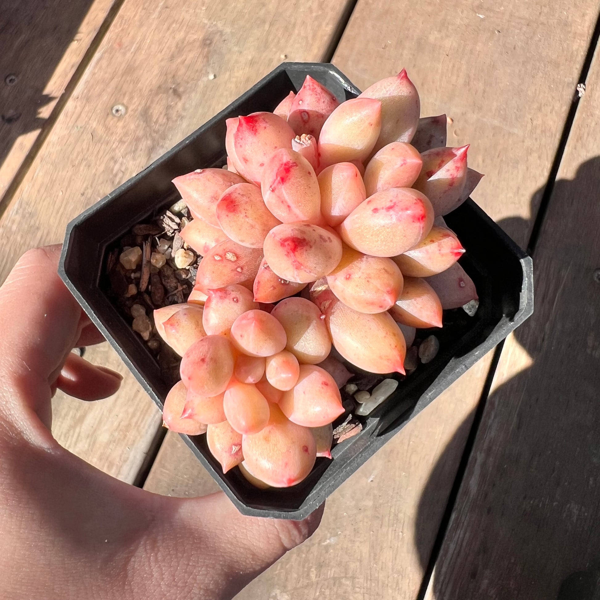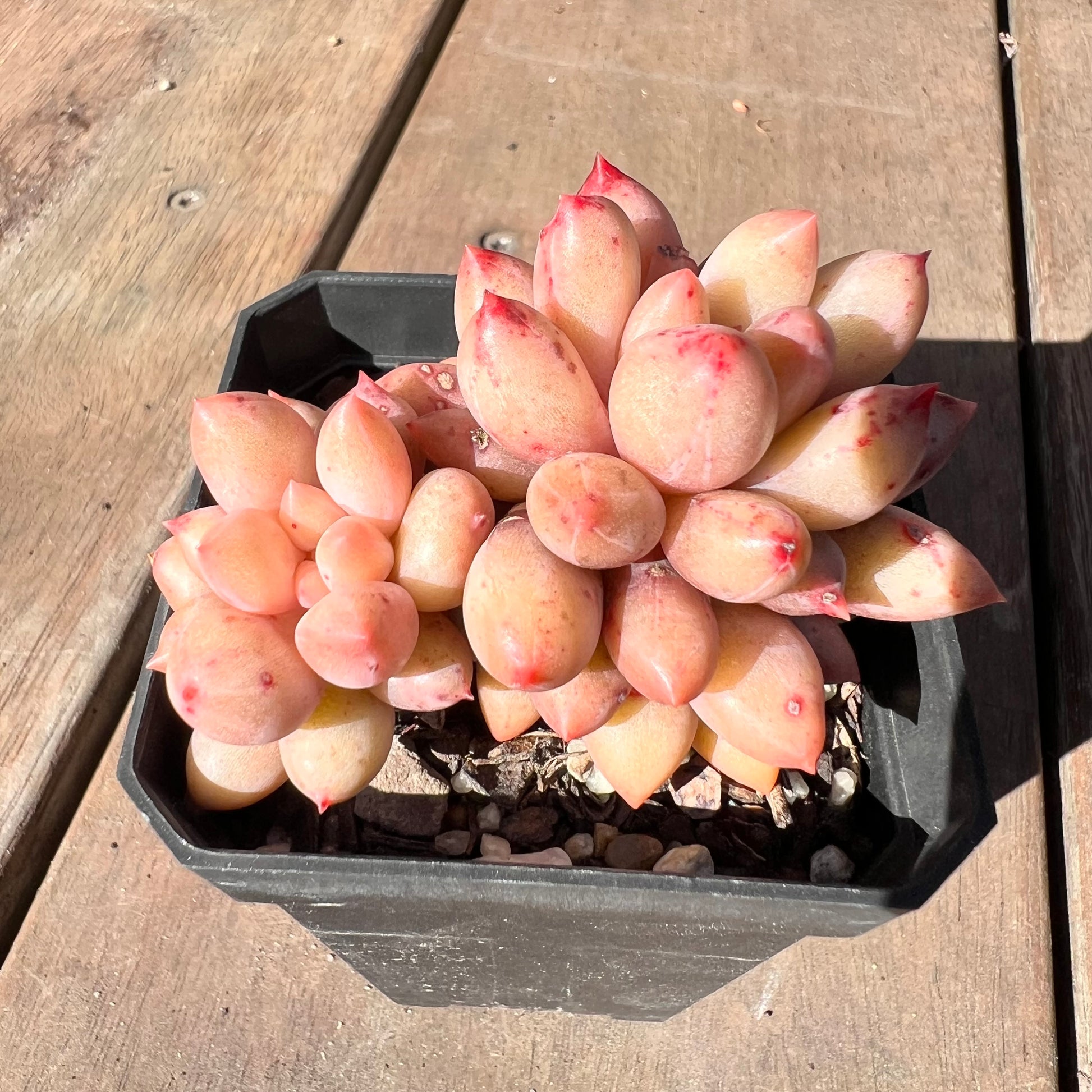 This is a classic variety with pointed grey-pink leaves that tips stress to bright pink when stressed. Prefers full sun.