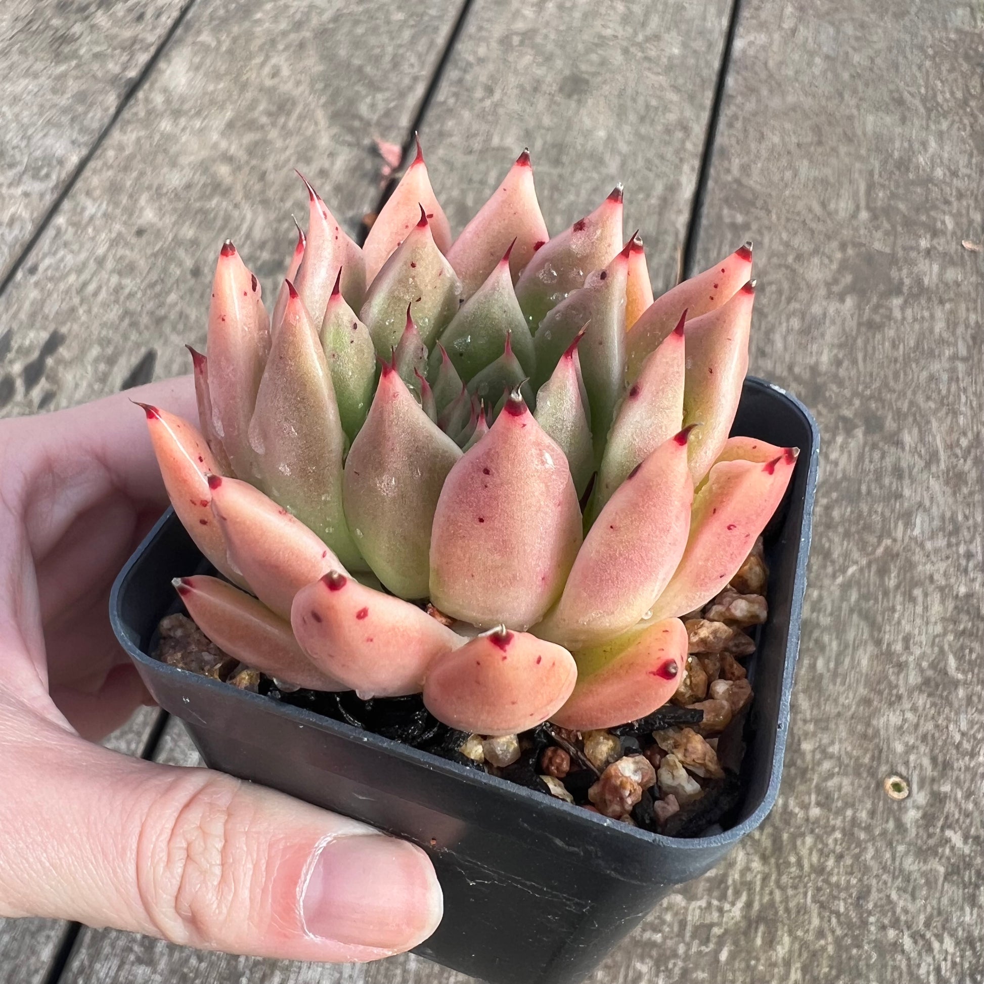 This is a hybrid of Echeveria Agavoides and Echeveria Malgan. It has shiny and slightly translucent leaves that stress to orange with red tips. Forms blood speckles occasionally. Prefers full sun.