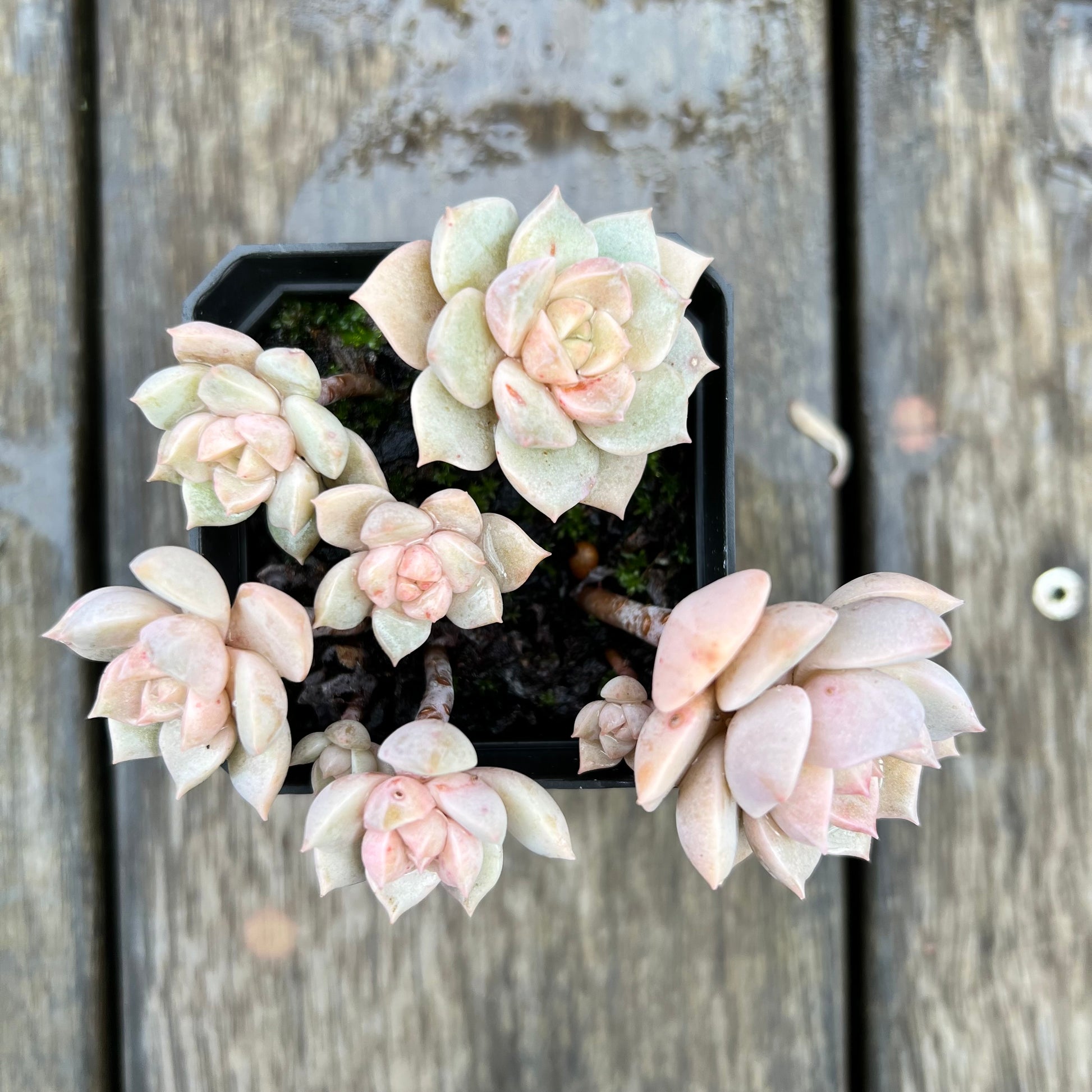 Hybrid of Graptopetalum paraguayense and Echeveria derenbergii. It tends to grow stem and forms a cluster easily, stress to pink. Prefers full/partial sun.