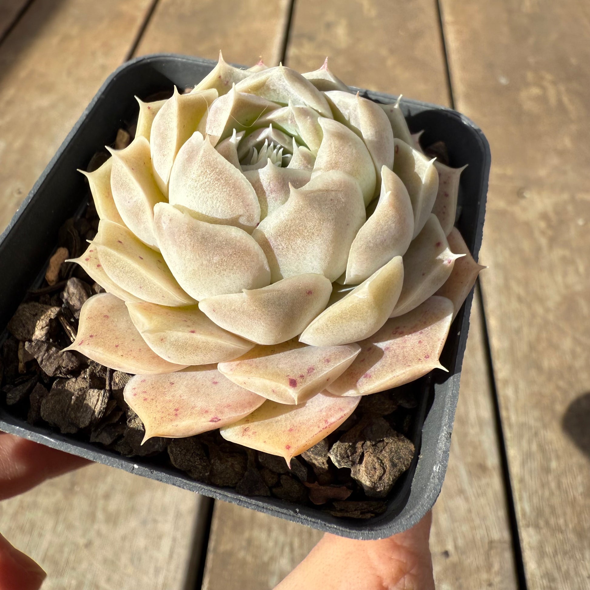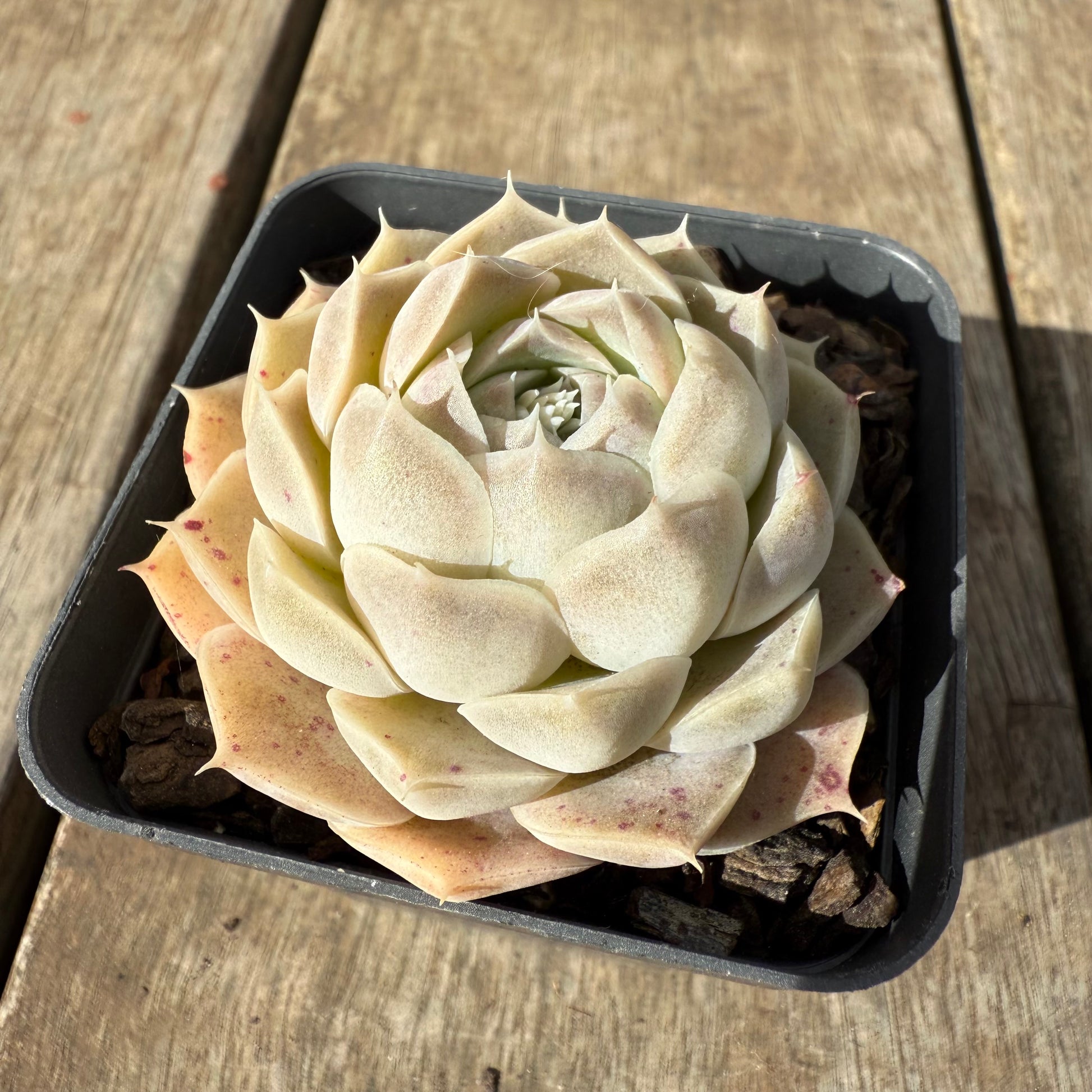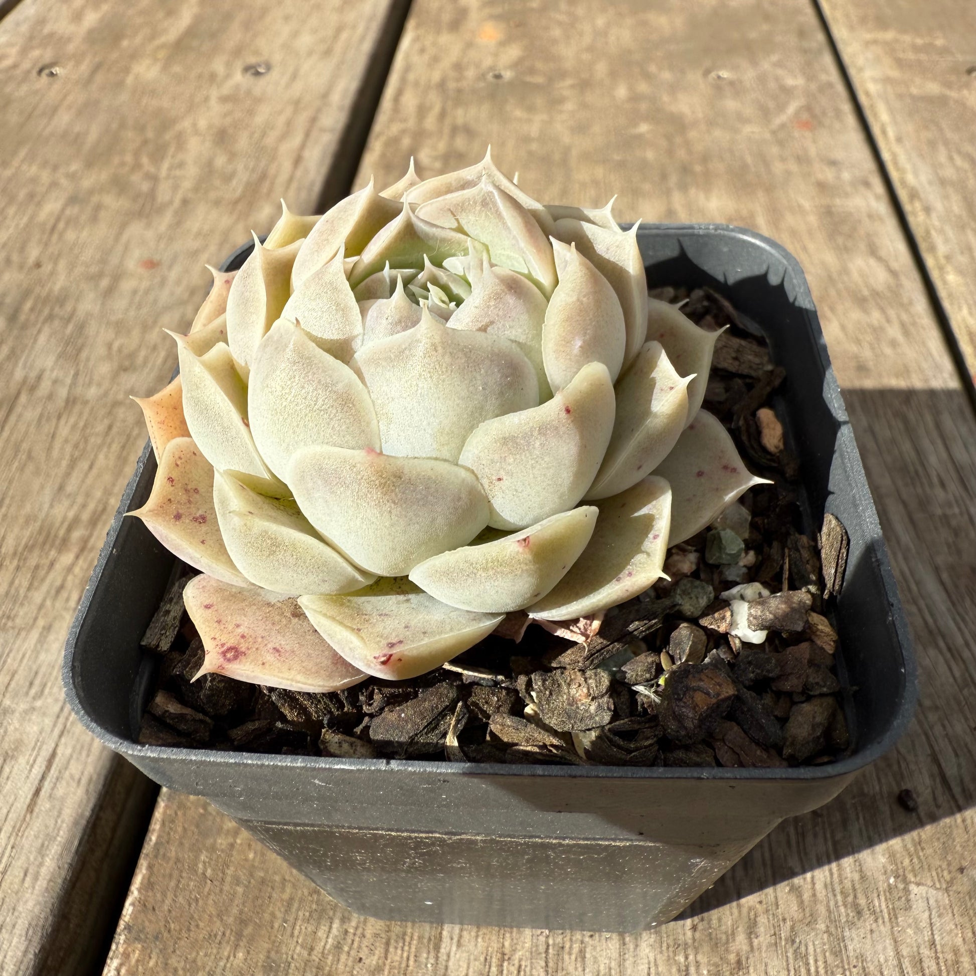 Echeveria Lilo has chubby white leaves that forms a symmetric rosette, and its tips curve inwards. Prefers full sun.