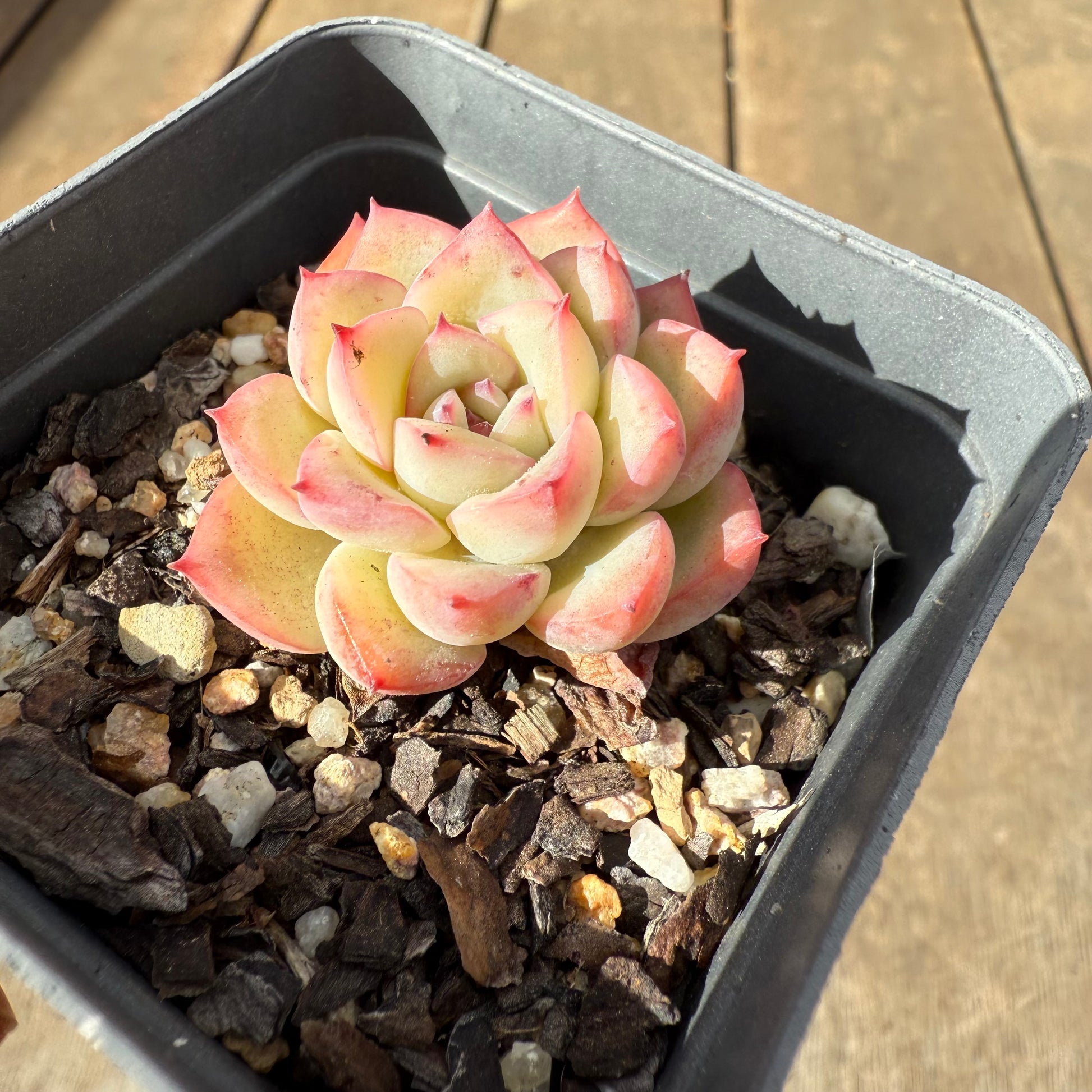 Echeveria Strawberry Cake has chubby leaves with pink edges. This variety is similar to E.Strawberry puff with more pointy and angular leaves. Prefer full sun.