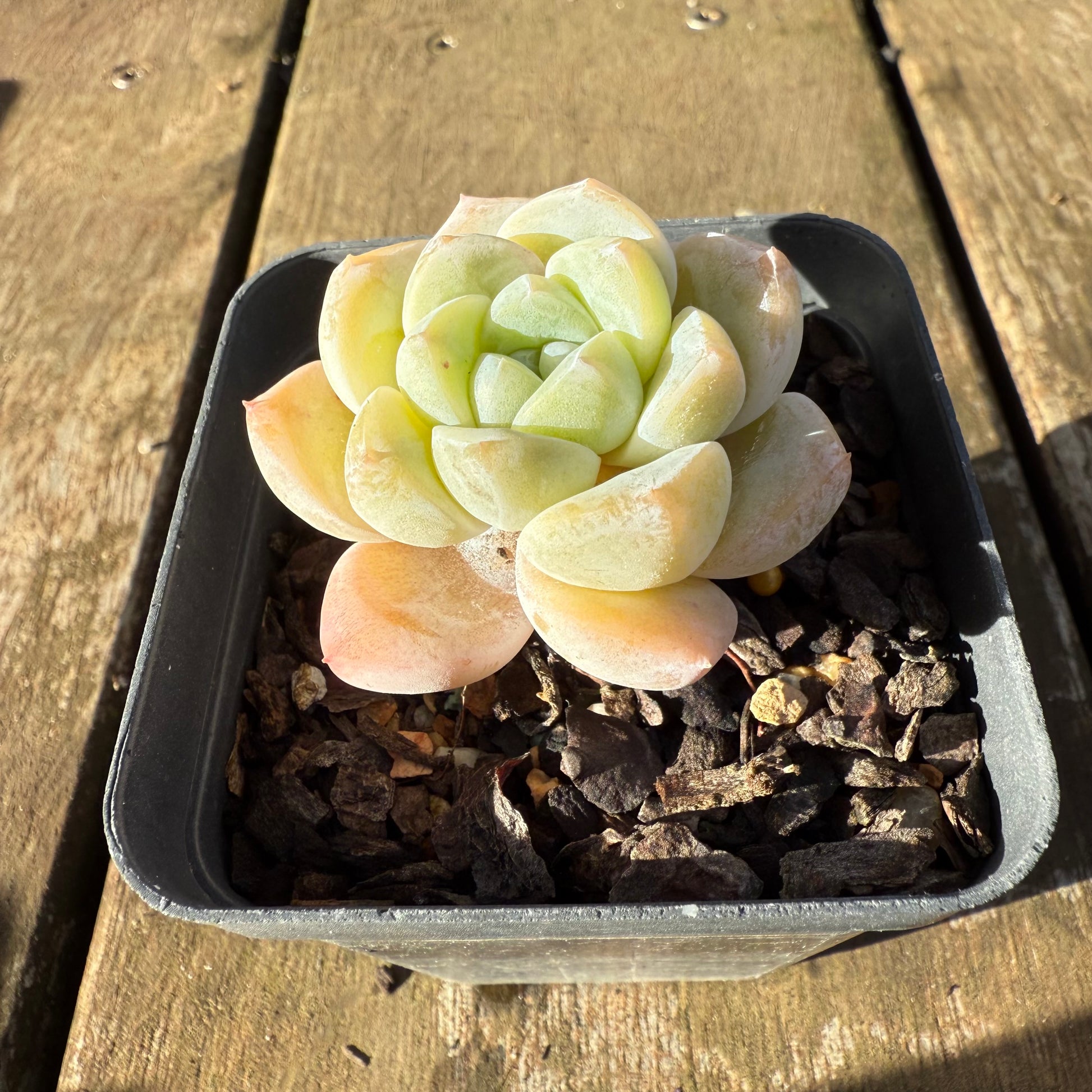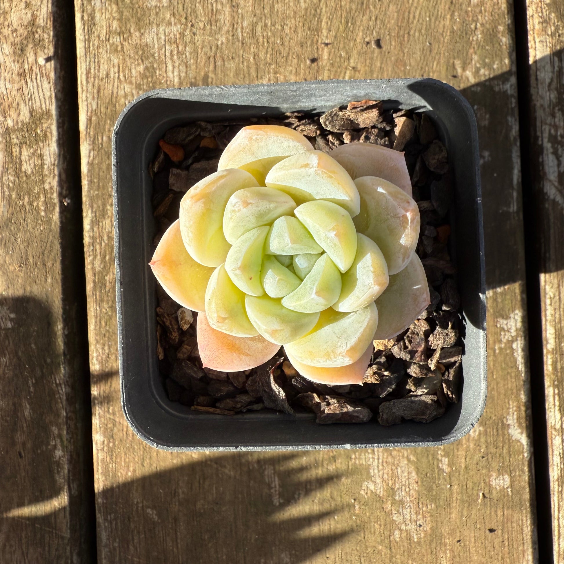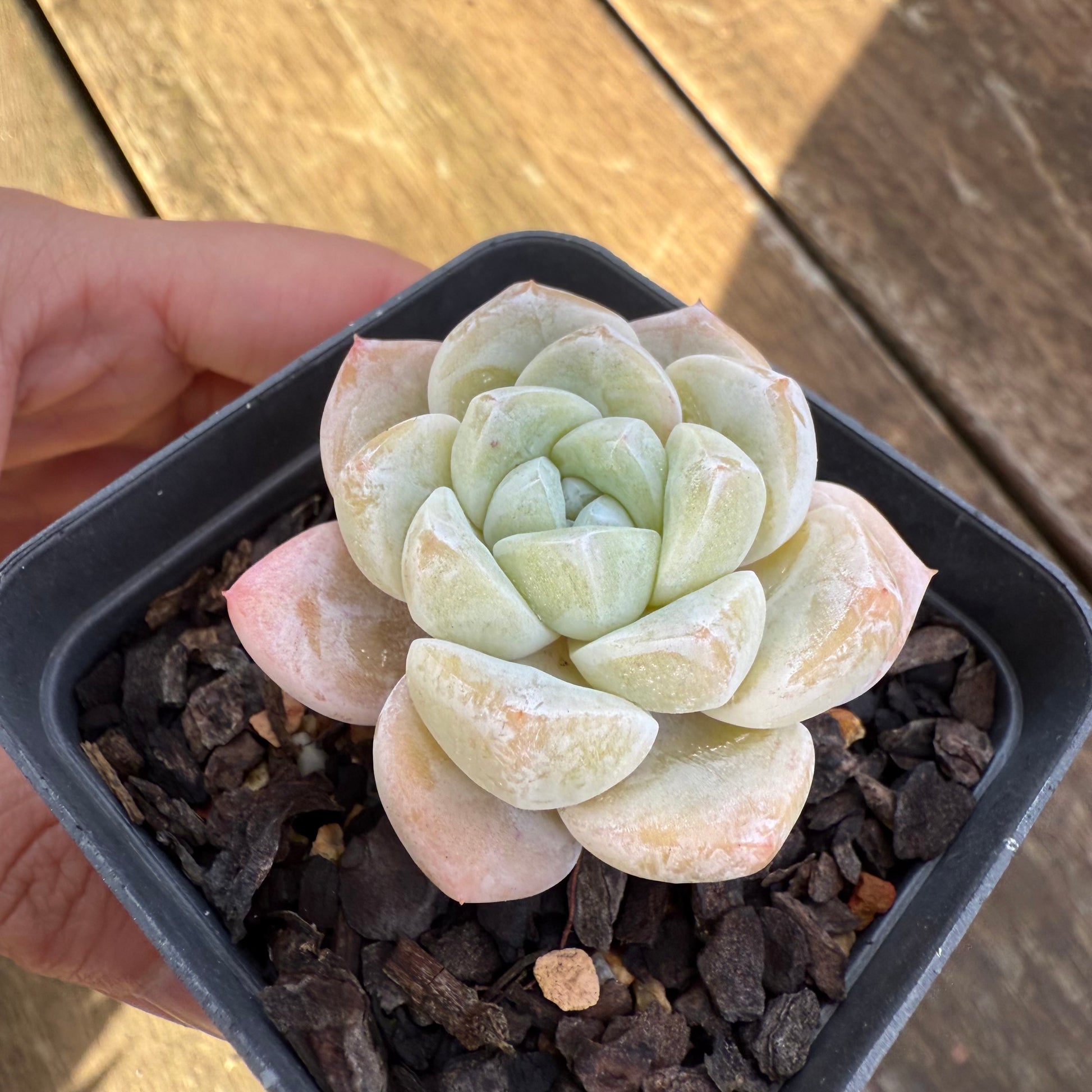 A delicate chubby succulent that forms beautiful white markings on its leaves when grown well. When stressed it will turn semi-translucent yellow/pink. Always water from bottom to avoid water sitting between its leaves. Prefer full/partial sun.