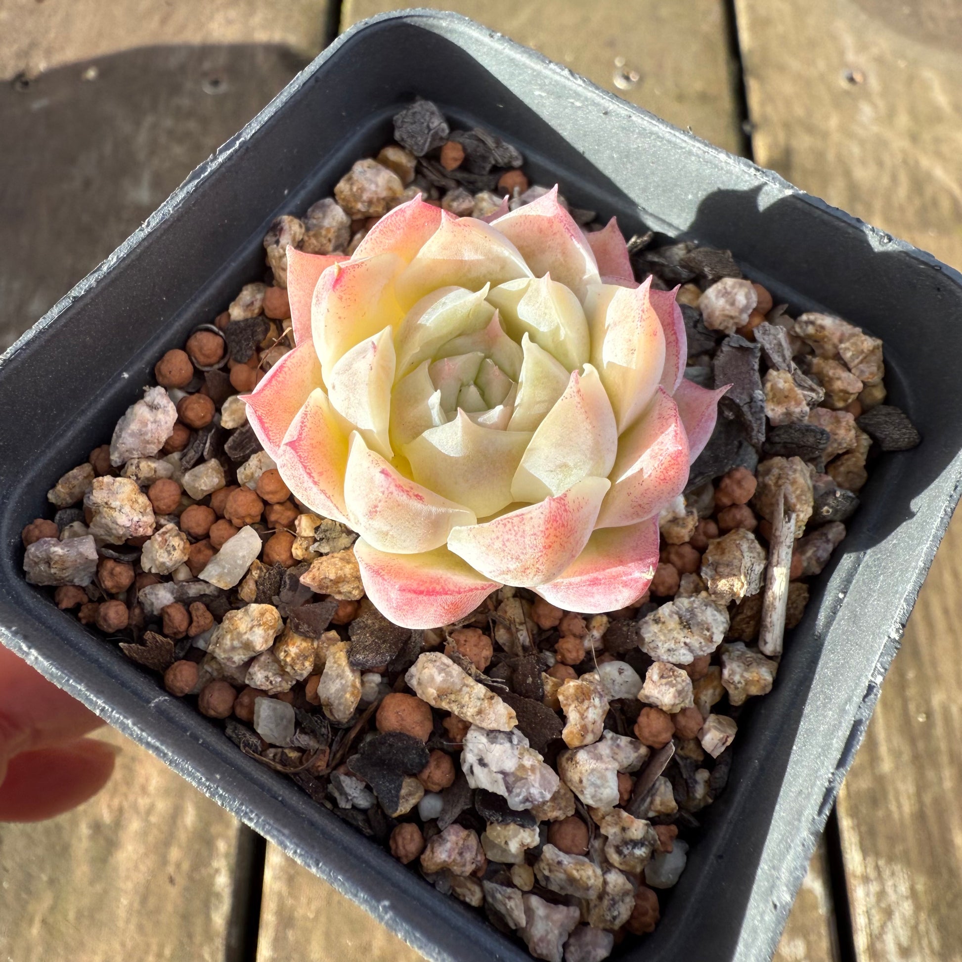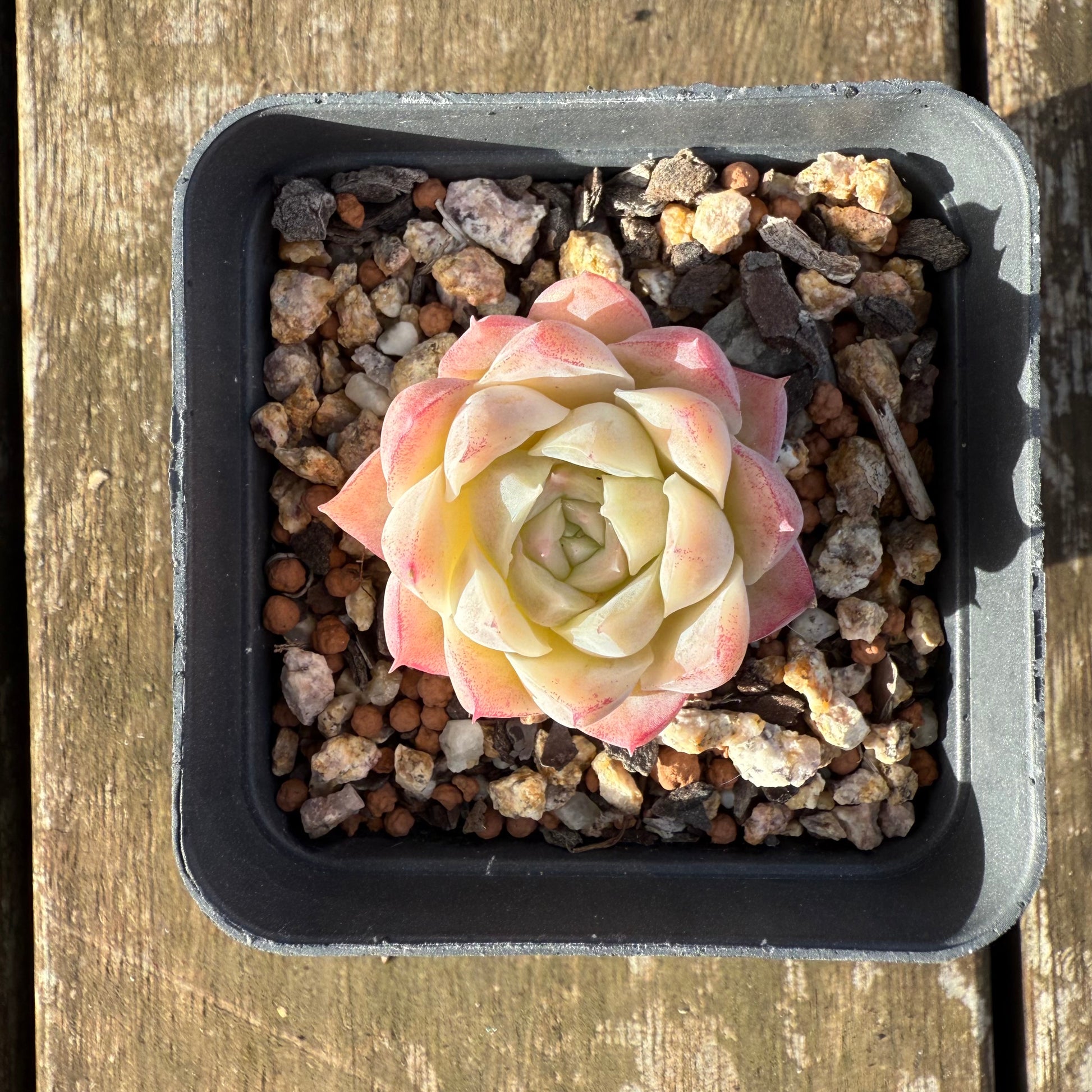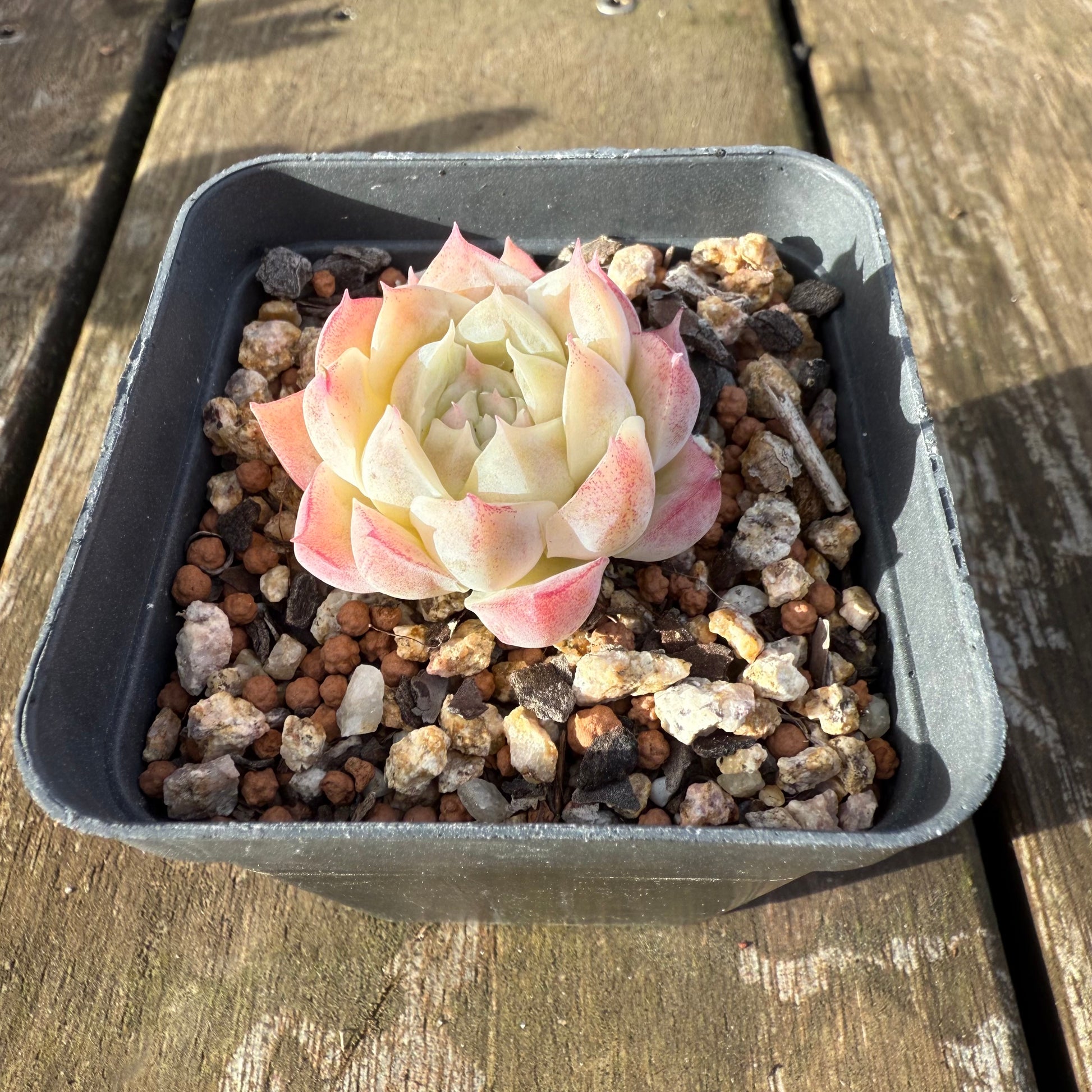 Echeveria 'Peach Queen' has pink leaves and pink speckles formed on its outer leaves. Prefers full sun.