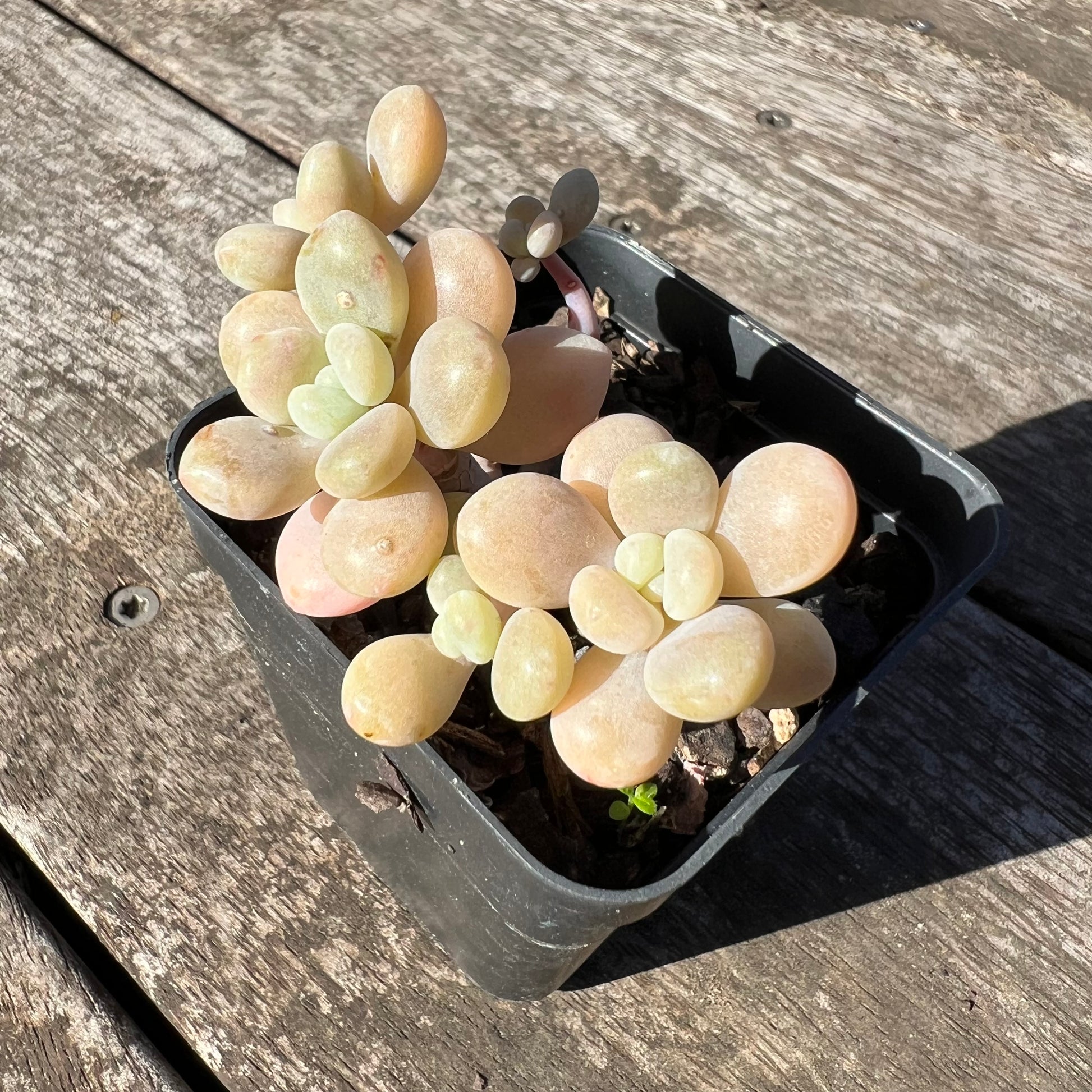 Graptoveria Miul has chubby leaves. Easily stressed to peach/orange/pink. Prefers full sun.