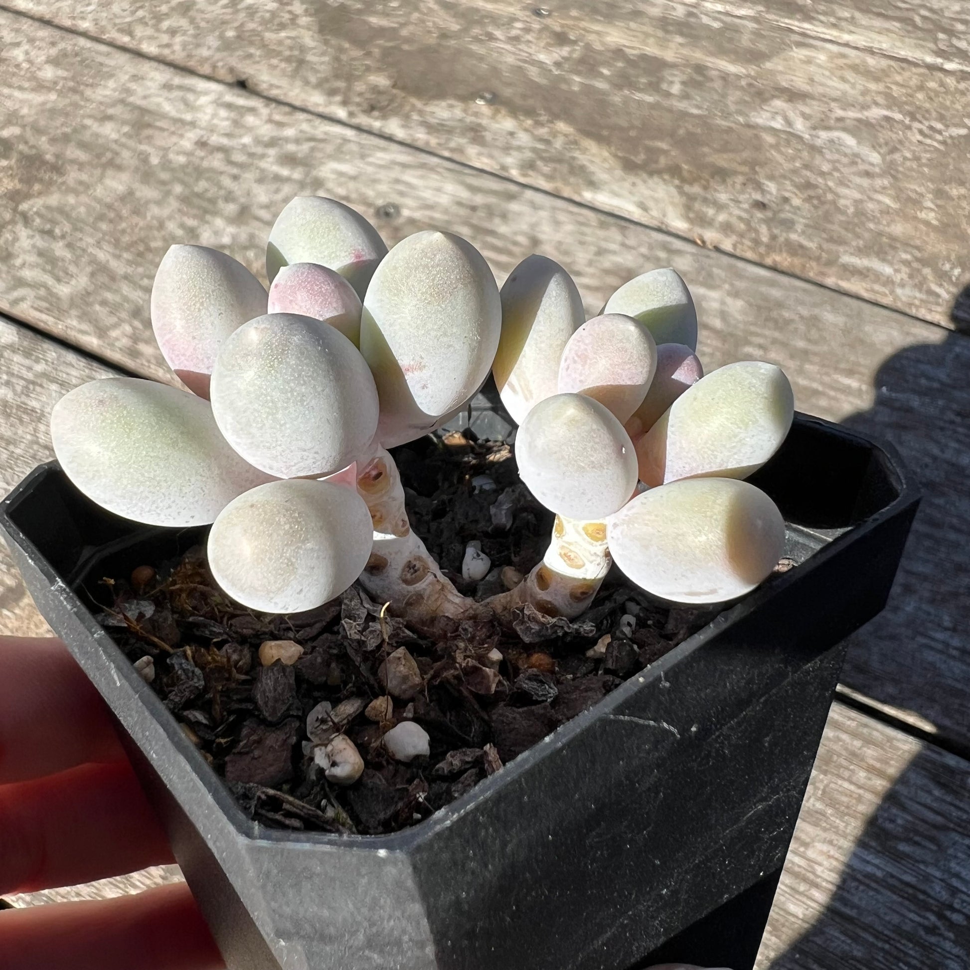 This is possibly the hybrid of Pachyphytum Oviferum x Pachyphytum Baby Finger. It shares a similar look with baby finger but appears to be in a more yellow tone rather than blue. When stressed it can become orange/pink/yellow. Prefers full sun.