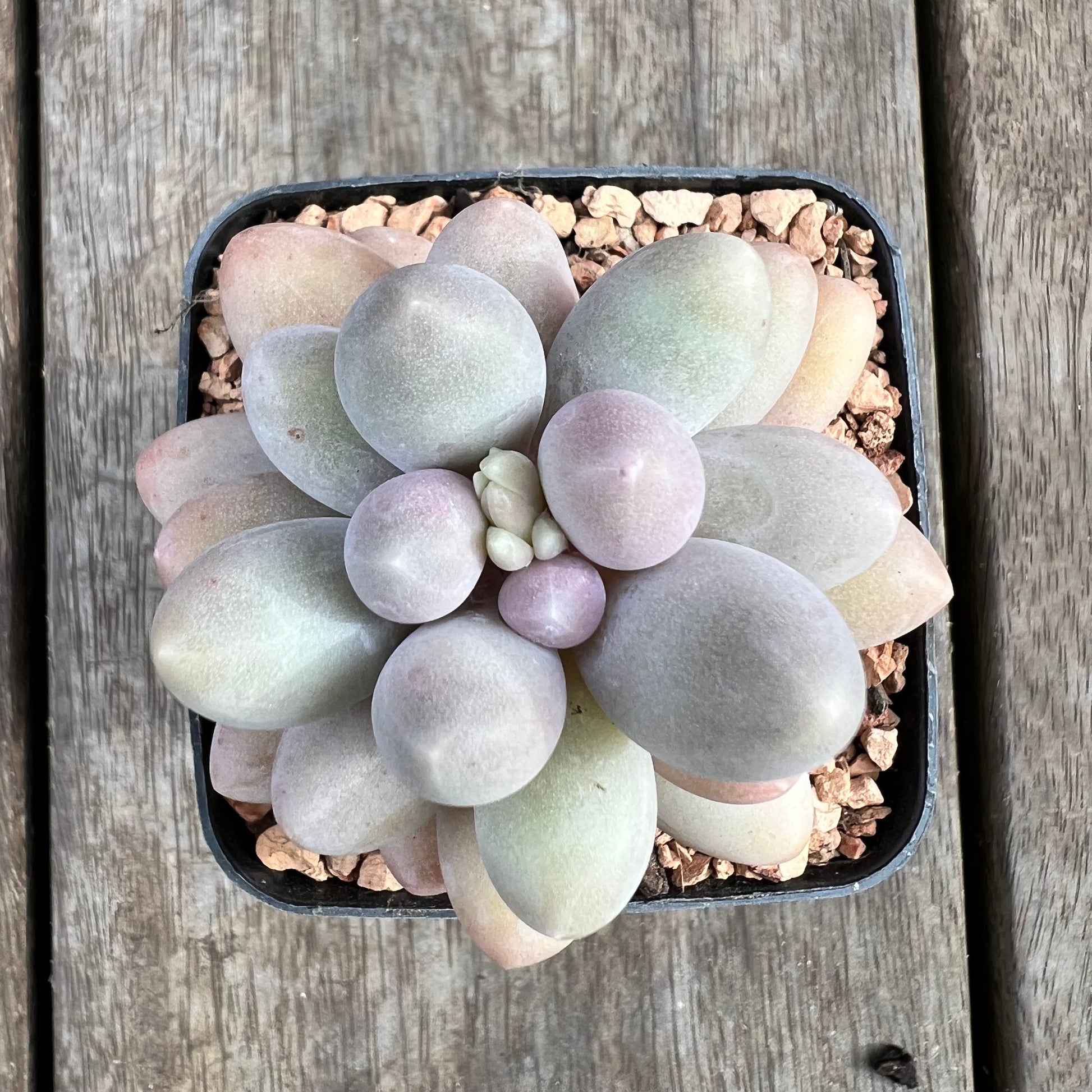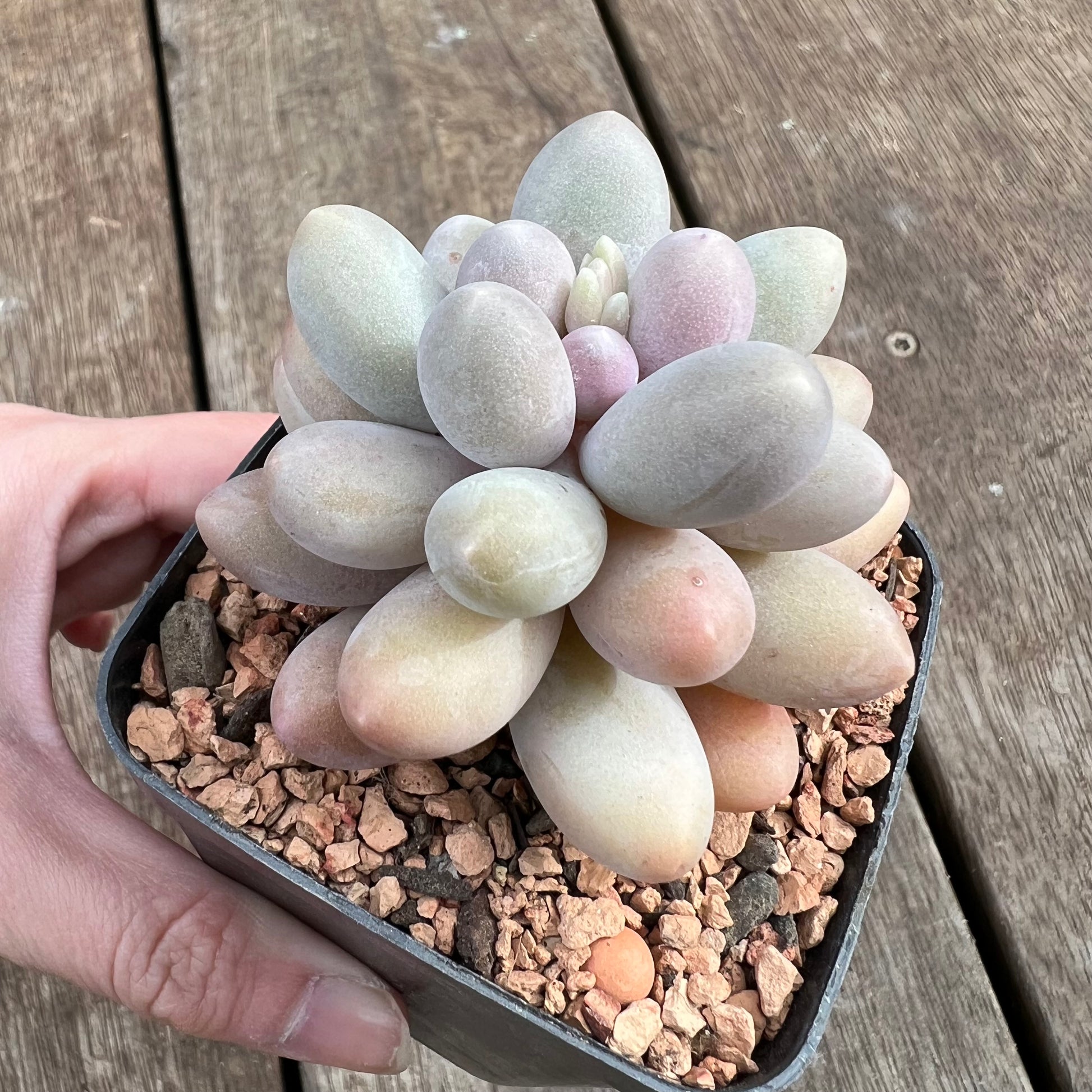 This is possibly the hybrid of Pachyphytum Oviferum x Pachyphytum Baby Finger. It shares a similar look with baby finger but appears to be in a more yellow tone rather than blue. When stressed it can become orange/pink/yellow. Prefers full sun.