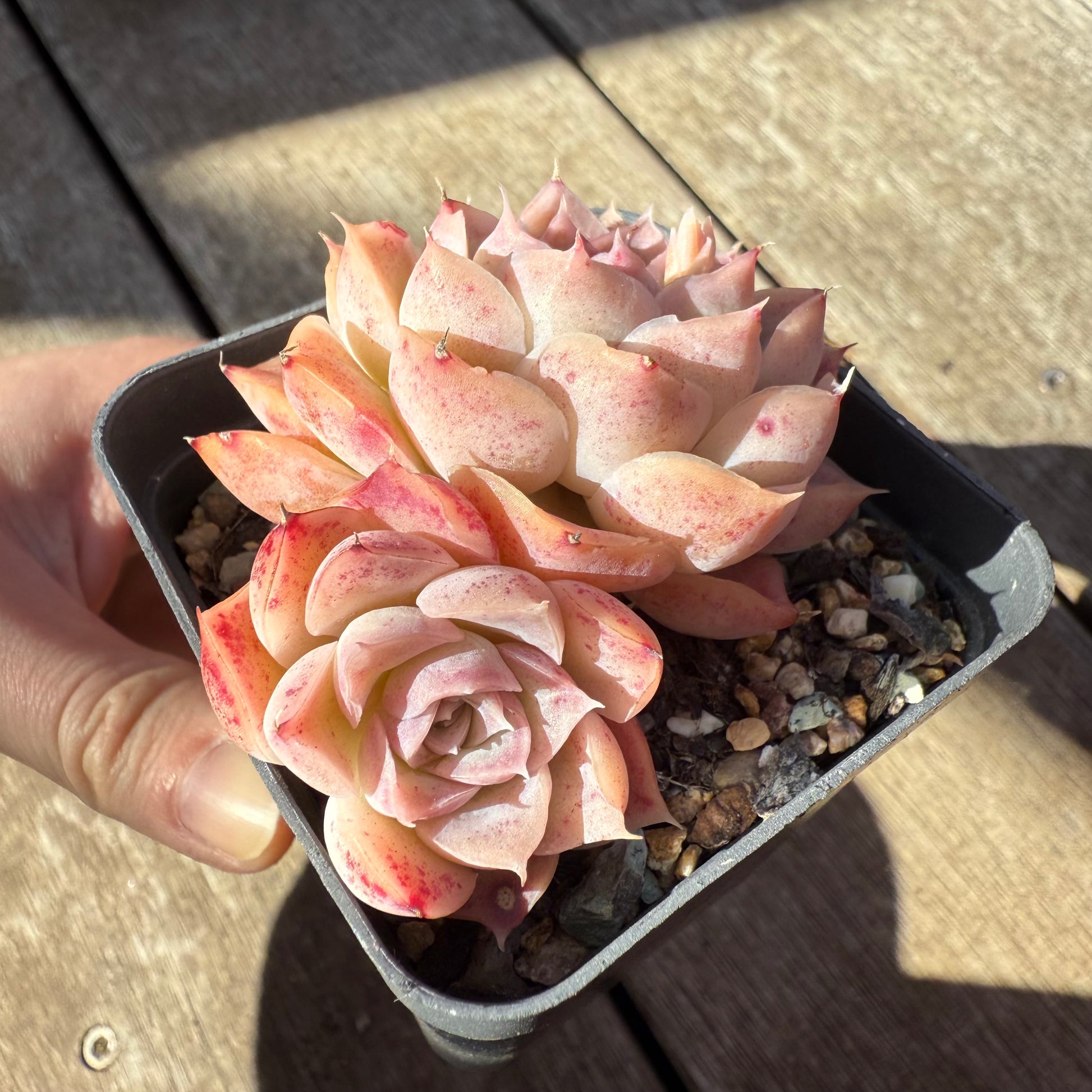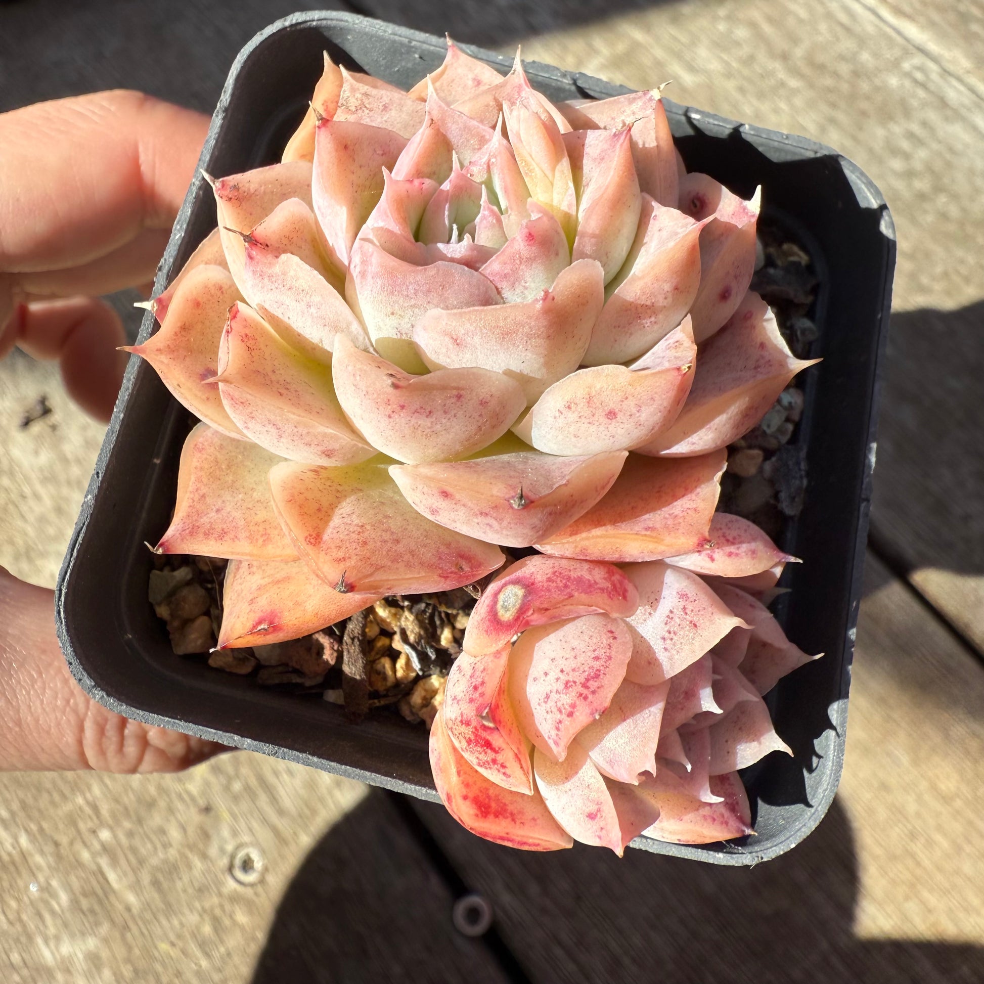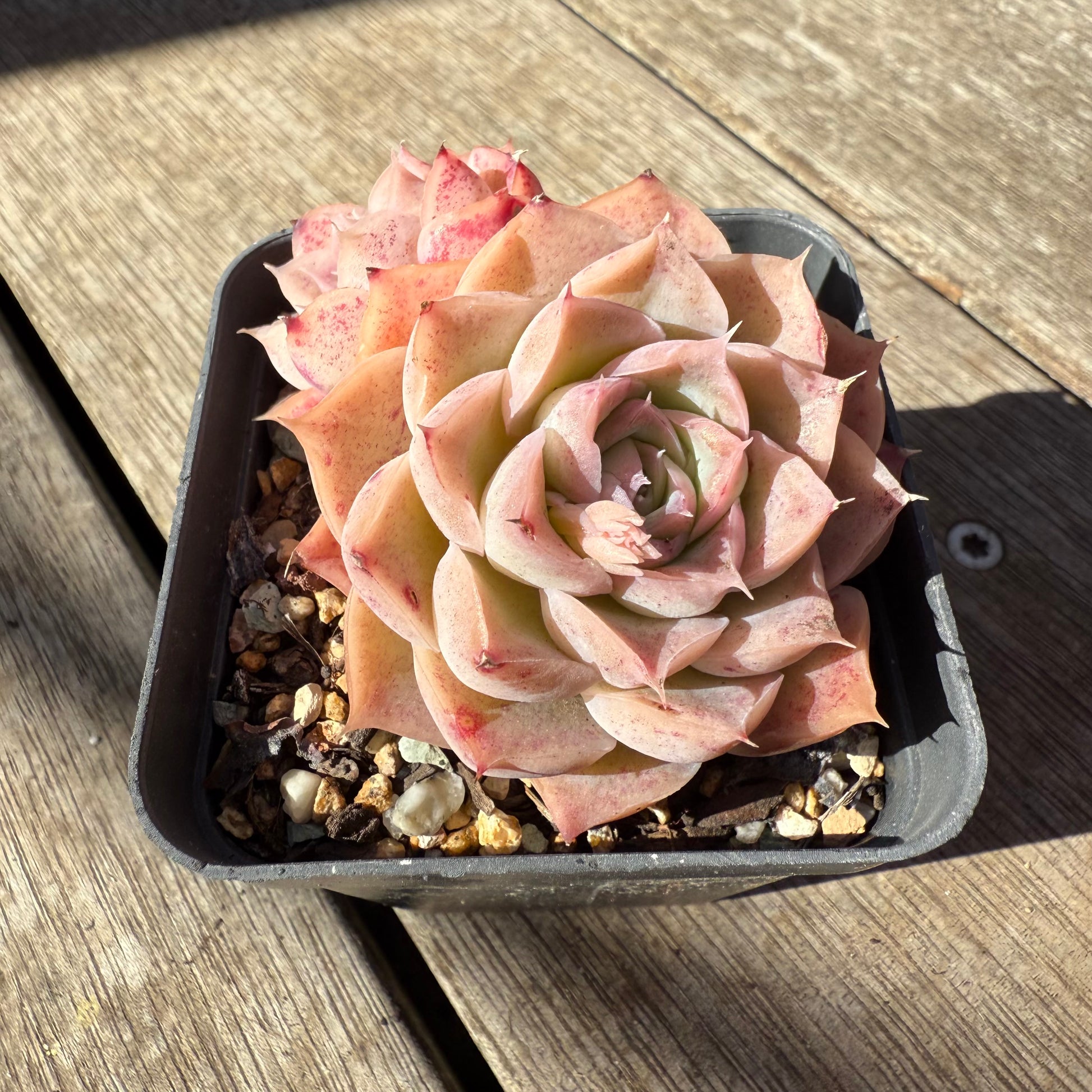 This is a hybrid of E.Hyalina created by us. It forms red speckles on its outer leaves and pink/purple centre. Prefers full sun.