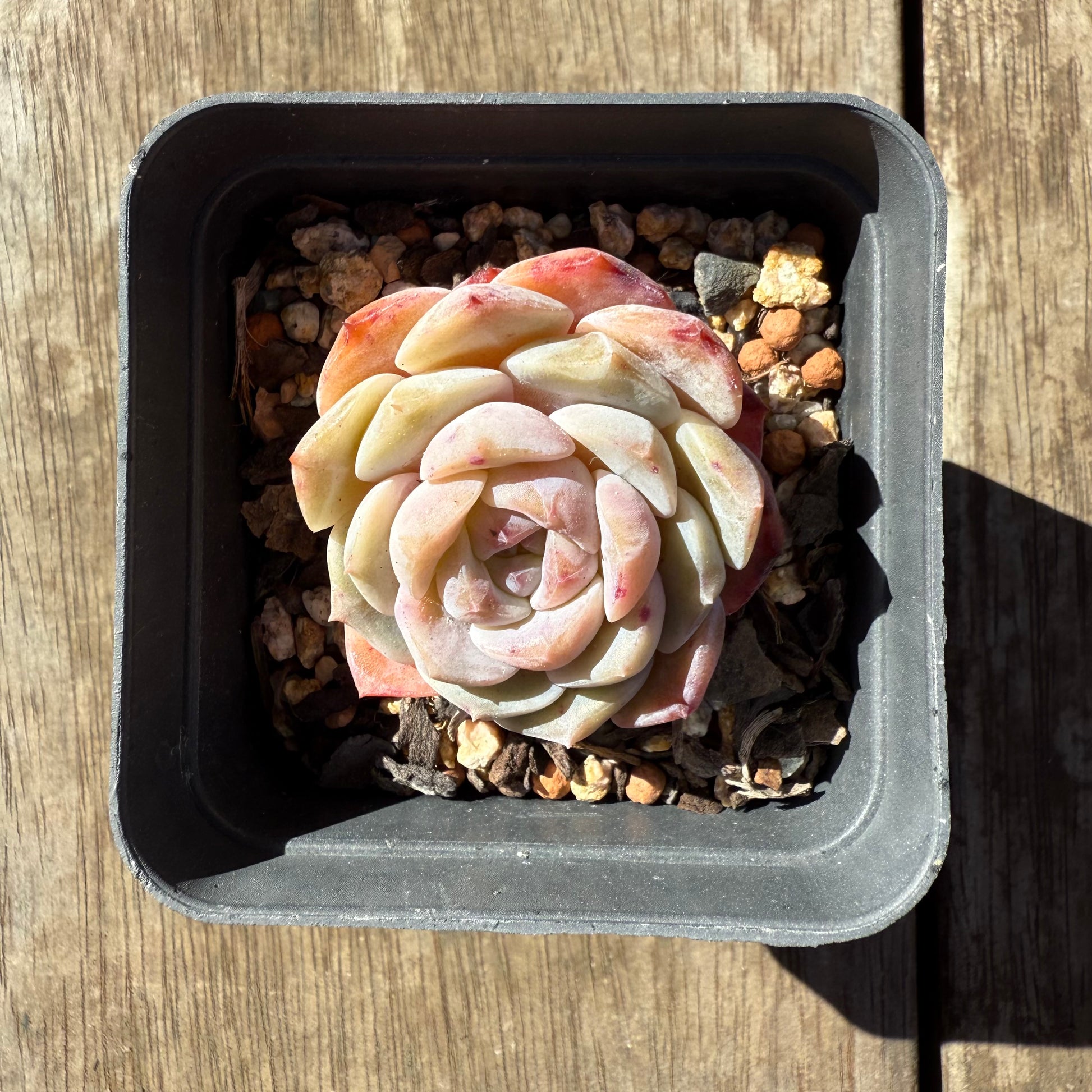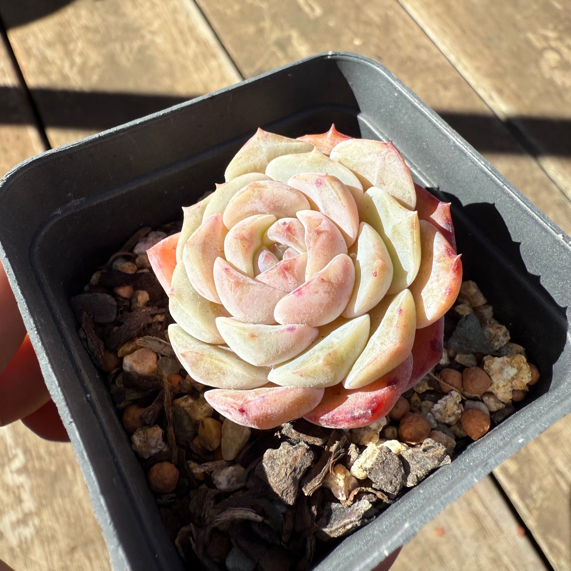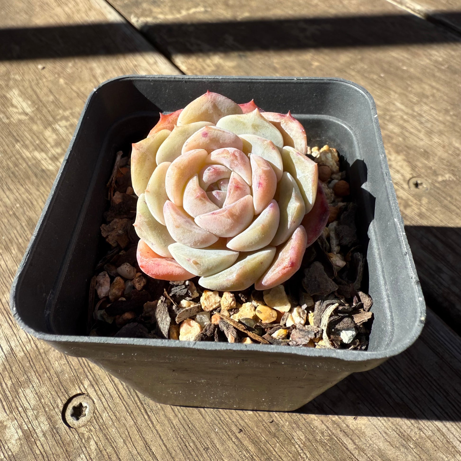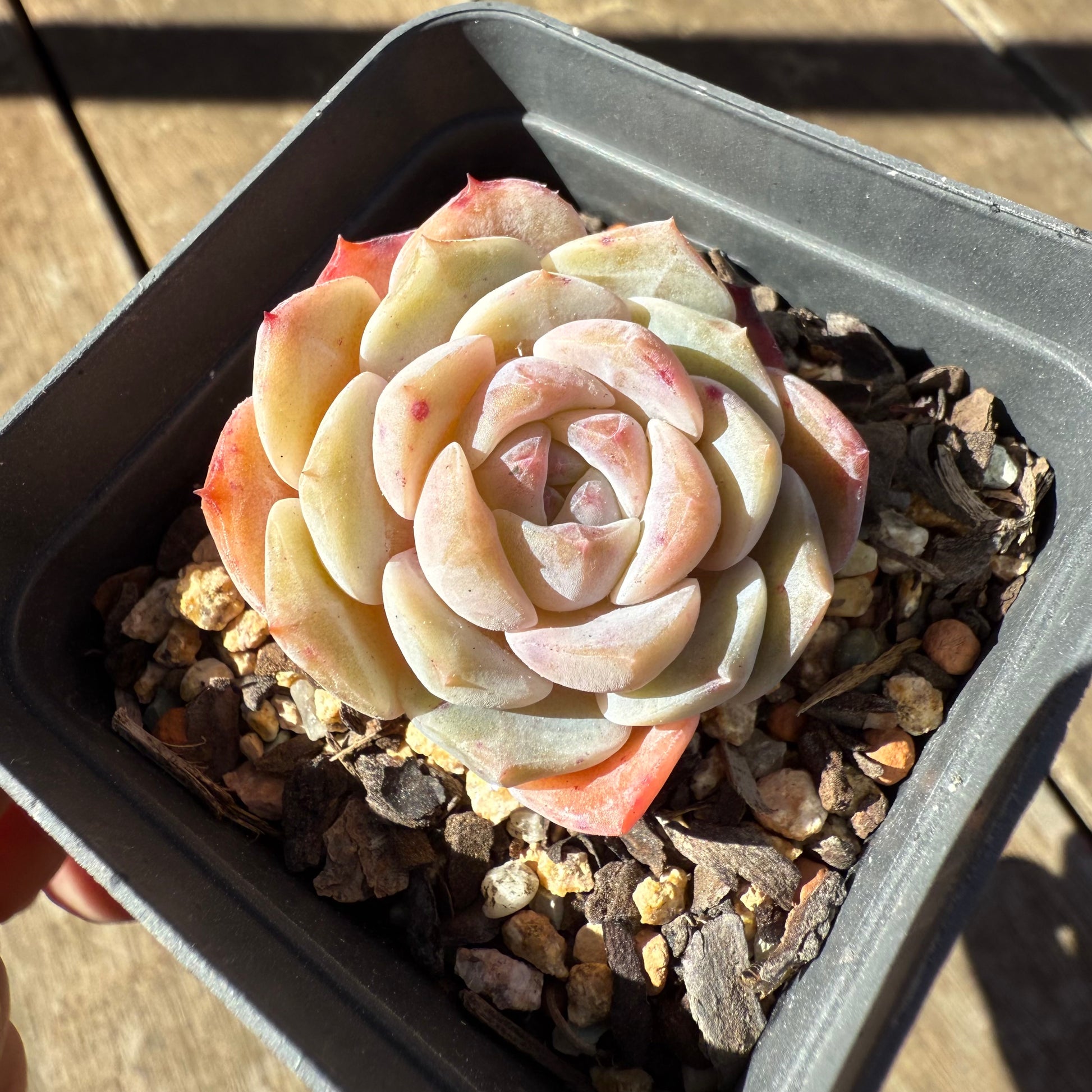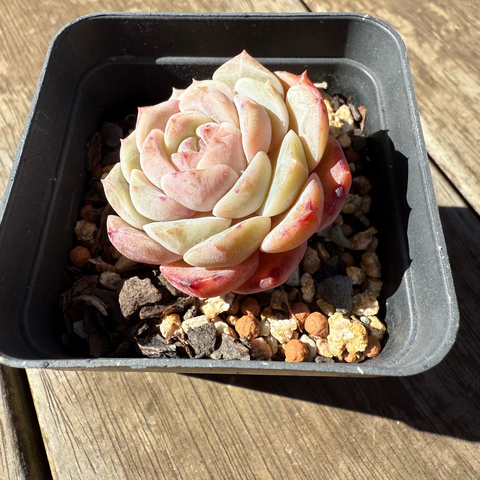 Echeveria 'Pink Diamond' has chubby leaves that will stress to pink/orange. Prefers full sun.