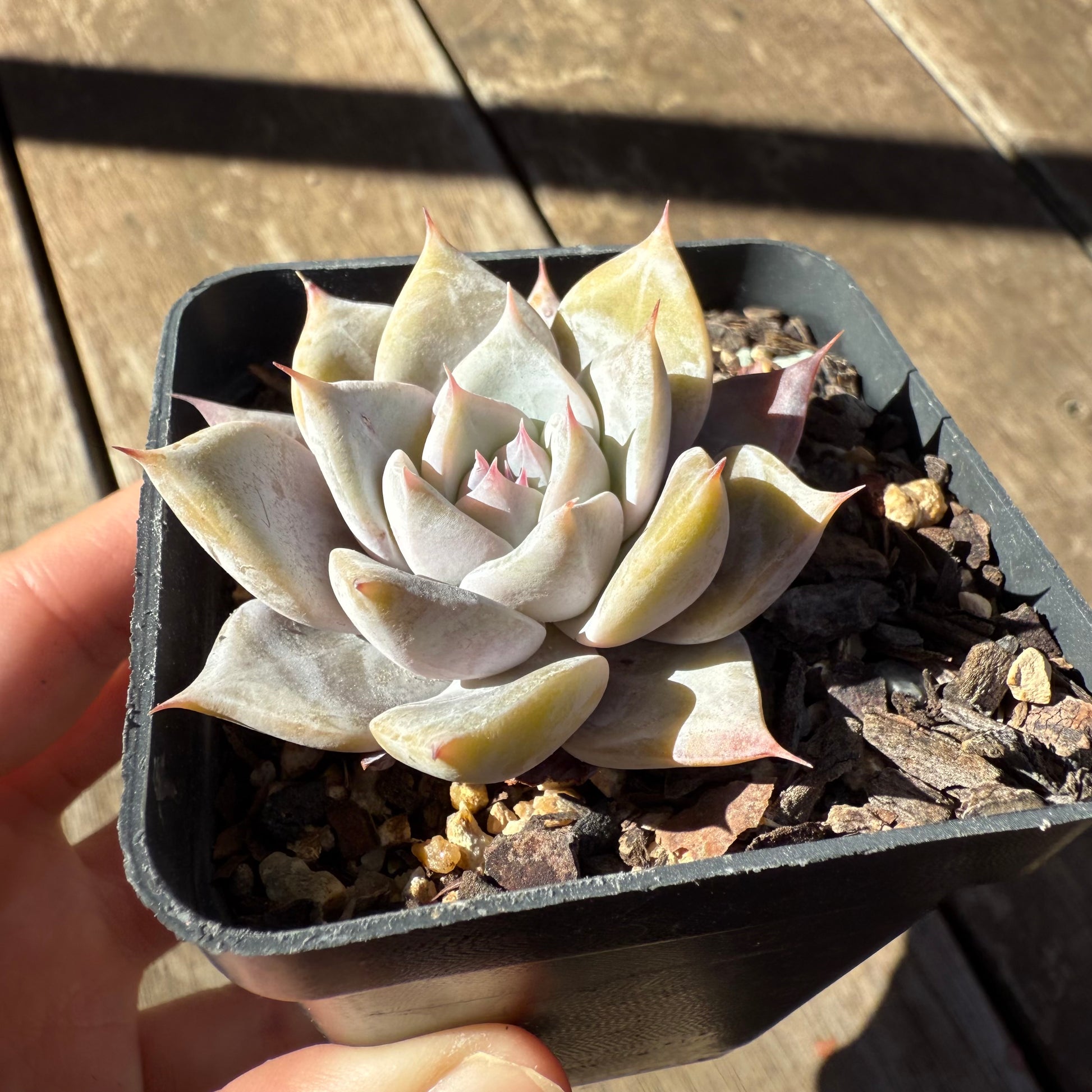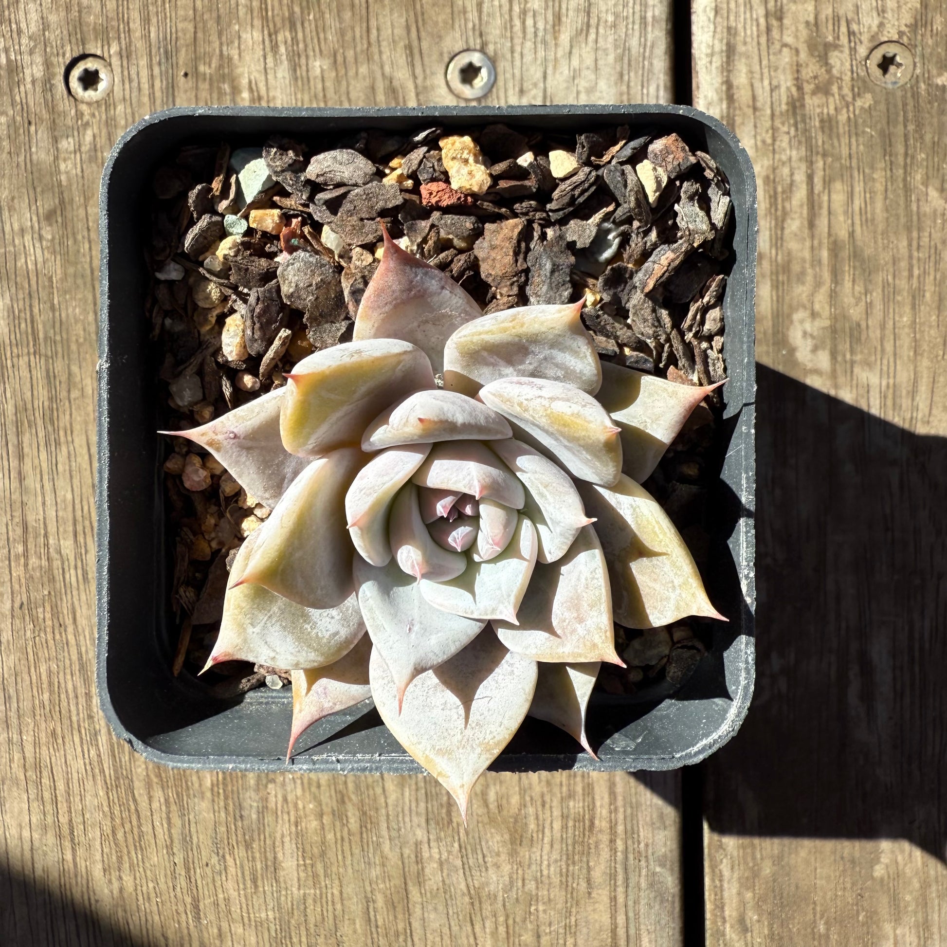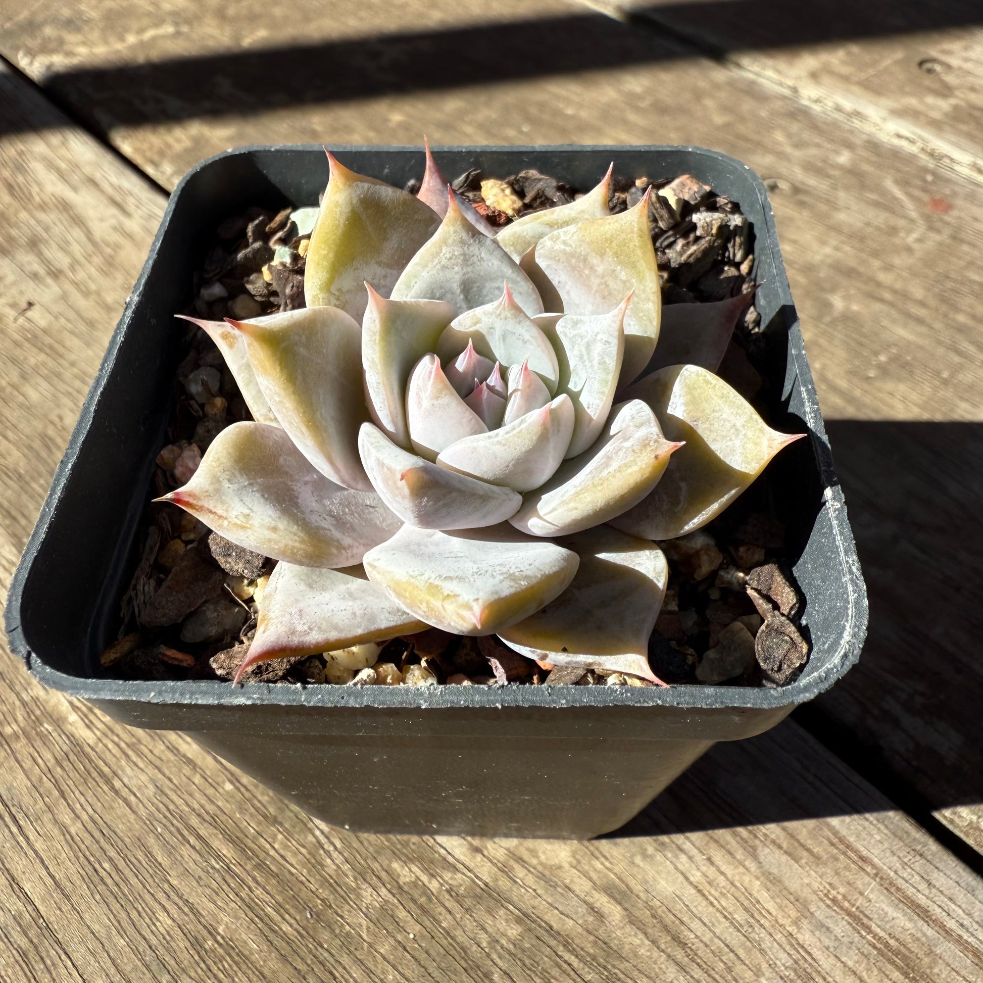 Echeveria 'Snowflake' has thick powder on its leaves. Forms white markings when grown hard. Prefers full/partial sun.