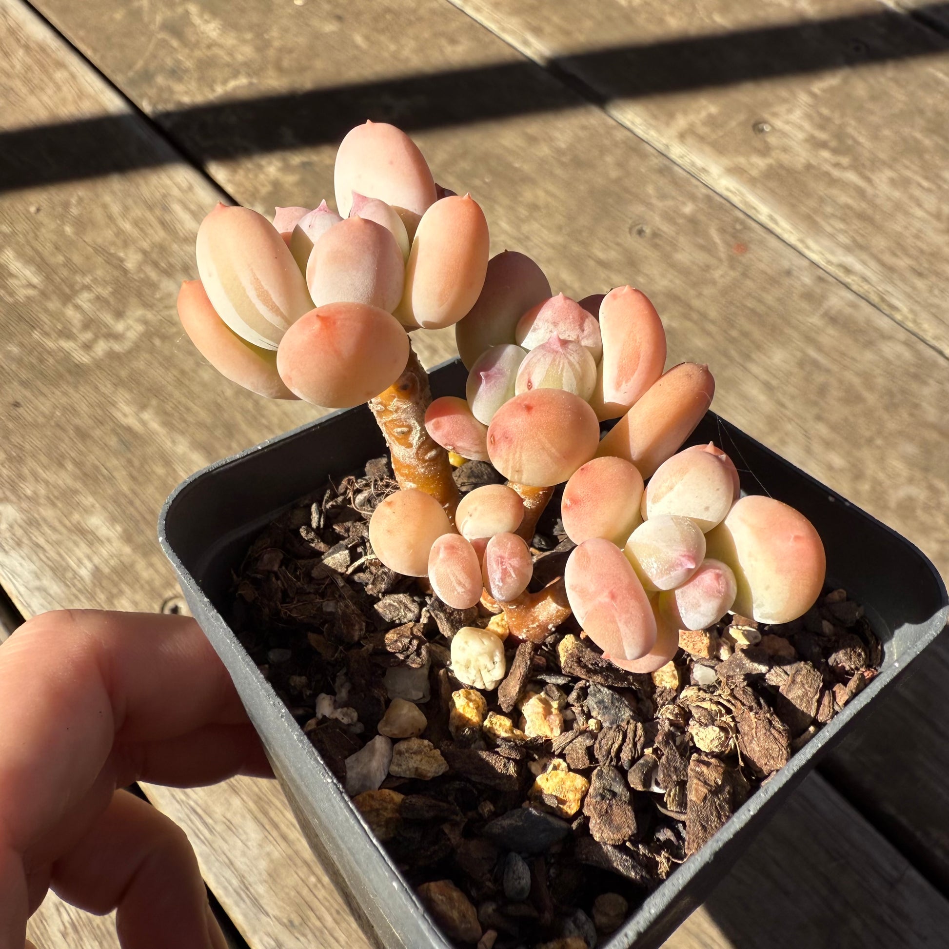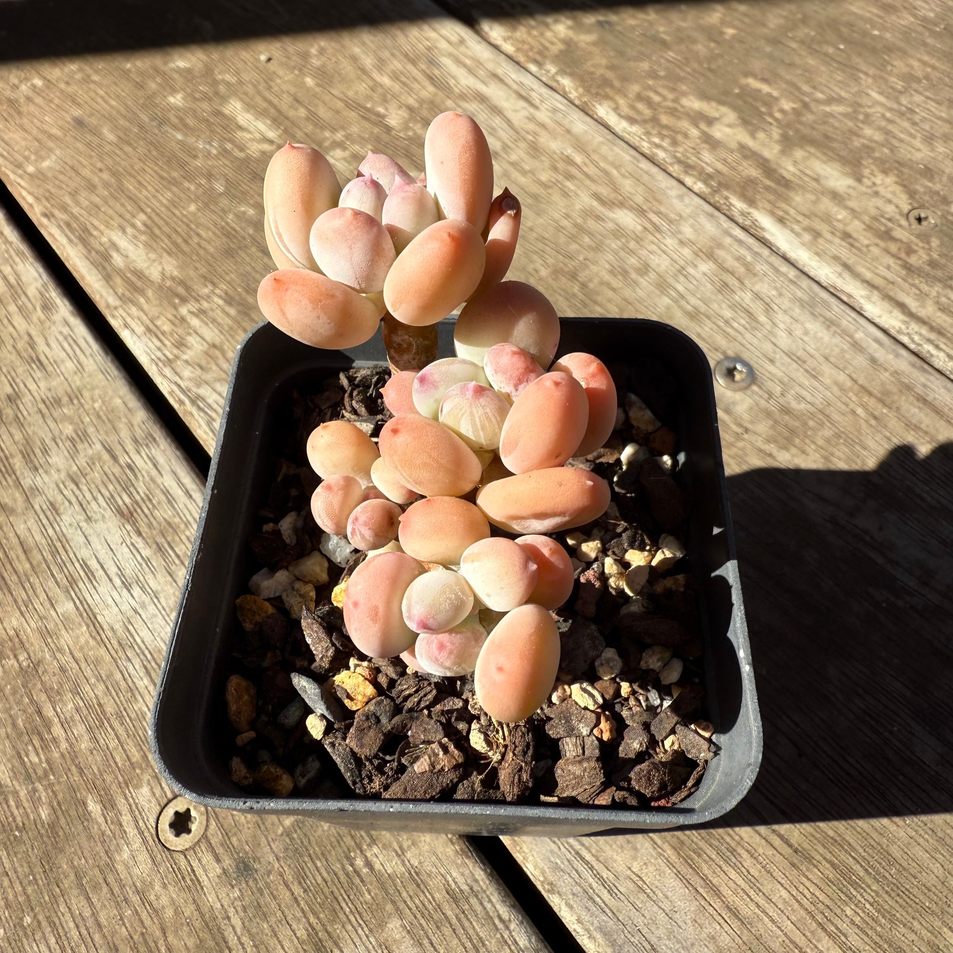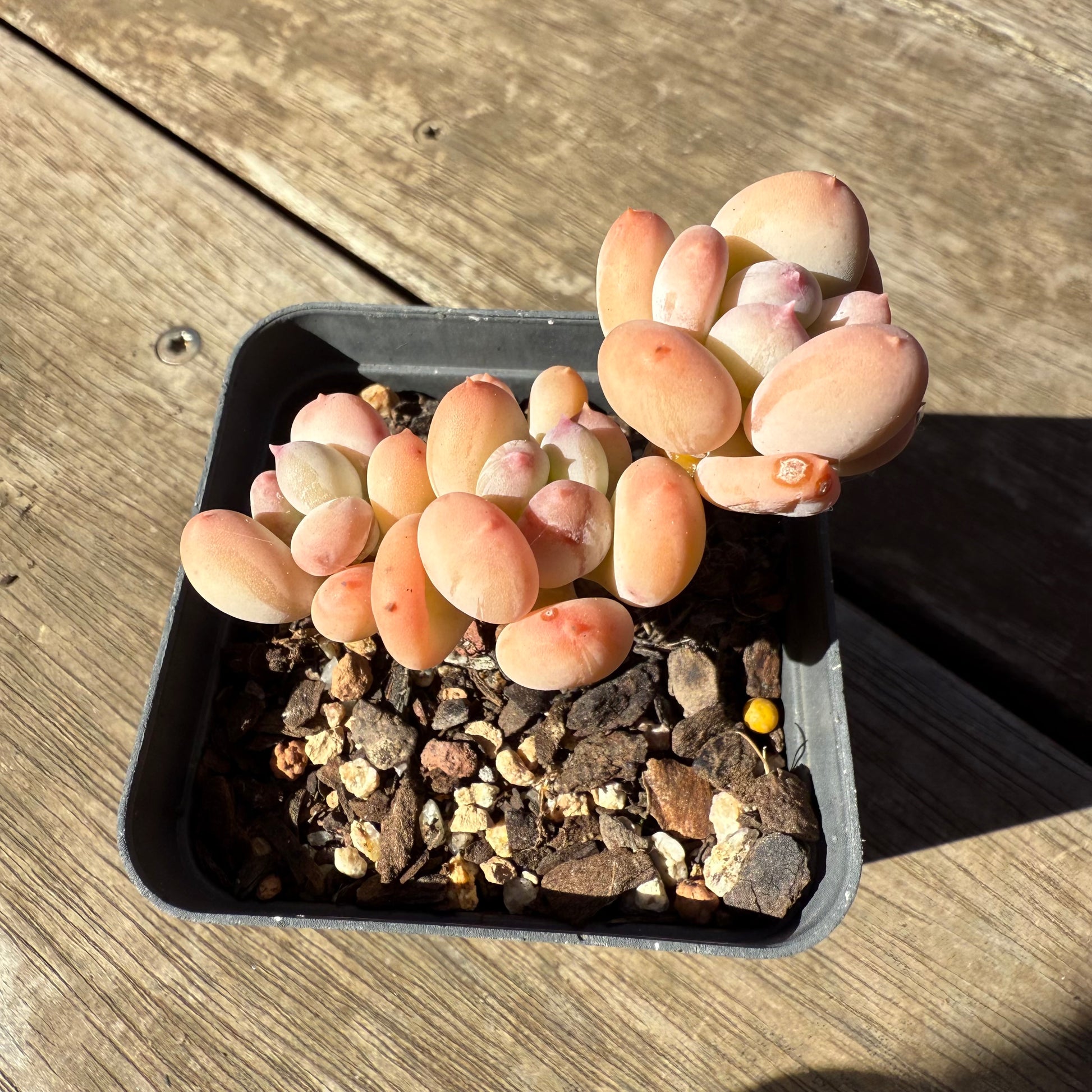 Pachyphytum Oviferum Mikadukibijin has powdery oval shaped leaves, with a pointy pink tip. Stressed to pale yellow/orange. Prefers full sun.